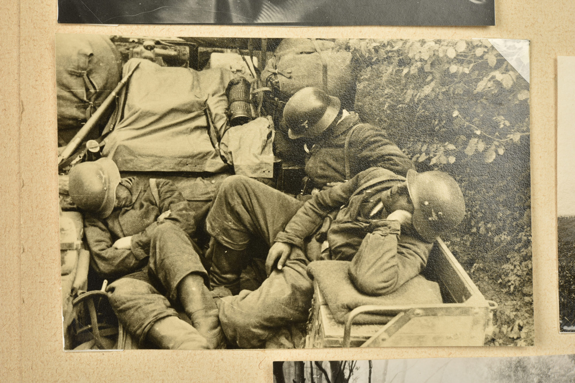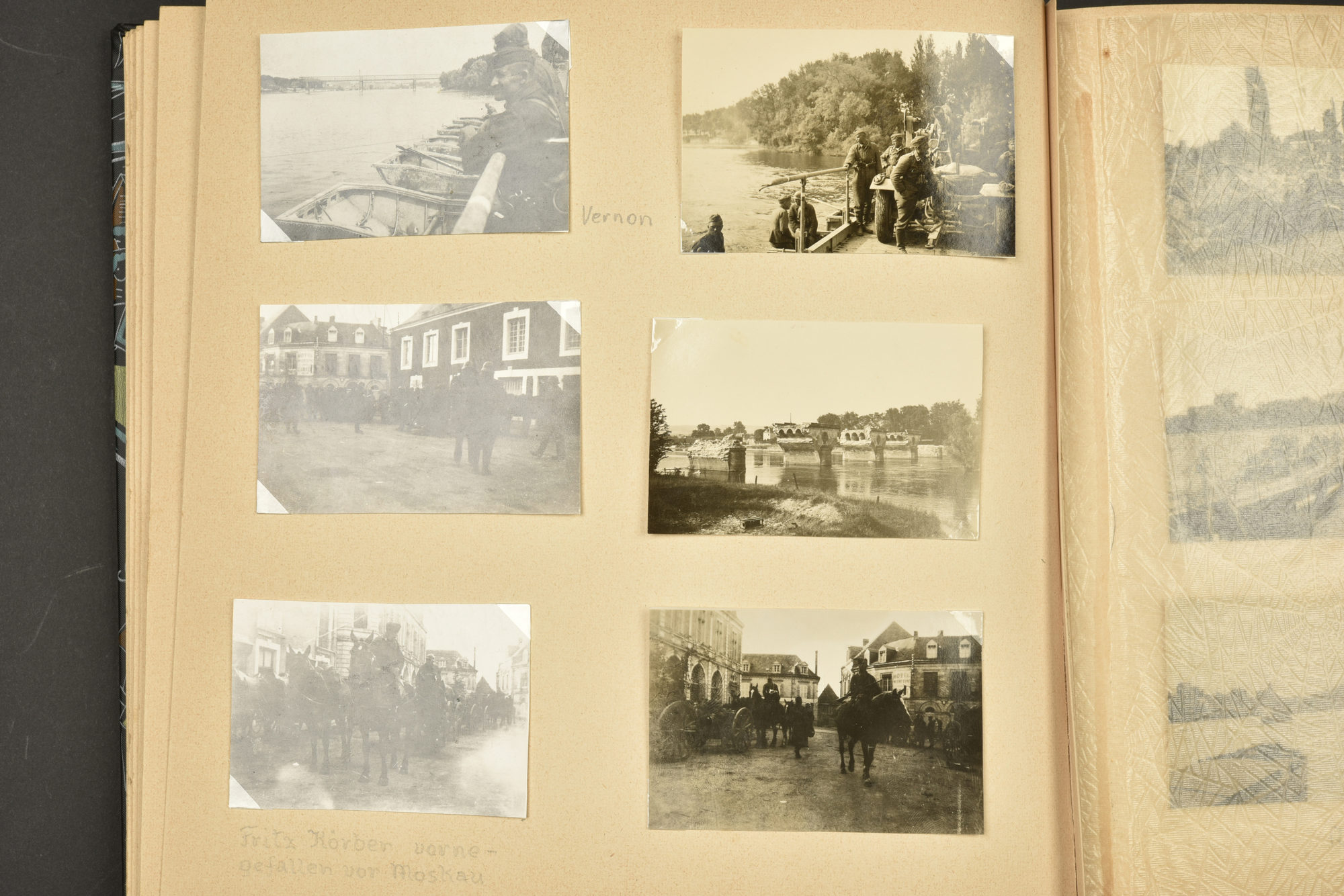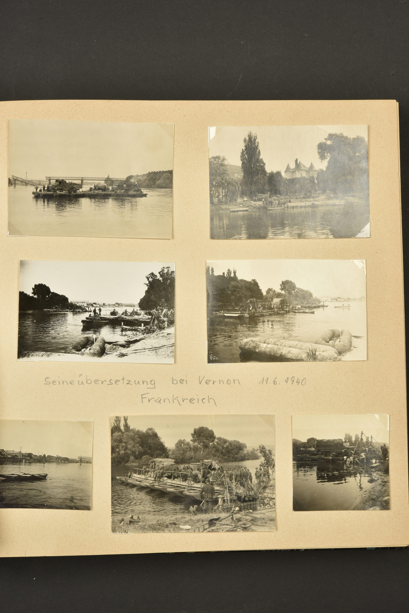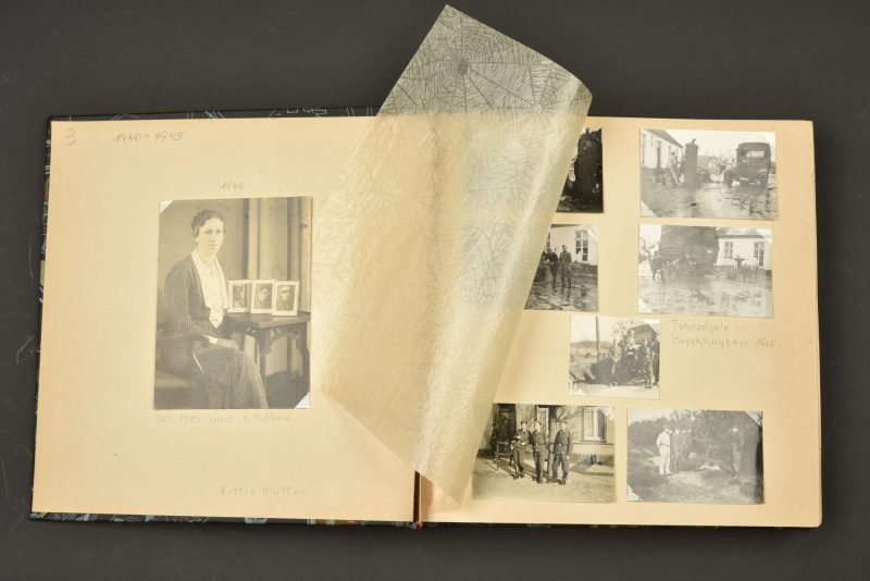 Album photos d’un Fahrer de la Luftwaffe Campagne de France et Russie. Ensemble d’un peu plus de 300 photos collées dans un album postérieur, d’un conducteur de la Luftwaffe retraçant son parcours militaire durant sa formation, la Campagne de France et le Front de l’Est, ainsi que quelques photos de vacance, permissions et famille. On notera de nombreuses photos des Flandres françaises et du secteur de la Lys, poche de Dunkerque, franchissement de la Seine à Vernon, puis Opération Barbarossa, puis Kursk. Des véhicules allemands, des véhicules alliés détruits ou capturés, des prisonniers anglais, tirailleurs sénégalais. Usure d’usage