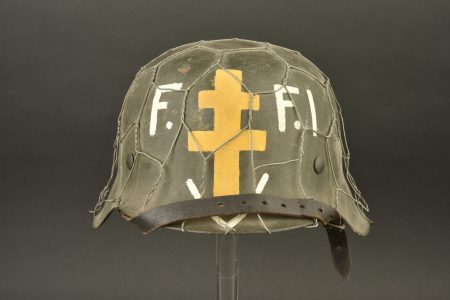 Casque allemand. Coque de casque M-42. Peinture Feldgrau à 80%. Insigne de la Heer original, à 60%. Insignes FFI et grillage postérieurs. Coiffe en cuir complète, cordon de serrage manquant.... en savoir plus