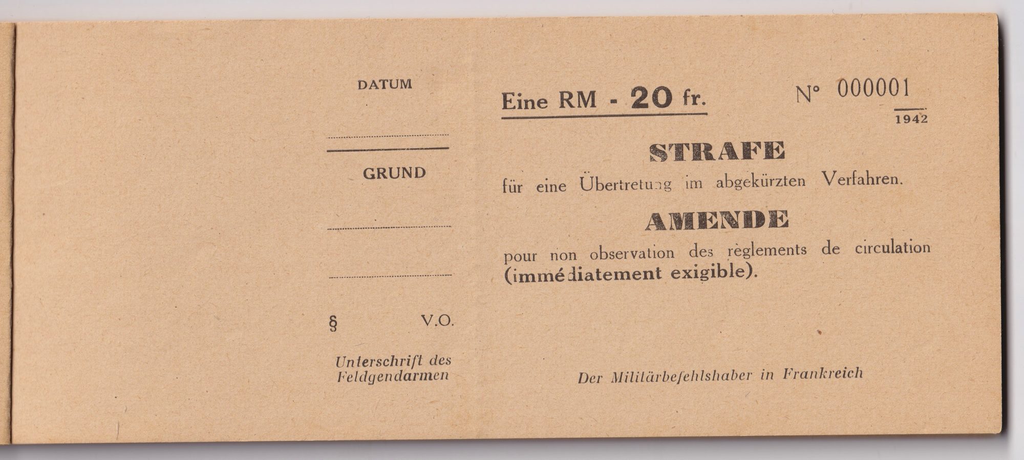 LOT DE DOCUMENTS (X5) SUR LE THÈME DE LA CIRCULATION AUTOMOBILE À PARIS. Très rare carnet à souche d’amendes pour infraction à la circulation de la Police allemande, complet, daté de 1942.... en savoir plus