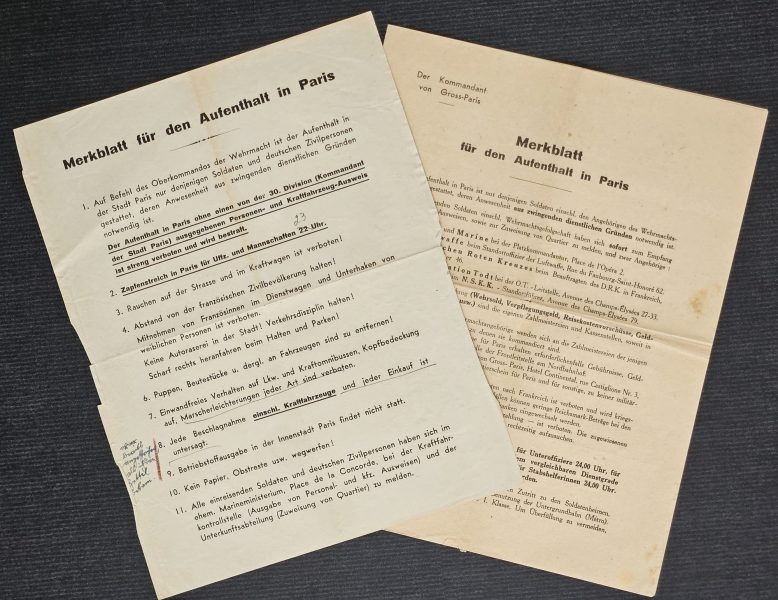 LOT DE FICHES D’INFORMATIONS (MERKBLATT) (X2) DESTINÉES AU SOLDAT ALLEMAND POUR LEUR VISITE DE PARIS. La Kommandantur du Gross-Paris fait imprimer et distribué à chaque soldat passant par la... en savoir plus