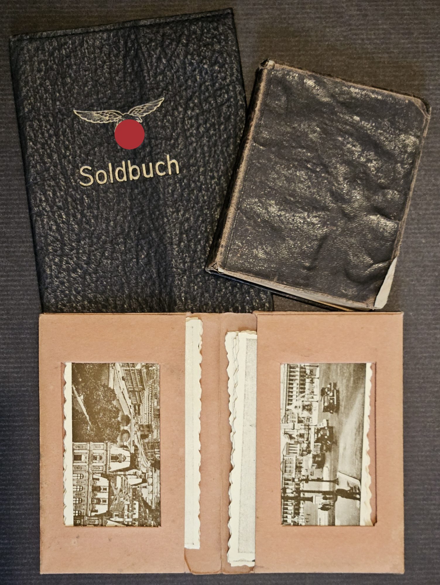 LOT DE SOUVENIRS (X3) PARISIENS D’UN SOLDAT. Protège Soldbuch en simili cuir d’un soldat de la Luftwaffe avec aigle doré sur la couverture. Dim. 11 X 16 cm. Petit calepin,agenda des... en savoir plus
