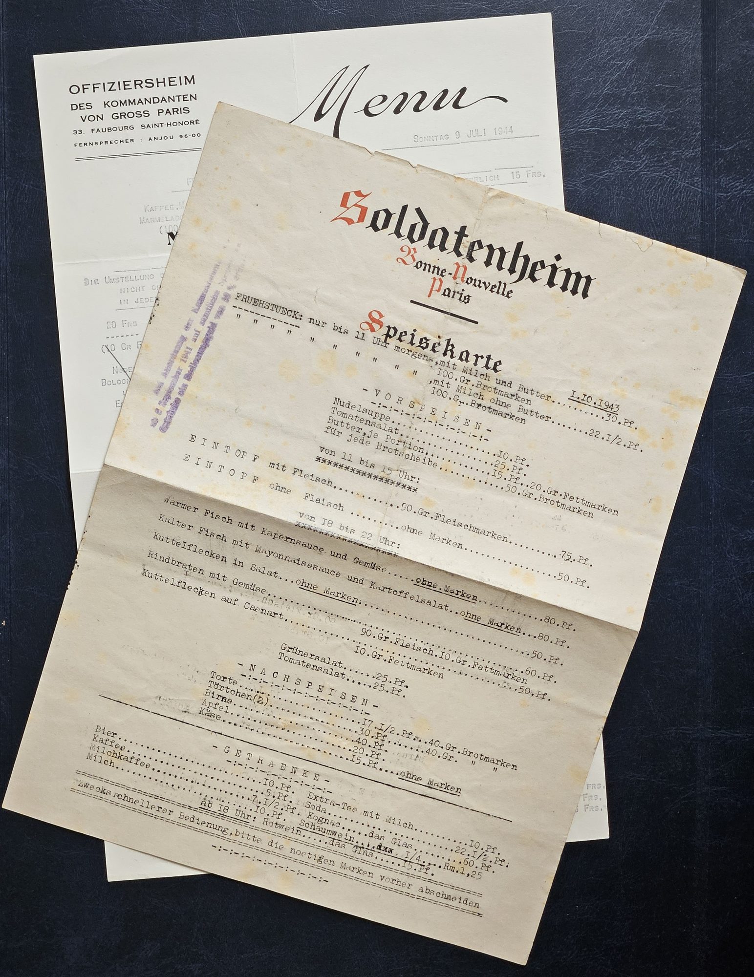 MENUS ALLEMANDS. Soldatenheim ,BONNE NOUVELLE, , PARIS, 14-08-1943. ALL. , Dim. 24 X 32 cm , État A. Offizierheim des Kommandant von Gross-Paris , SAINT-HONORÉ, , PARIS, 08-01-1943. ALL. , Dim.... en savoir plus