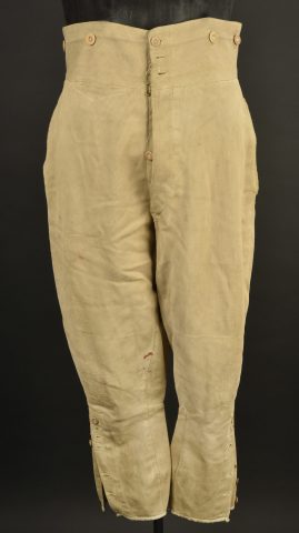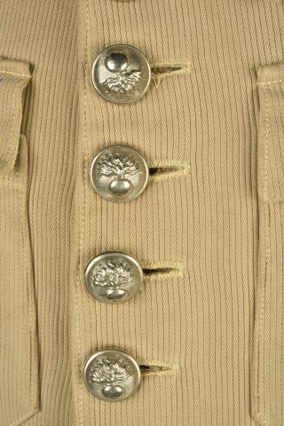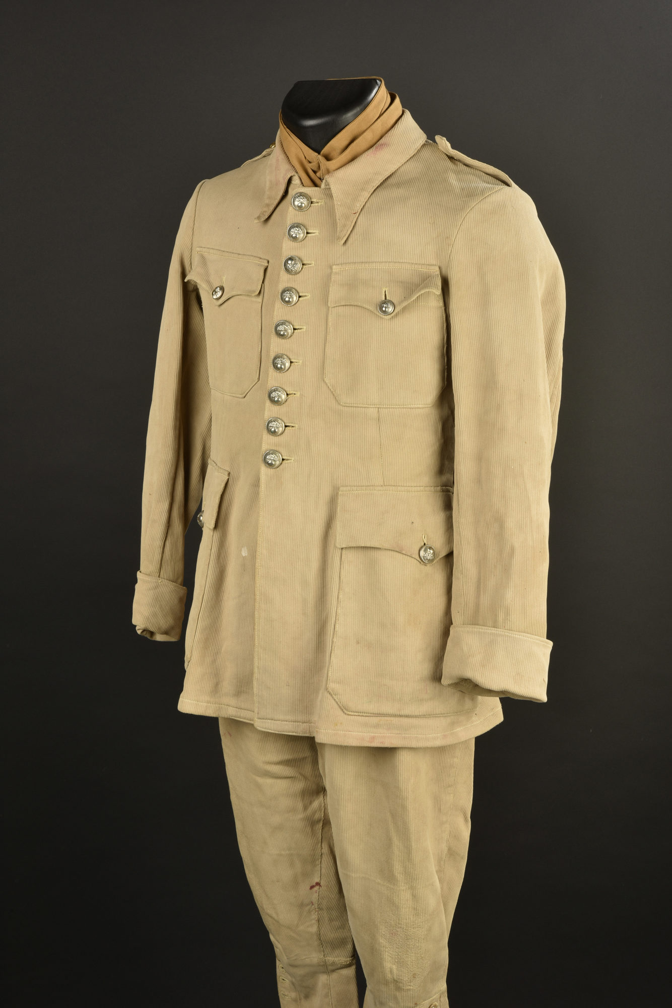 Tenue de gendarme. Comprenant une vareuse en velours côtelé, col aiglon se fermant par neuf boutons, bas des manches raccourcies par un tailleurs, boutons changés au niveau des pattes... en savoir plus