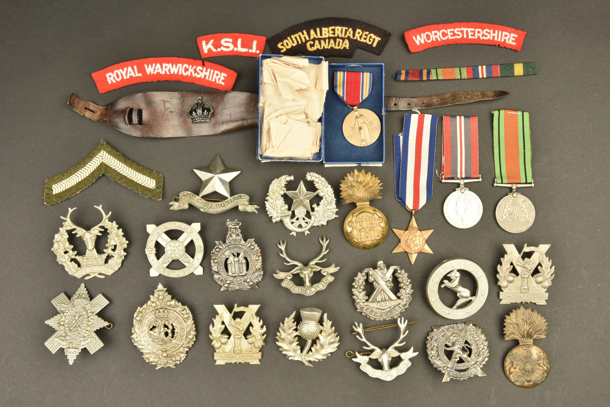 Insignes britannique. Comprenant un cap badge Aryll and Sutherland. Un grade de manche. Un Title Worcestershire, Un title Royal Warwickshire. Un title South Alberta Regt Canada. Un title KSLI. Un... en savoir plus
