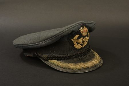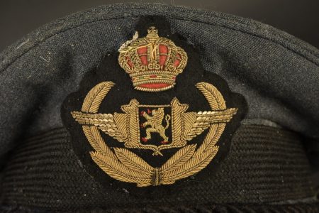 En tissu gris/bleu type RAF. Insigne en cannetille or. Fausse jugulaire en fil coton tressés noir. Visière en cuir, disposant d’une rangée de feuille de chêne or. Bandeau de transpiration en cuir. Intérieur doublé d’un tissu imperméable complet. Fabrication Emmel Bruxelles. A noter une certaine usure et patine de la pièce, ainsi que de nombreux trous de mite. Etat II+