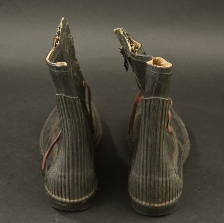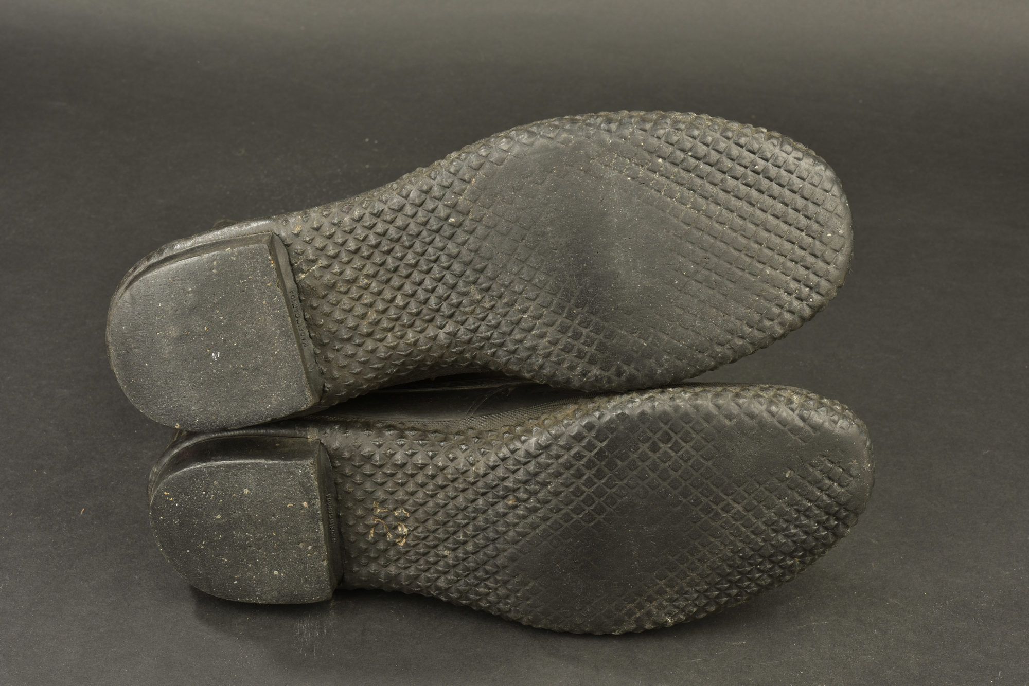 Shoe pack canadienne. En caoutchouc noir. Cinq œillets de laçage. Les lacets sont présents. Deux crochets de fermetures. Les marquages sous le semelles sont illisibles. Marquages sur les... en savoir plus