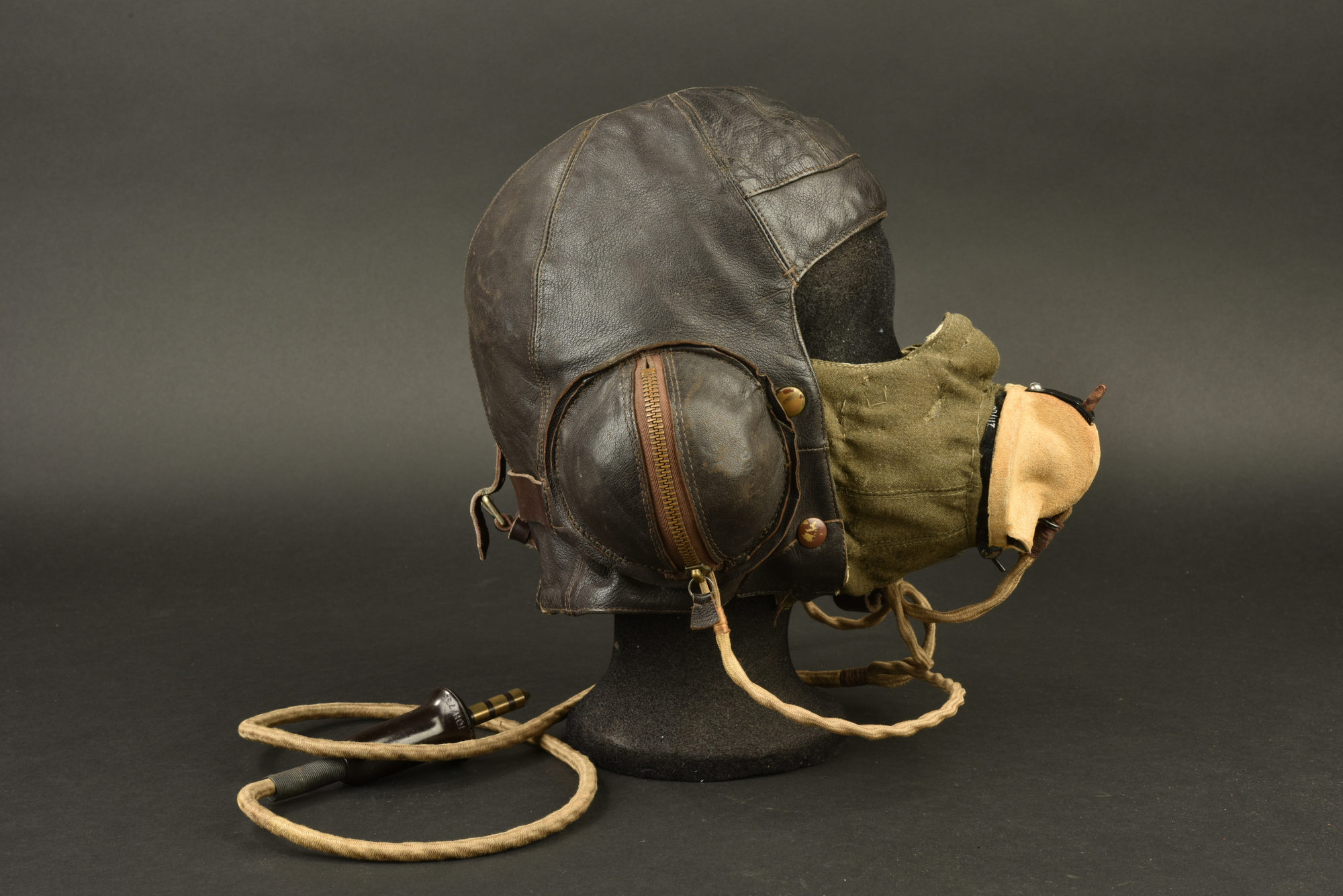 Bonnet de vol type B et masque à oxygène type D. Bonnet en cuir marron très souple. Deux boutons pressions de chaque côté permettant la fixation du masque à oxygène. Jugulaire en cuir... en savoir plus