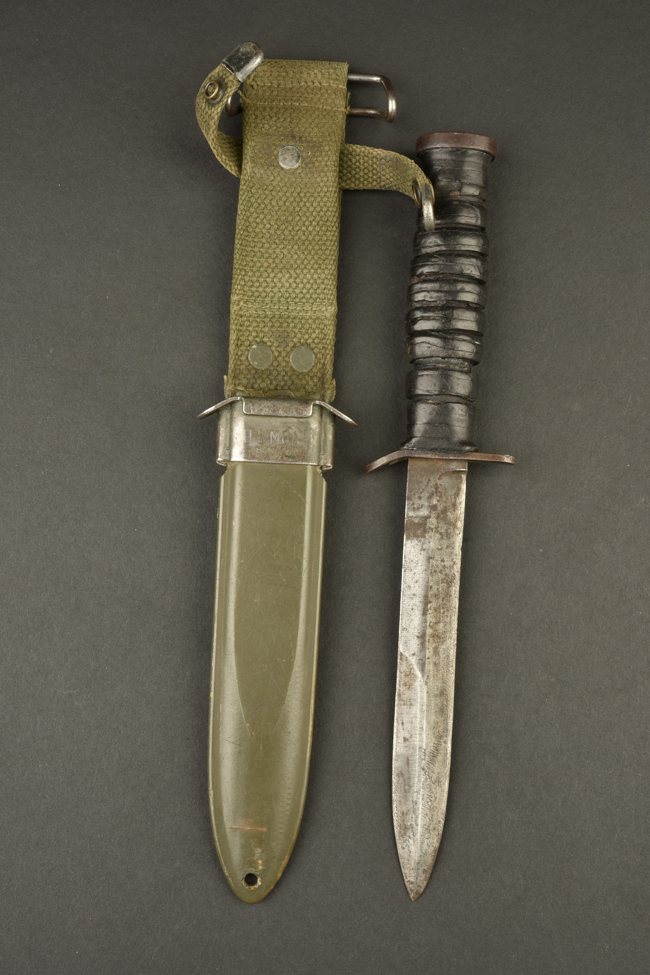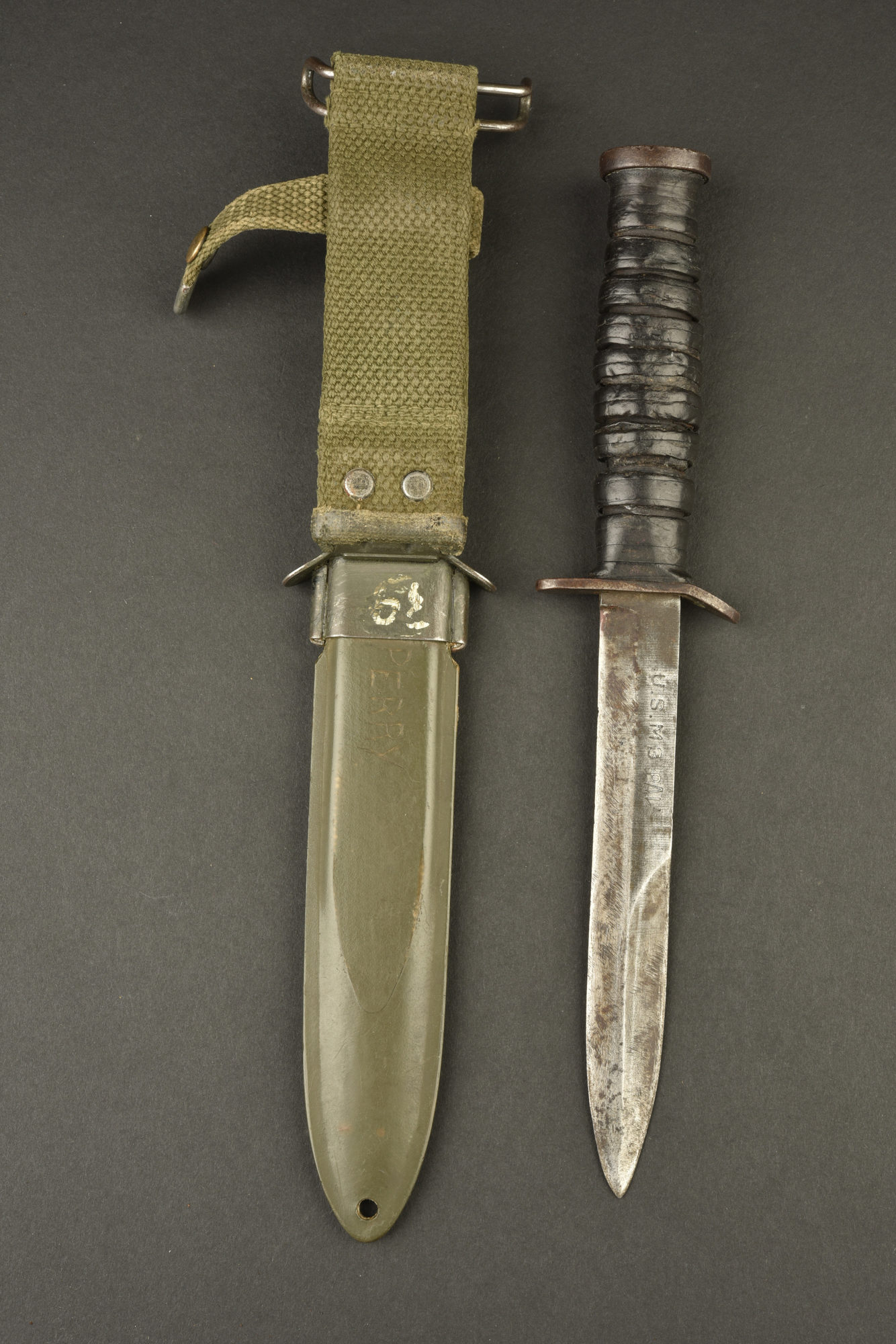 Couteau USM3. Poignée composée d’anneaux en cuir. Pommeau disposant de la grenade de l’intendance. Lame fortement usée et oxydée. Fabrication US M3 PAL. Fourreau US M8 A1 complet,... en savoir plus