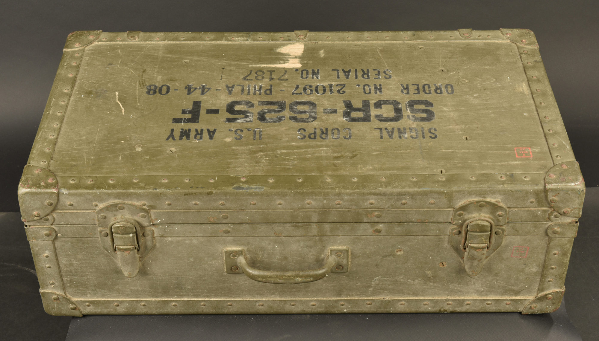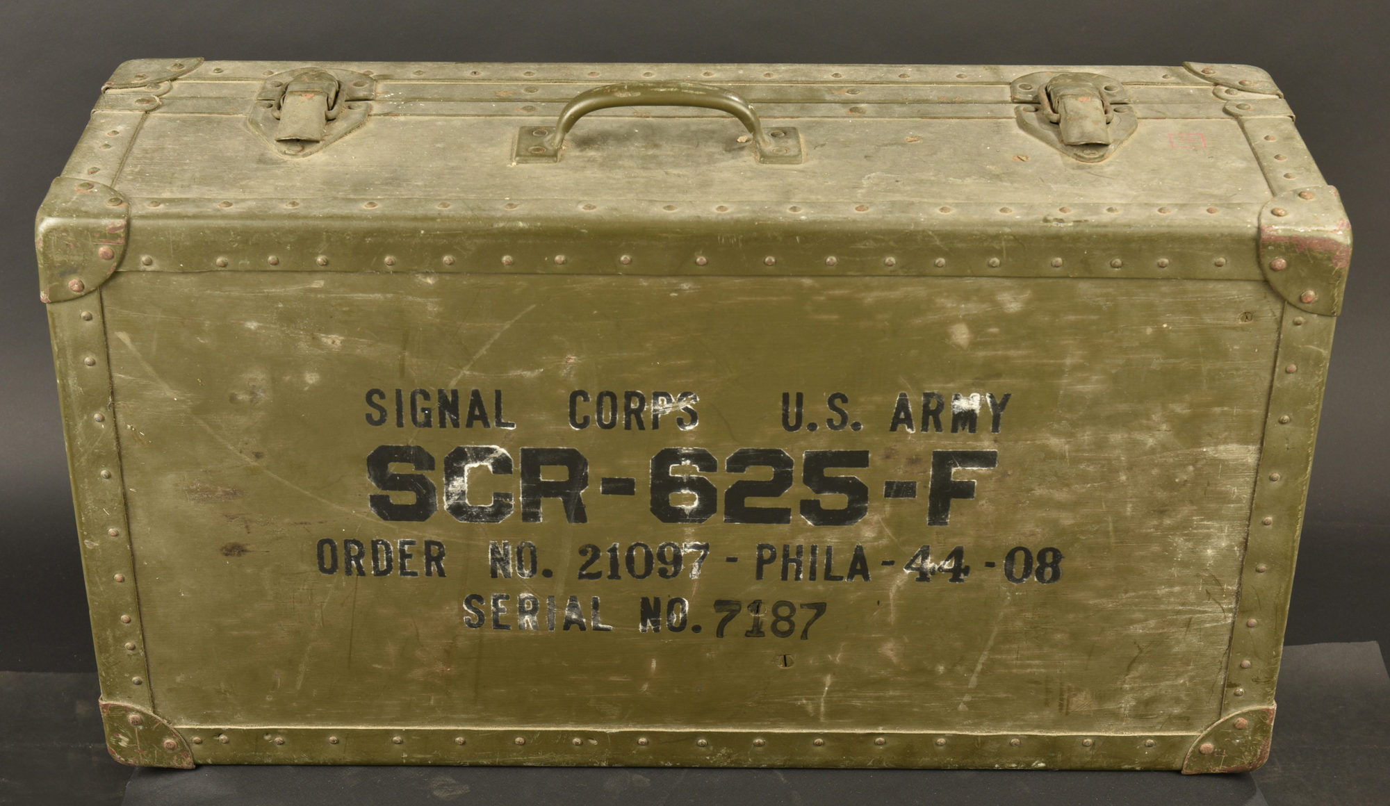 Détecteurs de mine US. Caisse en bois avec renfort en métal. La poignée de transport est présente. Marquages Signal Corps US Army SCR-625-F, Order No 21097 Phila 44-08 Serial No 7187.... en savoir plus