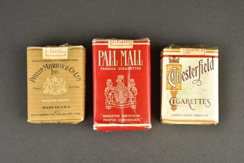 Paquets de cigarette US. Comprenant un paquet de cigarette Philipps Morris & Co Ltd, cellophane manquant. Un paquet de cigarette Pall Mall, cellophane manquant. Un paquet de cigarette... en savoir plus