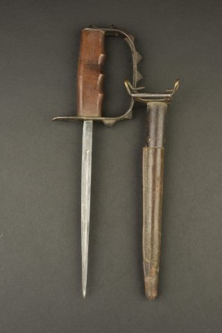 Trench kniffe. Poignée en bois. Garde en D muni de picots pyramidaux. Très belle lame triangulaire dans sa couleur d’origine à 80%. Fabrication US LF&C 1917. Fourreau en cuir et métal, le crochet de fixation au ceinturon est complet. Couleur kaki à 60%. Quelques bosses au niveau métallique. Les marquages du fourreau sont illisibles. A noter une certaine usure et patine de la pièce. Etat II+.