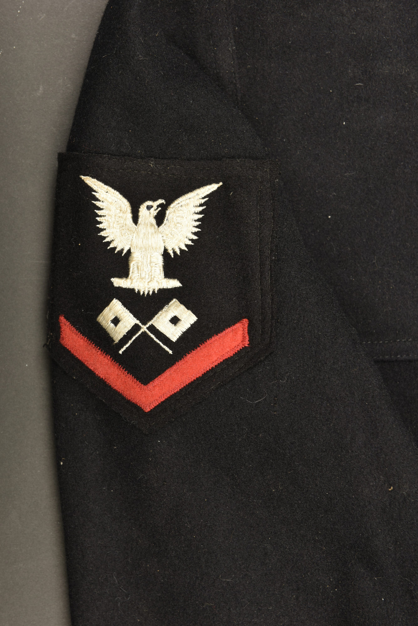 Uniforme US Navy. Comprenant un jumper en drap bleu marine. Etiquette du naval Clothing Factory vierge. Grade de manche de Quartier maître. Insigne de manche de PT Boat. Insigne de spécialité... en savoir plus