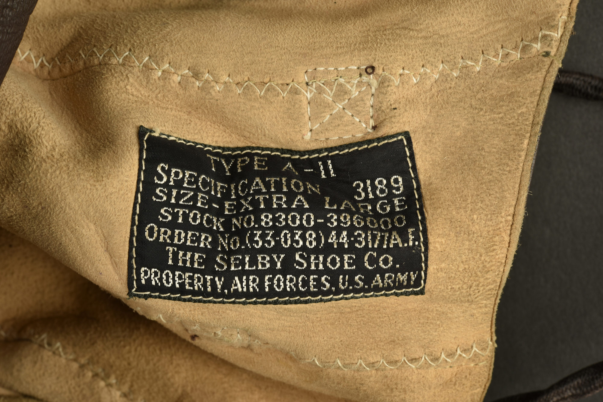 Bonnet de vol A-11. Modèle avec trois pression. En cuir marron, doublé de peau de chamois. Bonnette en caoutchouc noir. Jugulaire en cuir complète. Beau tampon de l’Army Air Force. Cuir... en savoir plus