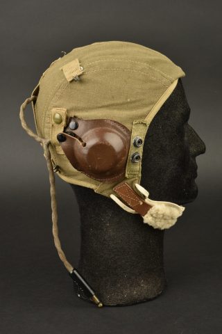 Bonnet de vol A-9. En toile kaki. Emplacement pour écouteurs radio recouvert d’une coque en cuir marron, doublure en fausse fourrure au niveau de l’emplacement des oreilles. Toutes... en savoir plus