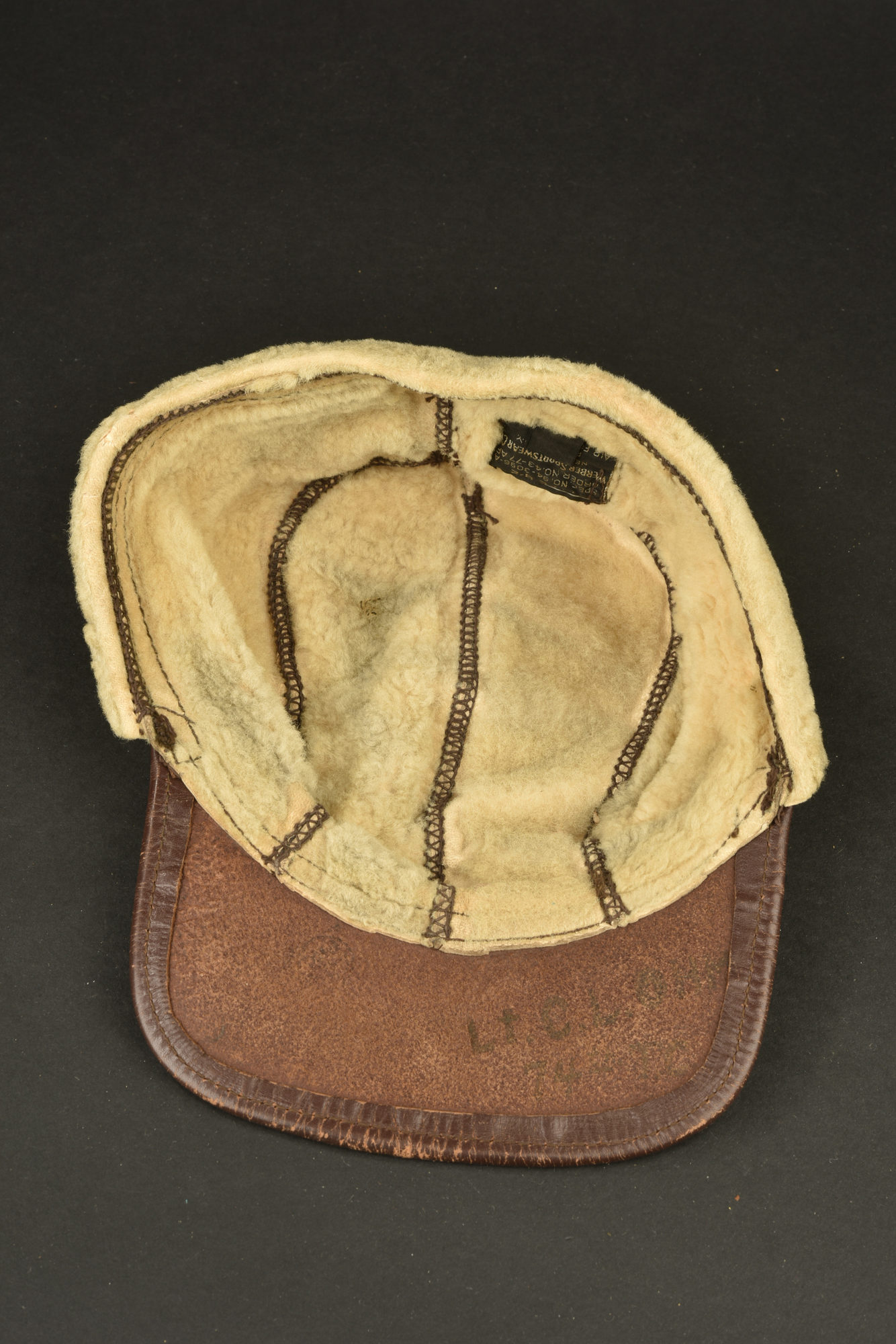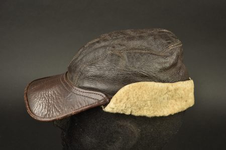 Casquette B-2. En cuir marron, doublé de fausse fourrure blanche. Visière en cuir marron souple. Marquages gravés sous la visière Lt CL OHM 743 TO. Etiquette marquée Type B-2 Spec NO... en savoir plus