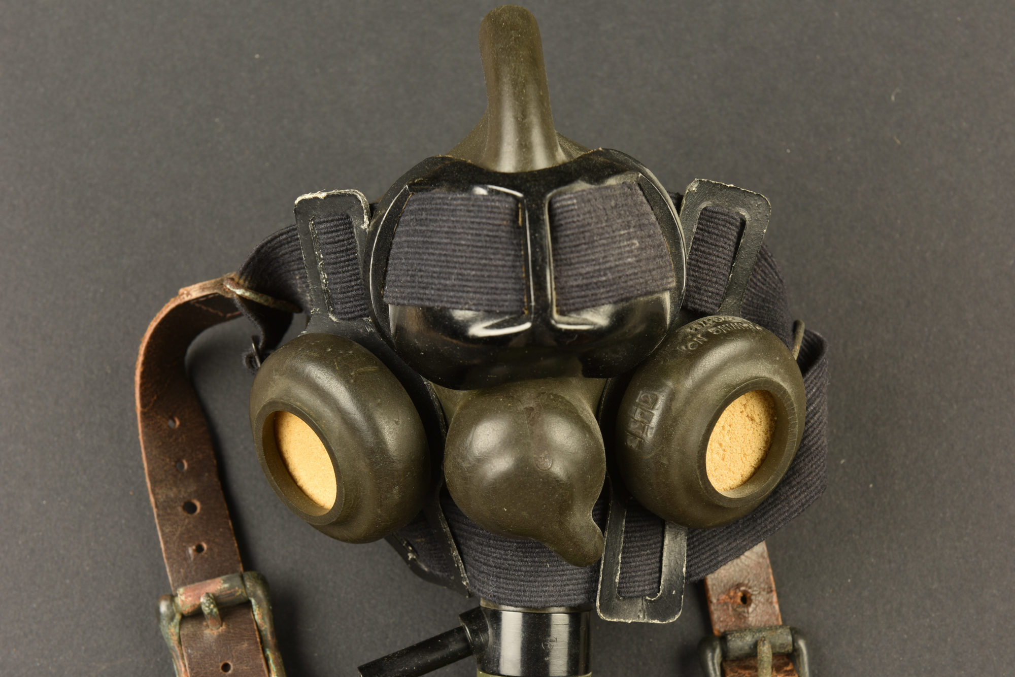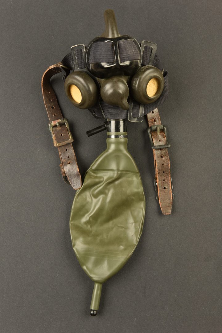 Masque à oxygène A8-B. En caoutchouc kaki, celui-ci est souple. Toutes les sangles sont présentes. Ballonnet complet. Sangles en cuir complètes, avec toutes les attaches métalliques.... en savoir plus
