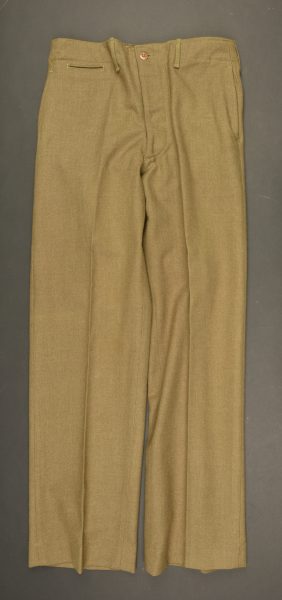 Pantalon moutarde. En drap OD. Tous les boutons sont présents. Bavette anti-gaz complète. Intérieur doublé en tissu coton blanc. Etiquette du fabricant 15117, daté du 19 janvier 1942, taille... en savoir plus