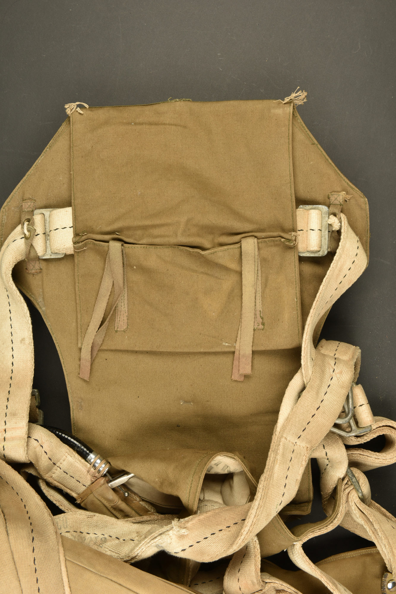 Parachute siège S1 avec son kit dorsal de survie. Harnais en forte toile blanche surpiquée de fil de couleur noir. Toutes les pièces métalliques sont présentes, les mousquetons sont... en savoir plus