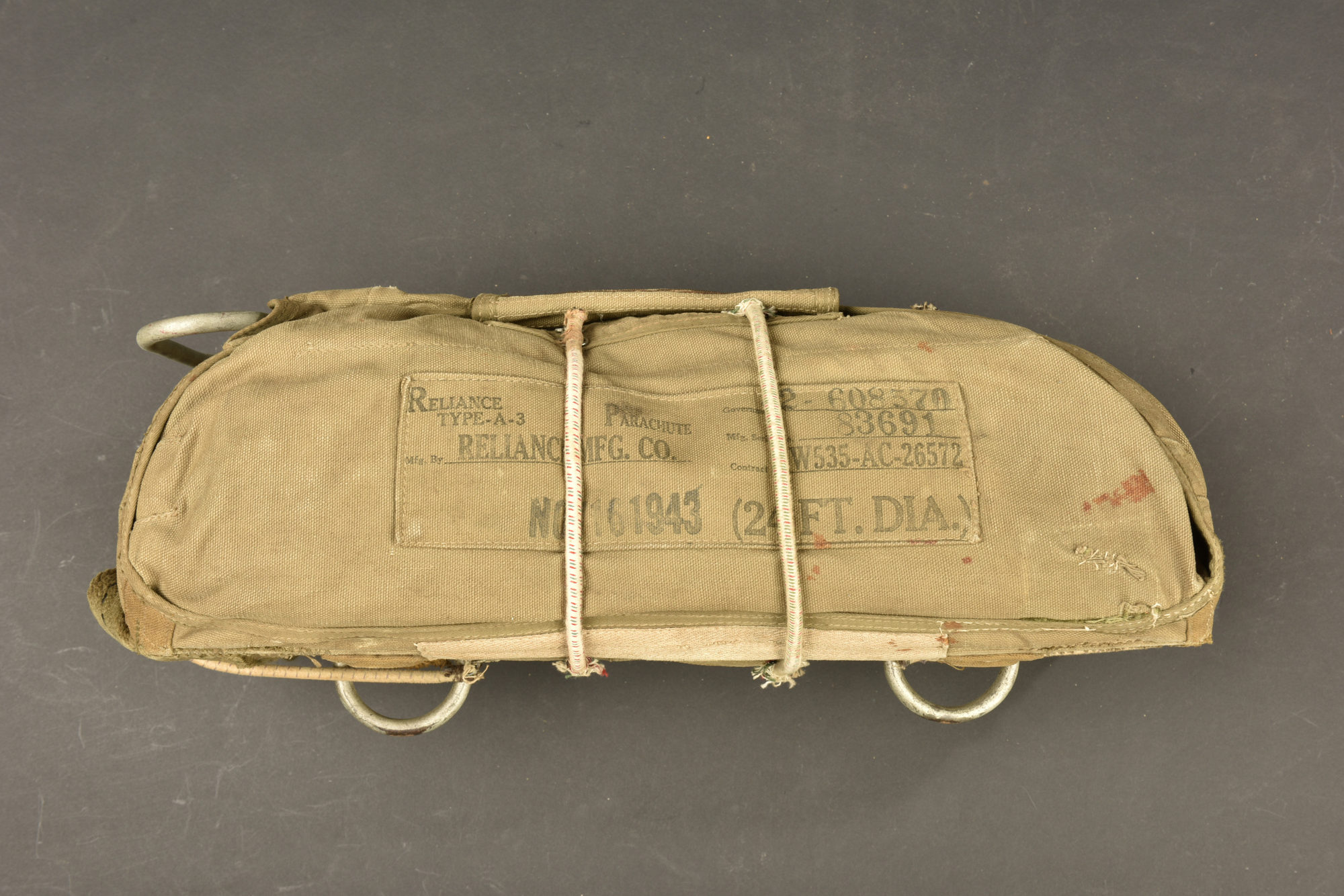 Parachute ventral A-3. Housse en forte toile OD. Tous les élastiques sont présents, ainsi que la poignée d’ouverture d’urgence. Voilure absente. Poignée en toile de transport. Deux... en savoir plus