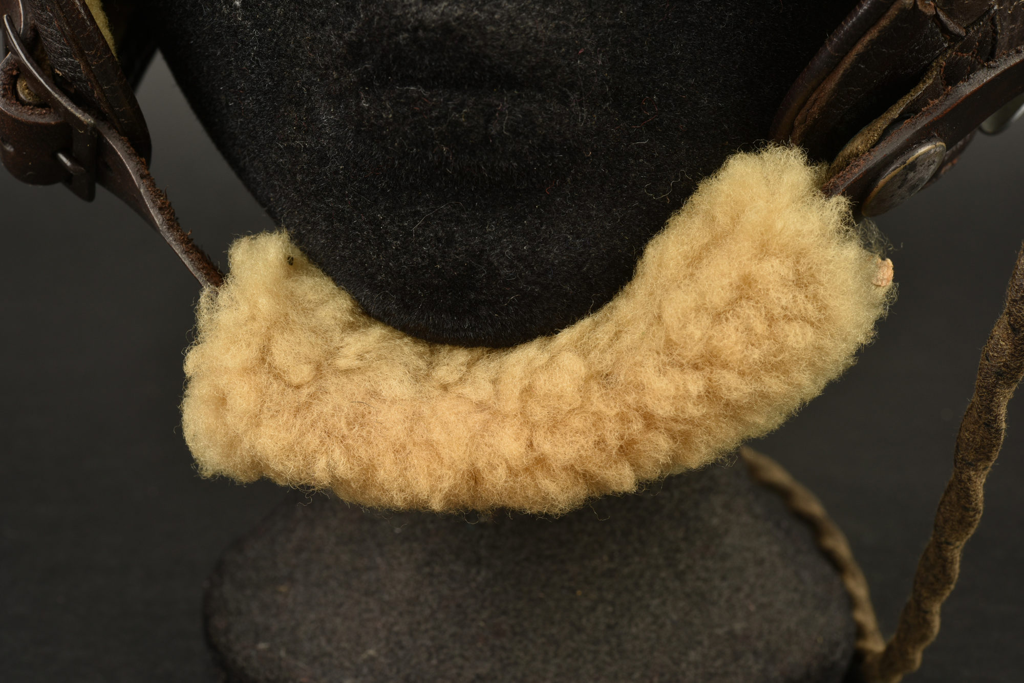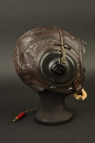 Rare bonnet de vol AN-H-16. En cuir marron. Intérieur doublé en fausse fourrure. Bonnettes en caoutchouc noir. Visière doublé d’une peau de chamois. Jugulaire en cuir doublée de fausse... en savoir plus