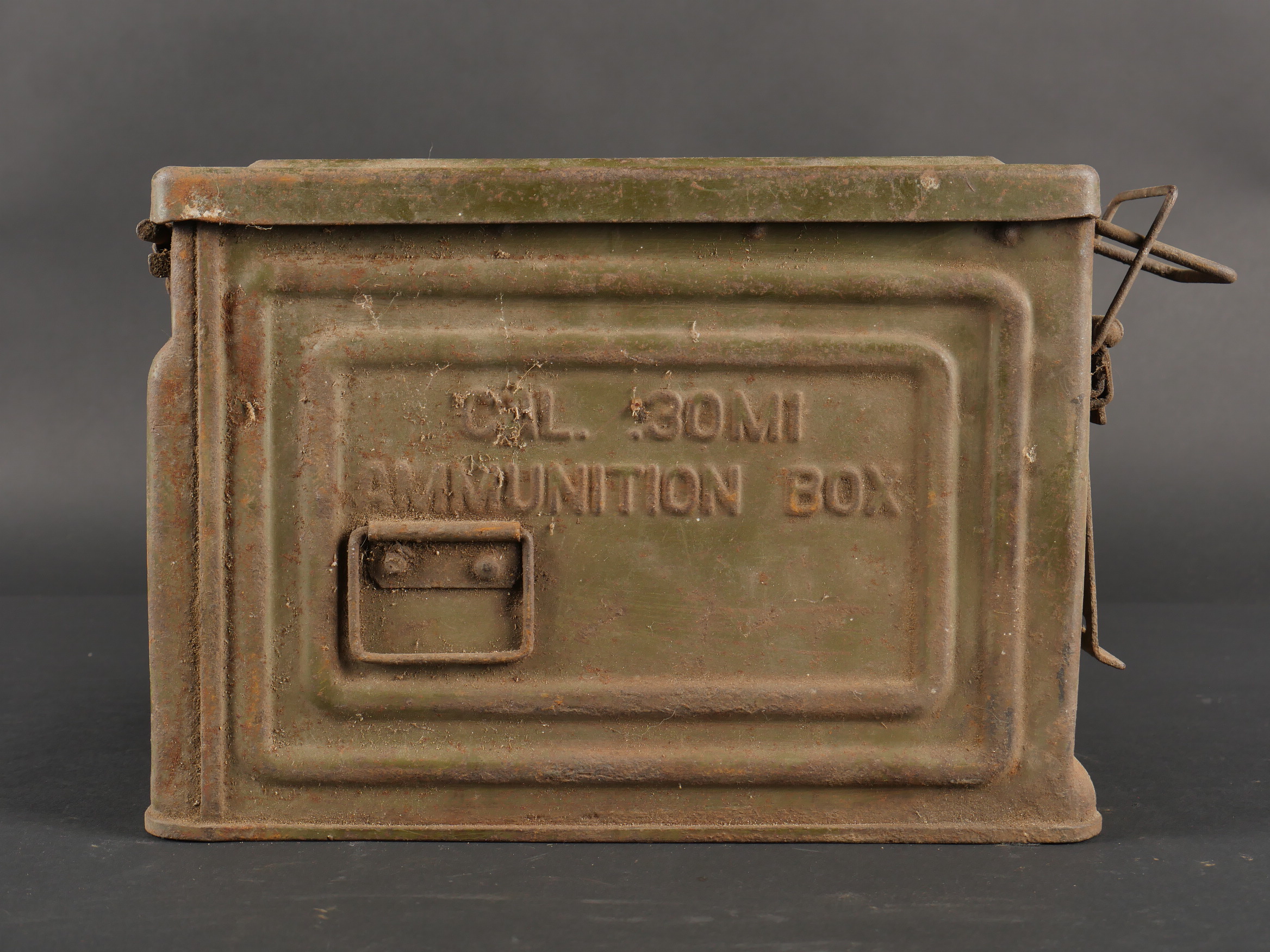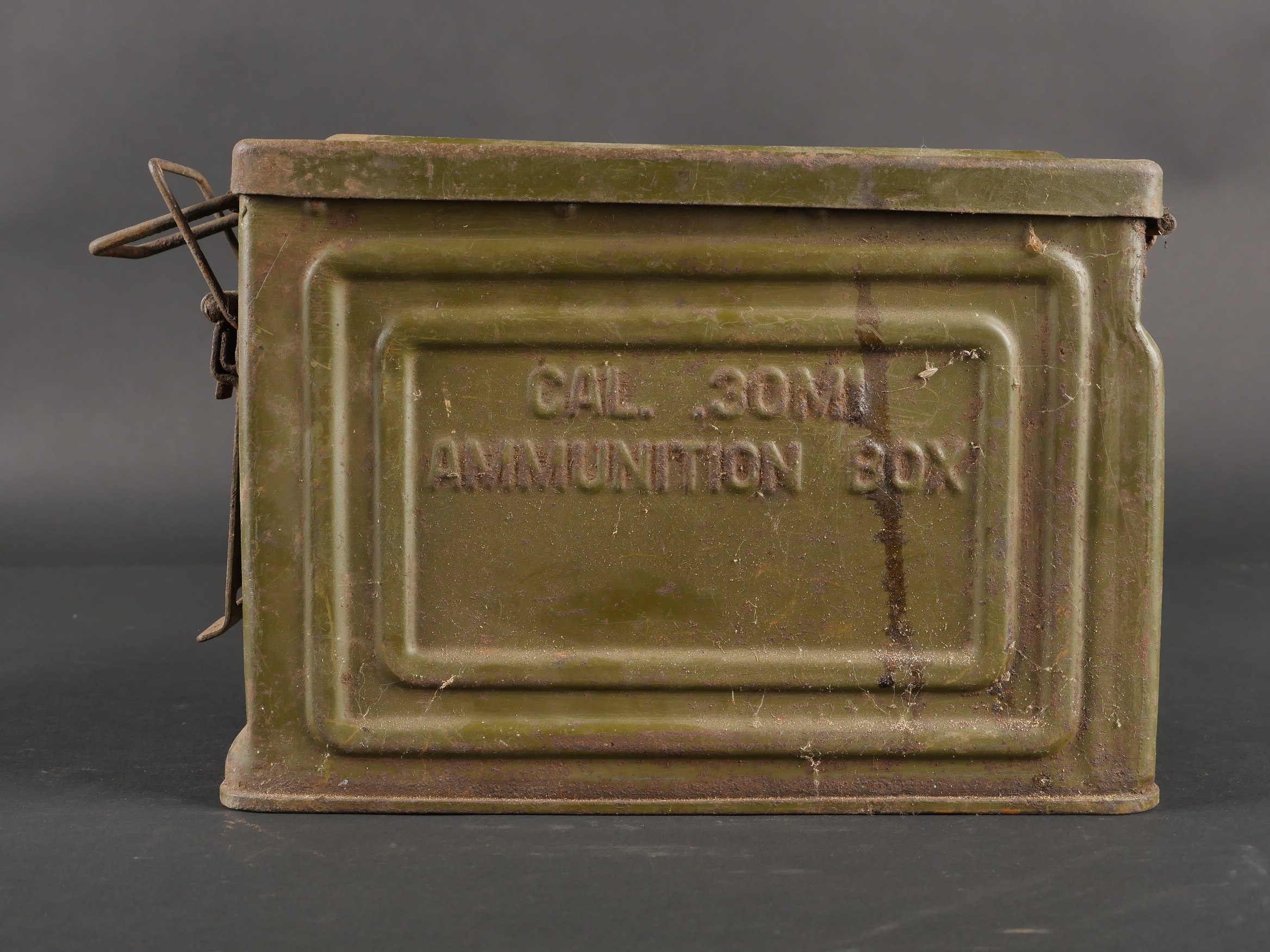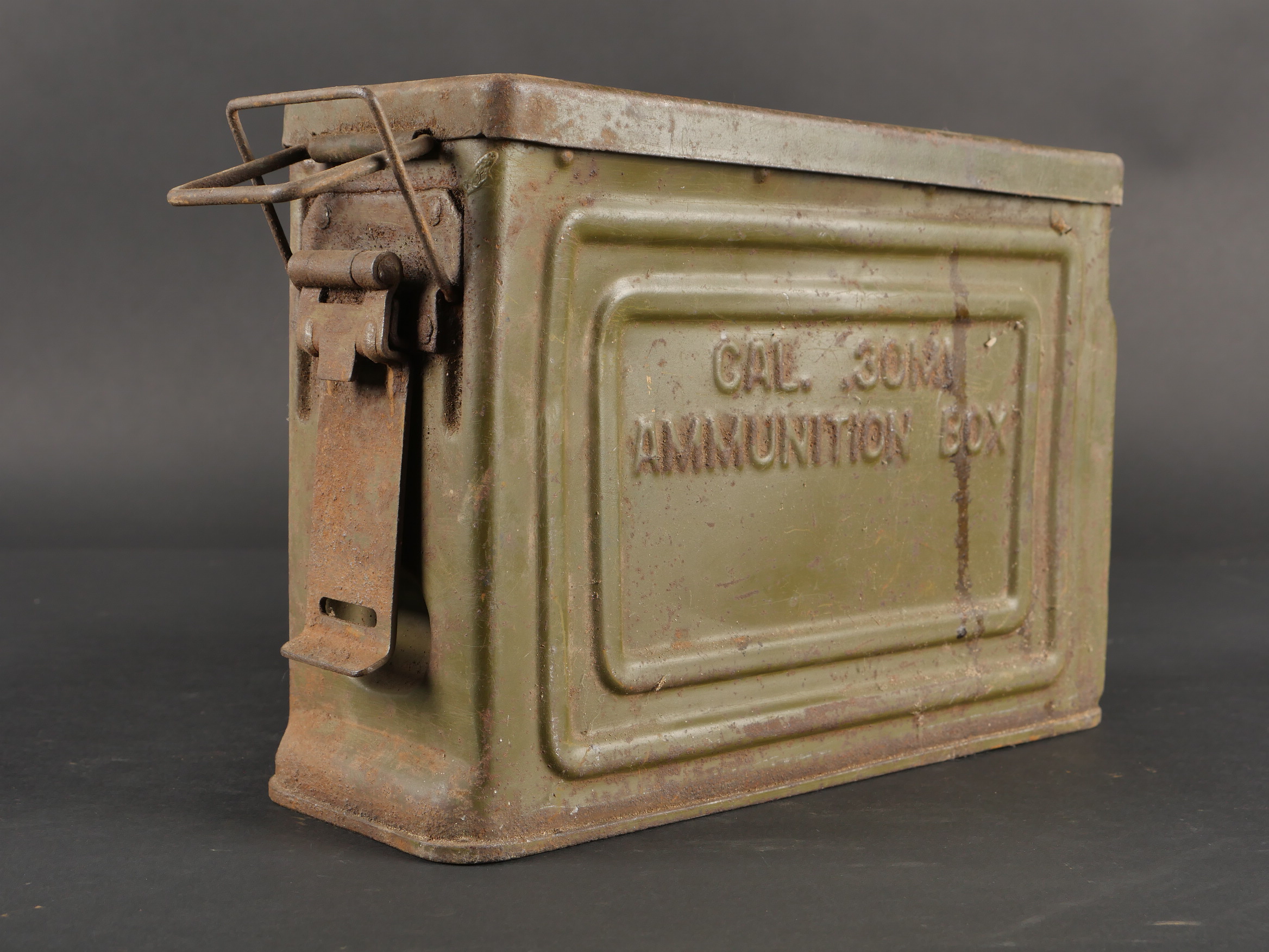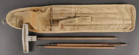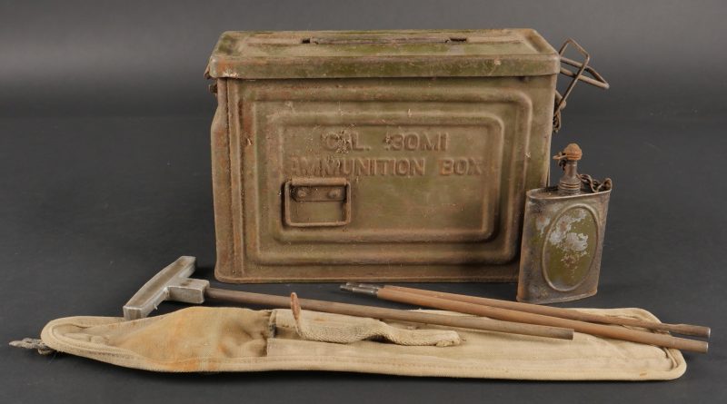Accessoires d’armement US. Comprenant housse de nécessaire de nettoyage CASE CLEANING ROLL avec code couleur d’invasion et Laundry Number P-3138, contenant une baguette de nettoyage en 3 parties, un huilier. On joint une caisse pour Cal.30