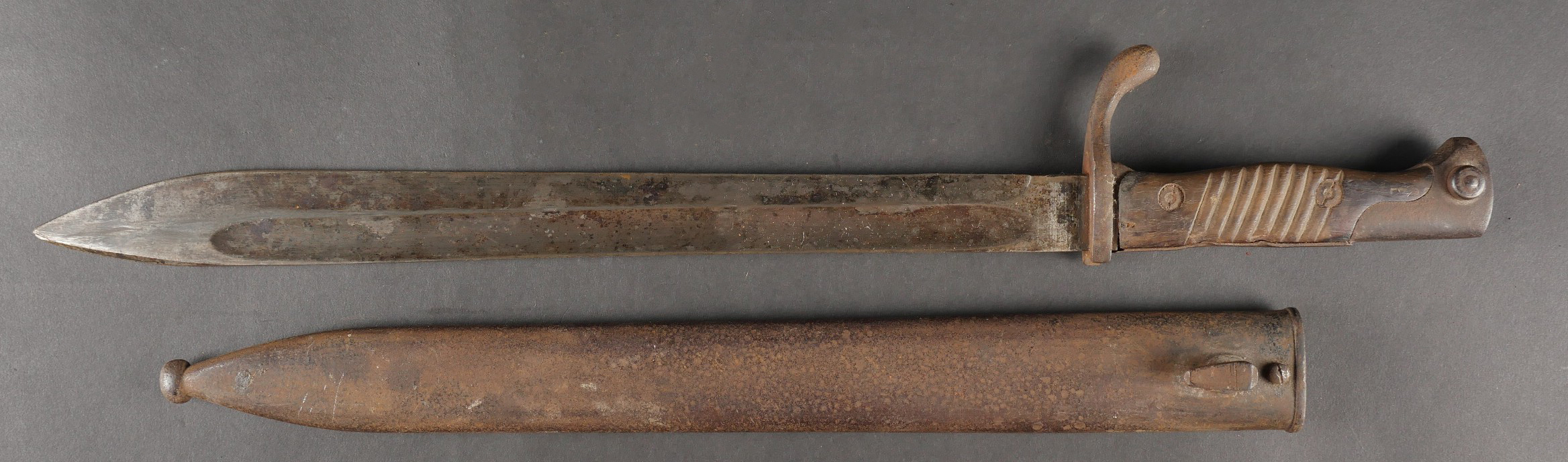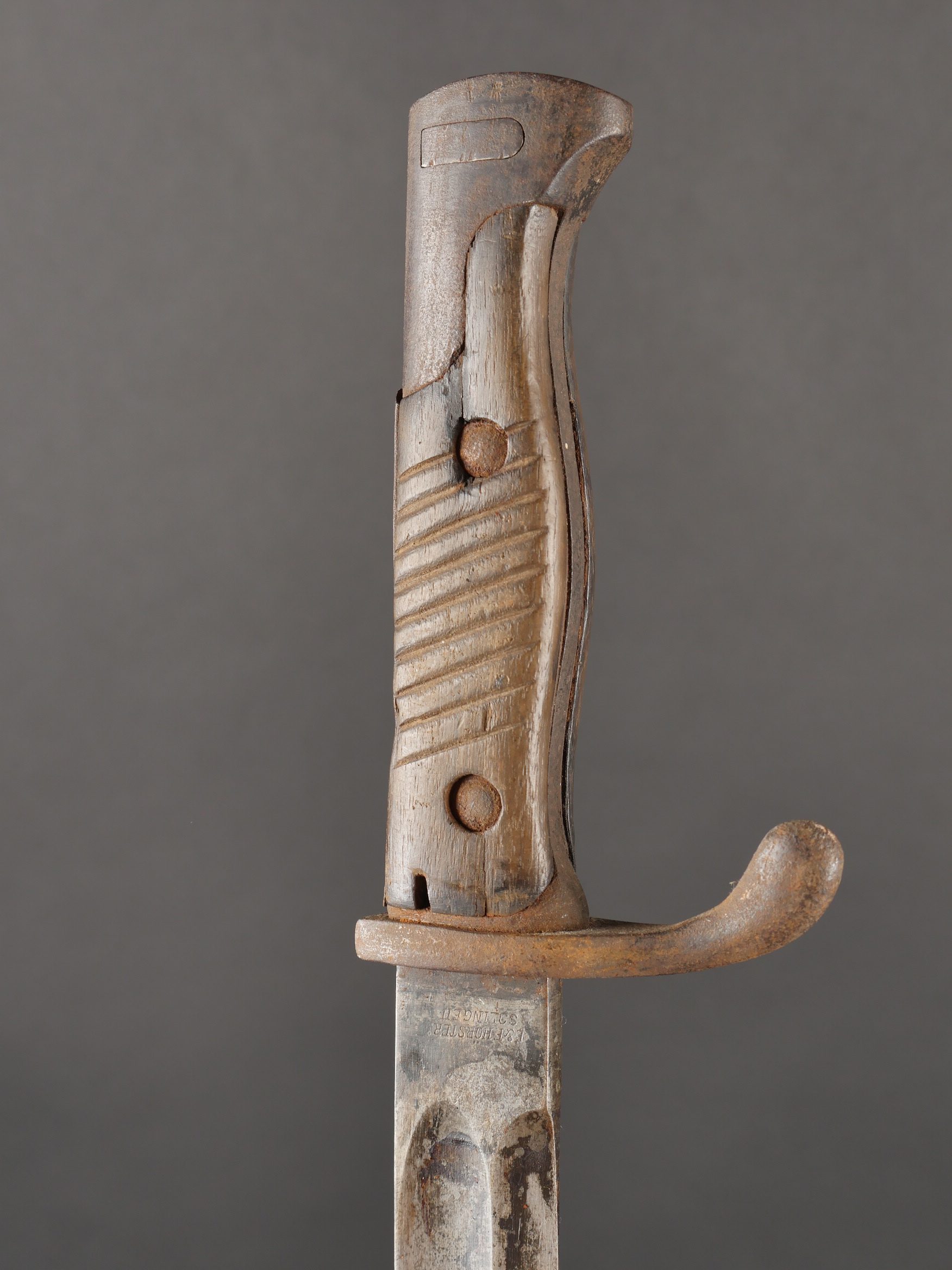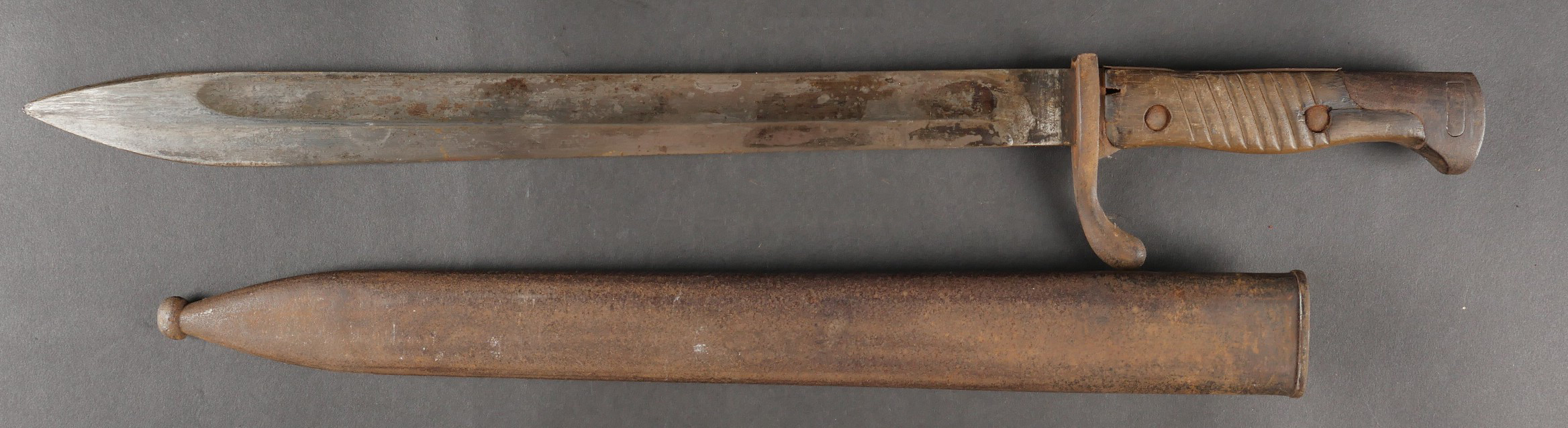 Détails de la vente >Baïonnette allemande 98-05. Lame du fabricant Hörster, datée 1917. Coups sur le dos de la poignée. Fourreau fer en bon état.