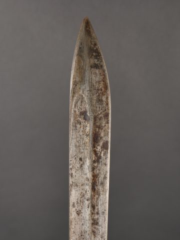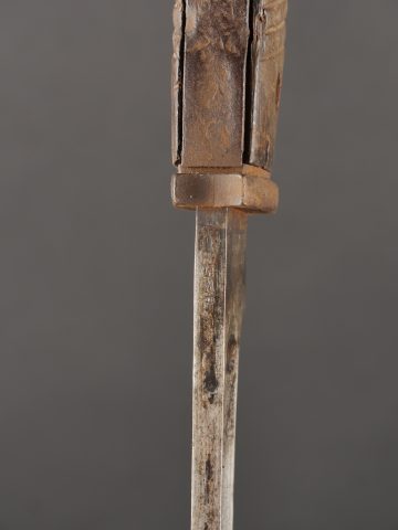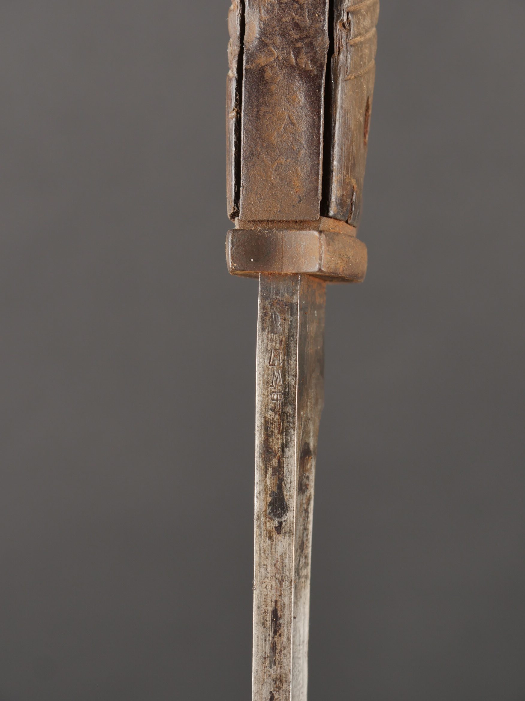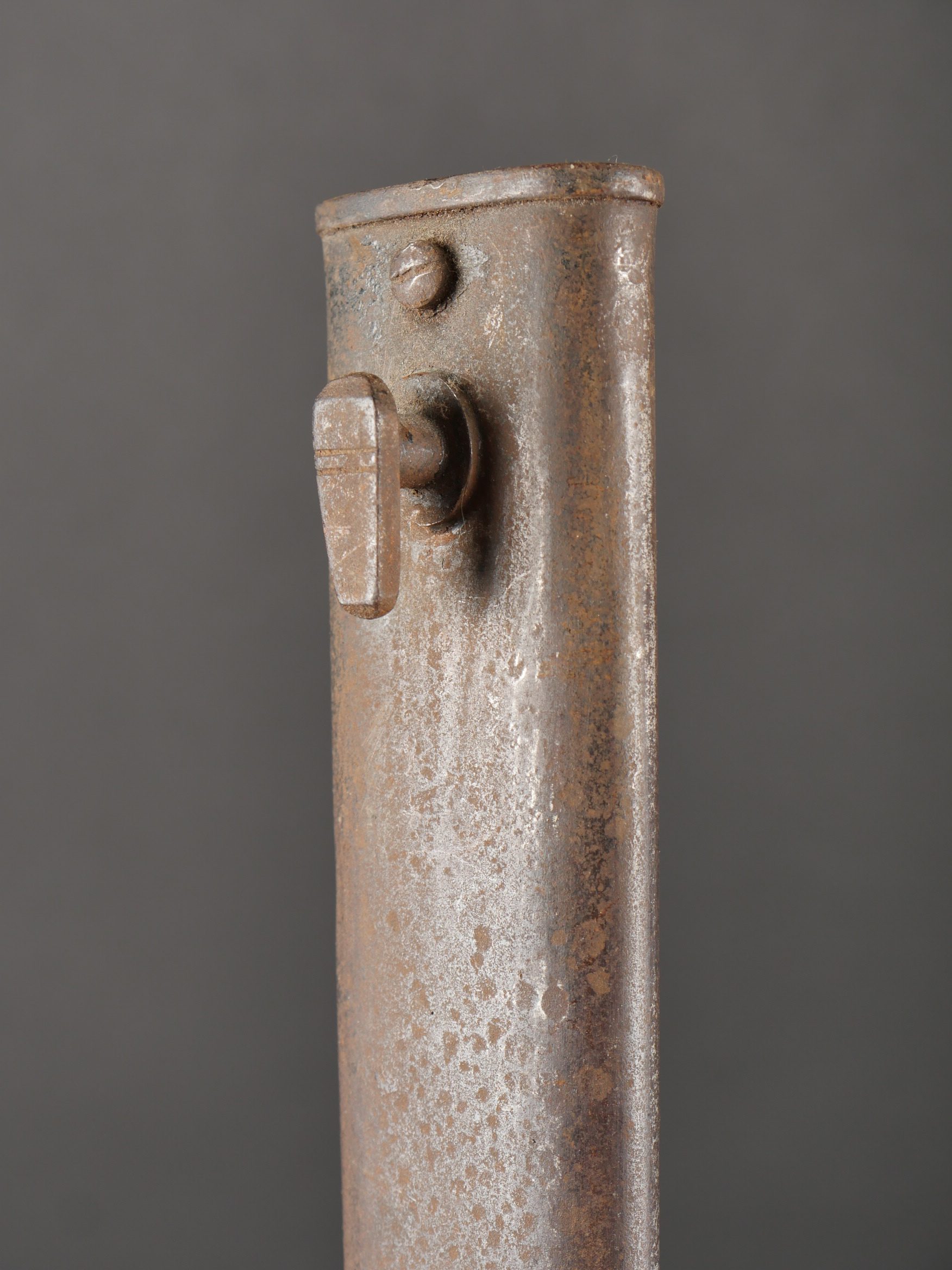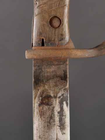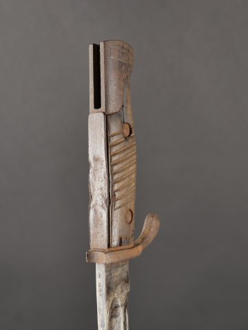 Détails de la vente >Baïonnette allemande 98-05. Lame du fabricant Hörster, datée 1917. Coups sur le dos de la poignée. Fourreau fer en bon état.