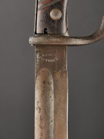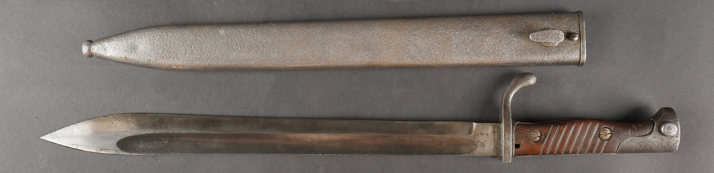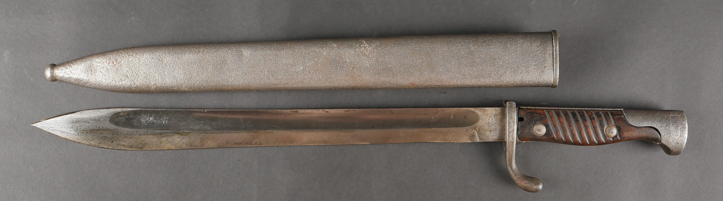 Détails de la vente >Baïonnette Allemande 98-05. Lame du fabricant Höller datée 1916, bouton poussoir fonctionnel, fourreau fer avec corrosion, usure, patine