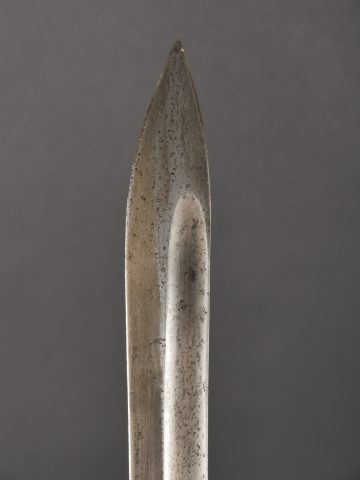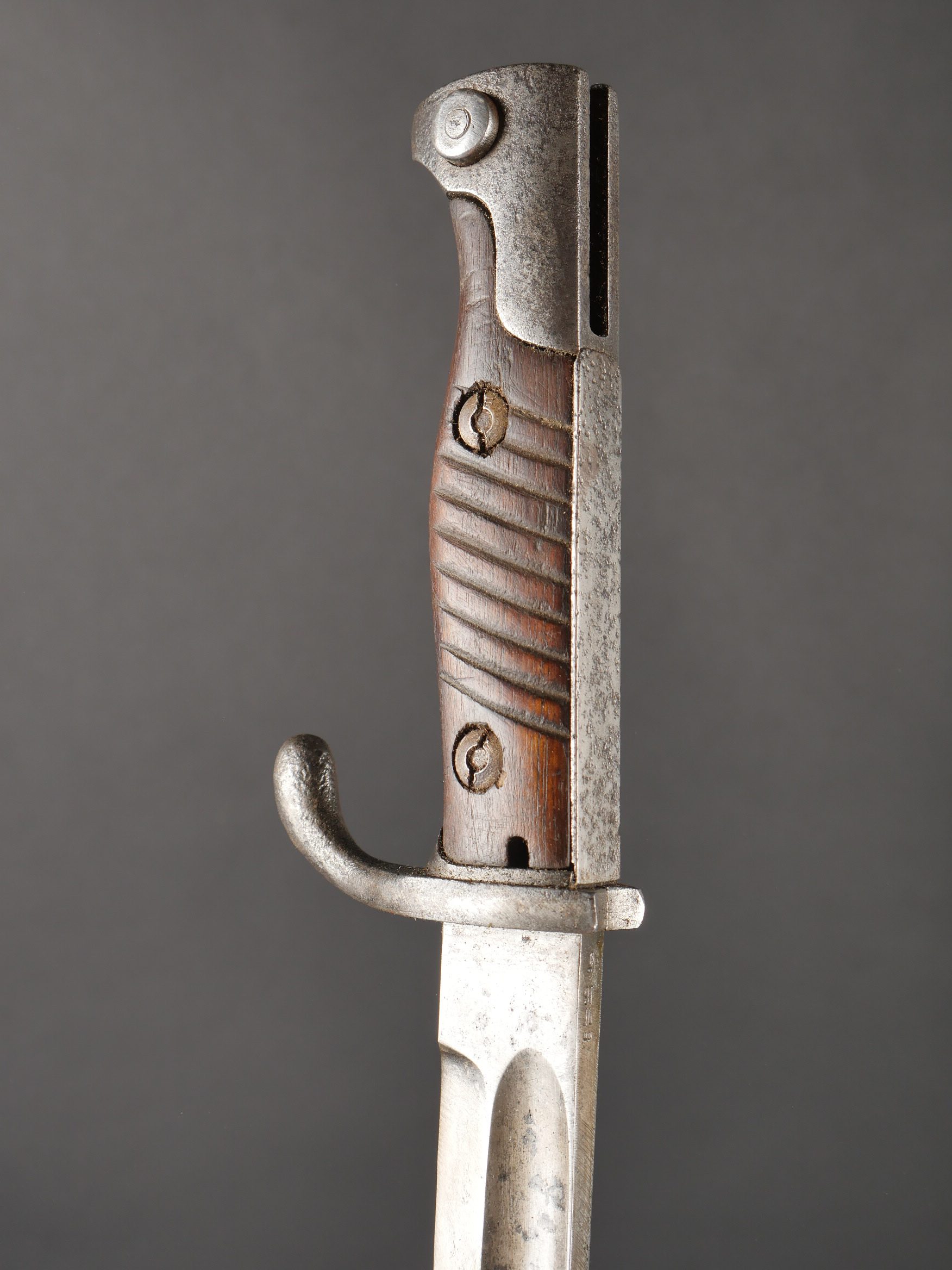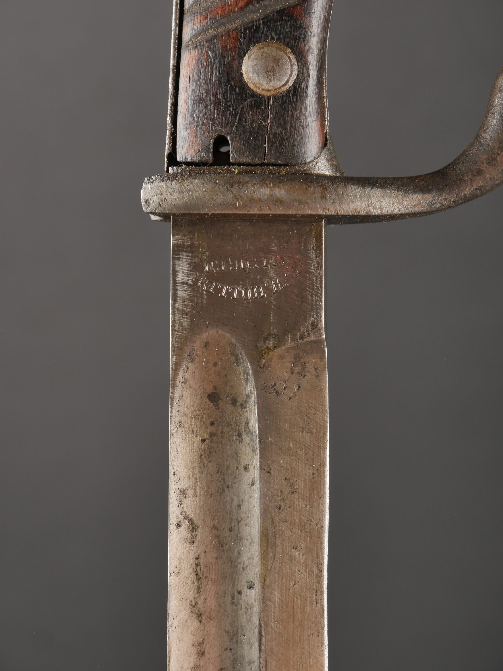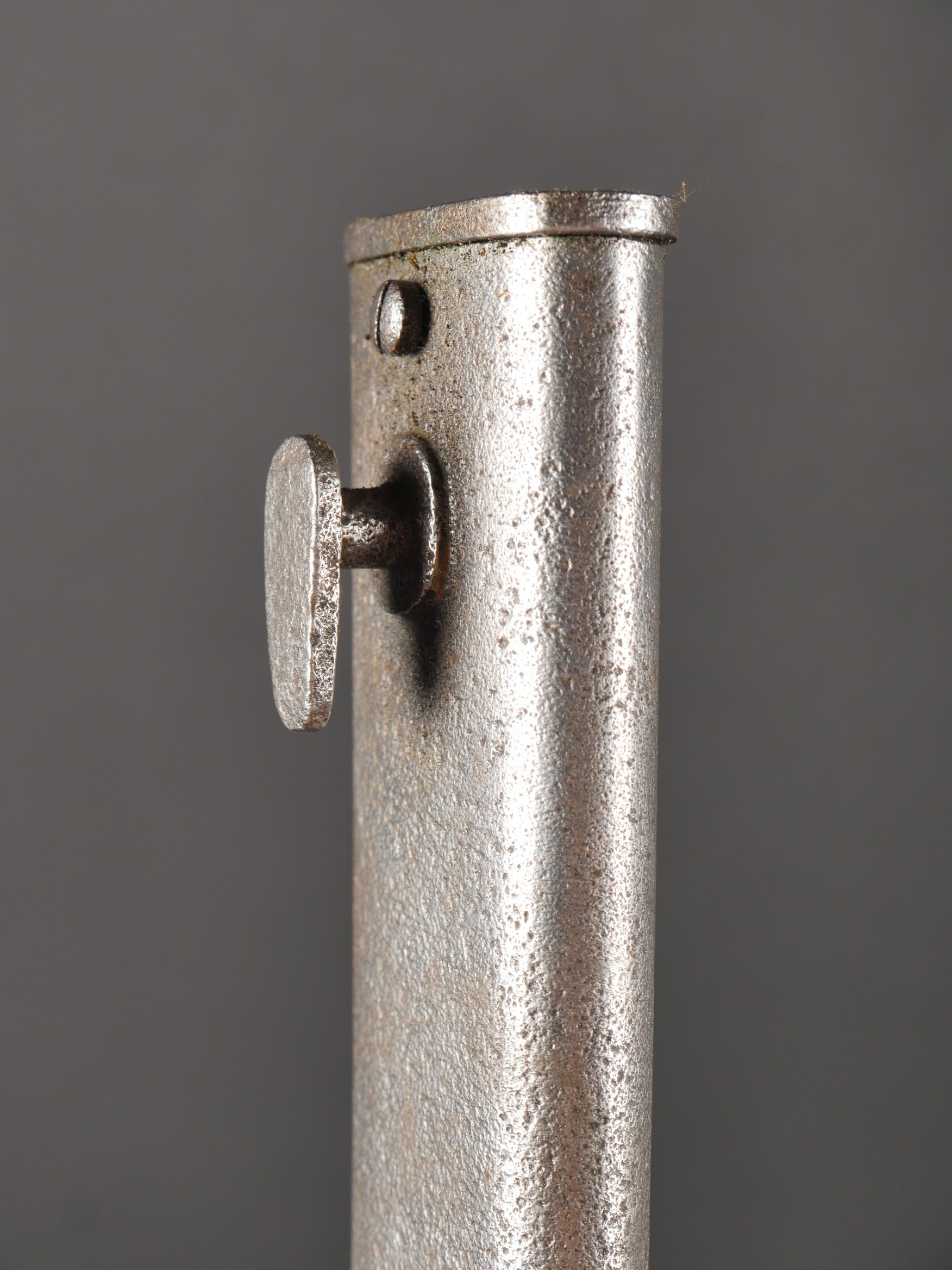 Détails de la vente >Baïonnette Allemande 98-05. Lame du fabricant Höller datée 1916, bouton poussoir fonctionnel, fourreau fer avec corrosion, usure, patine