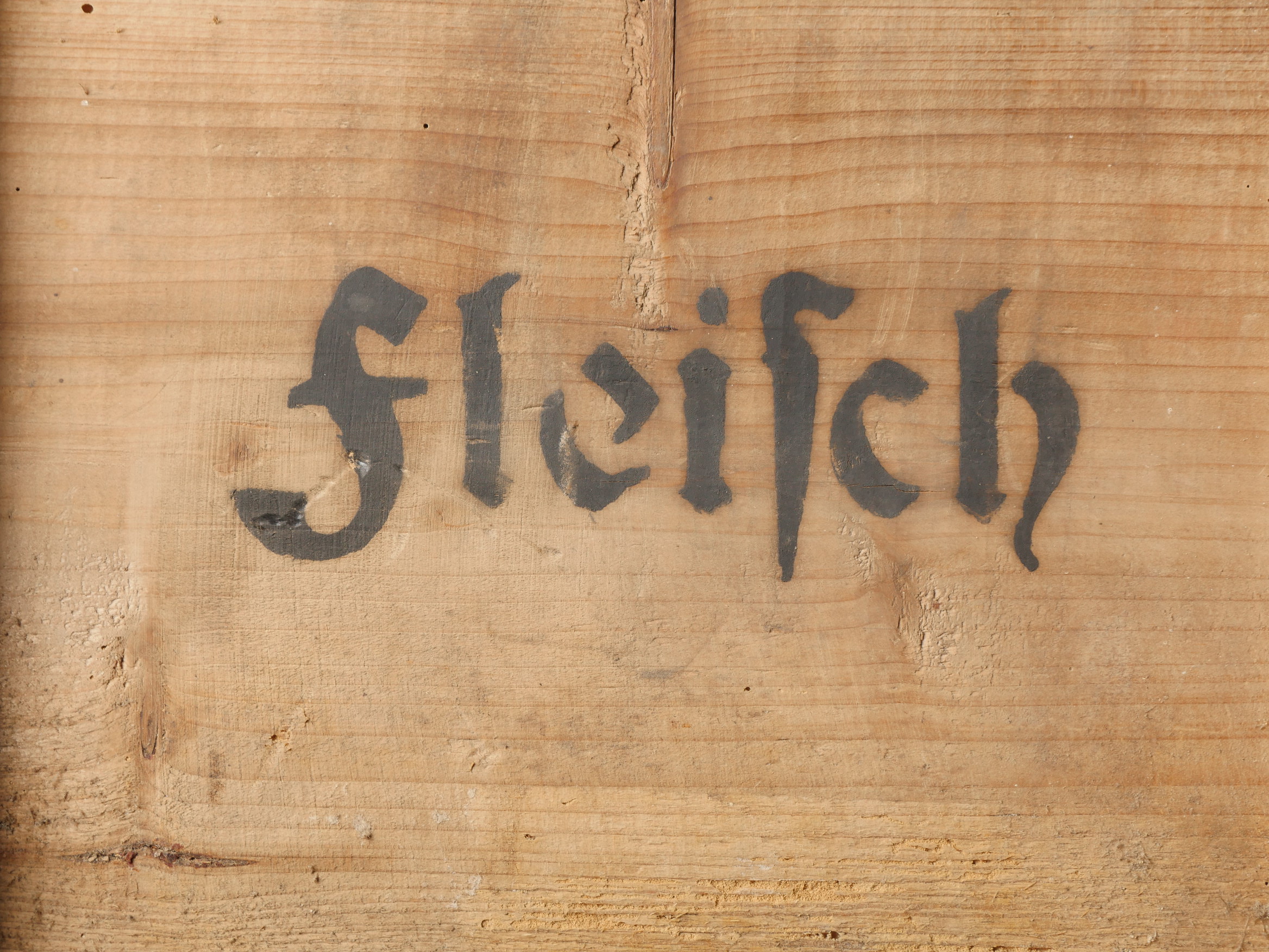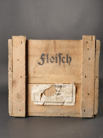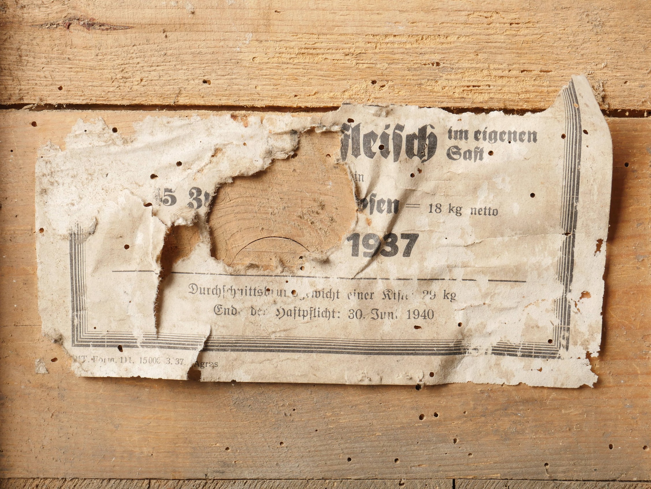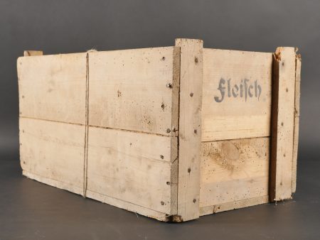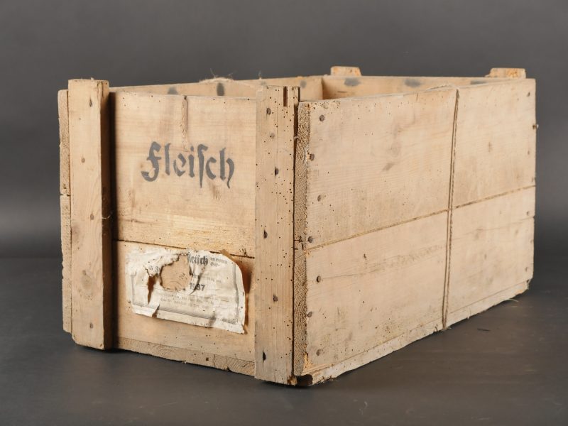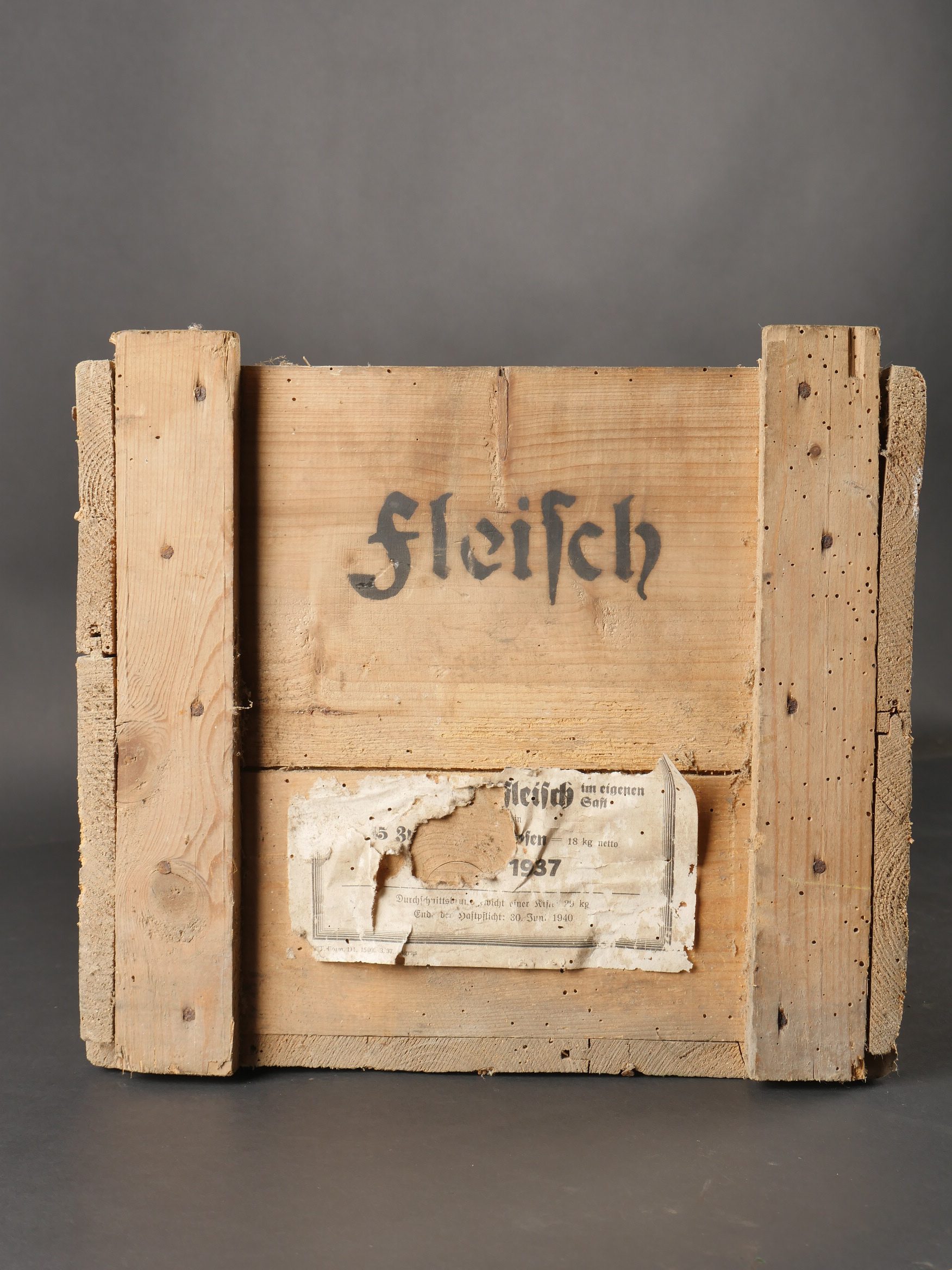 Détails de la vente >Caisse à viande allemande et caisse munition. Belle caisse en bois pour transport de ration de viande, marquée Fleisch, avec reste de son étiquette d’origine datée 30 juin 1940. On y... en savoir plus