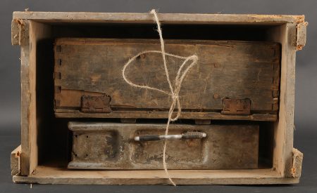 Caisse à viande allemande et caisse munition. Belle caisse en bois pour transport de ration de viande, marquée Fleisch, avec reste de son étiquette d’origine datée 30 juin 1940. On y... en savoir plus