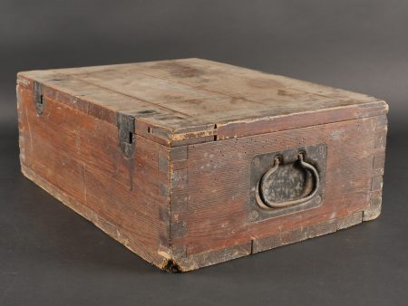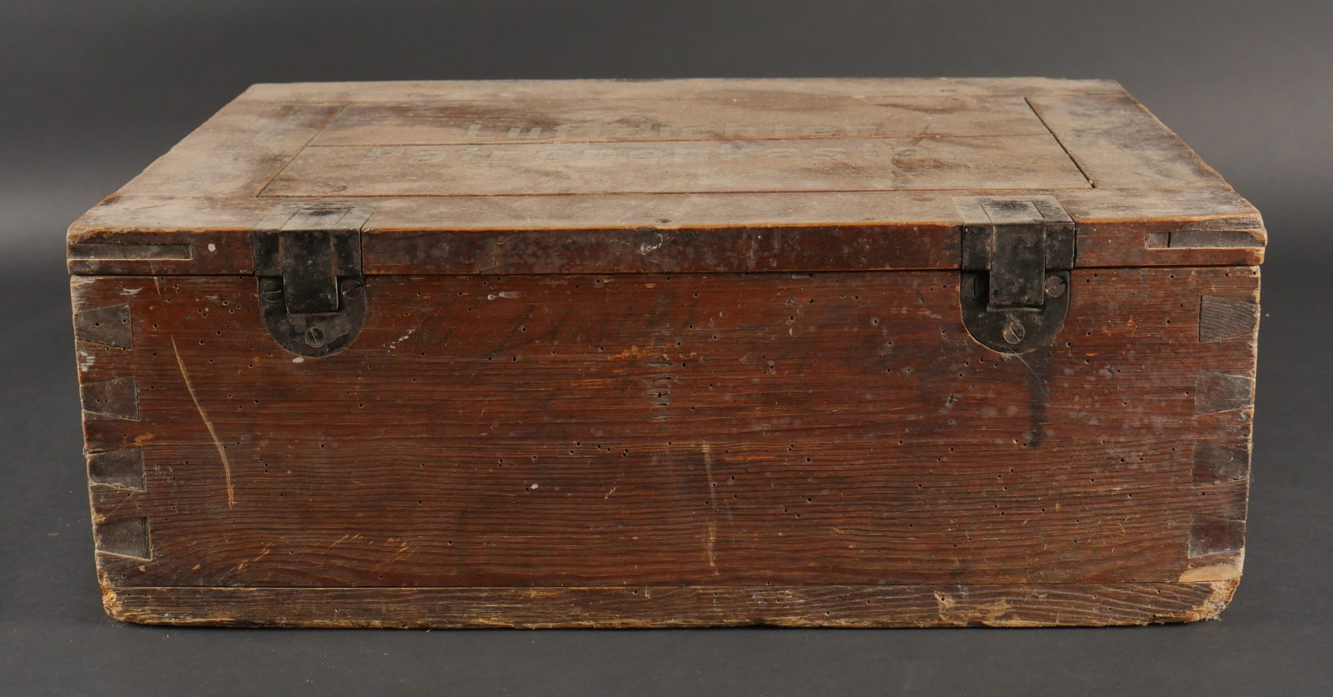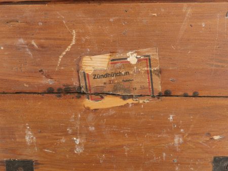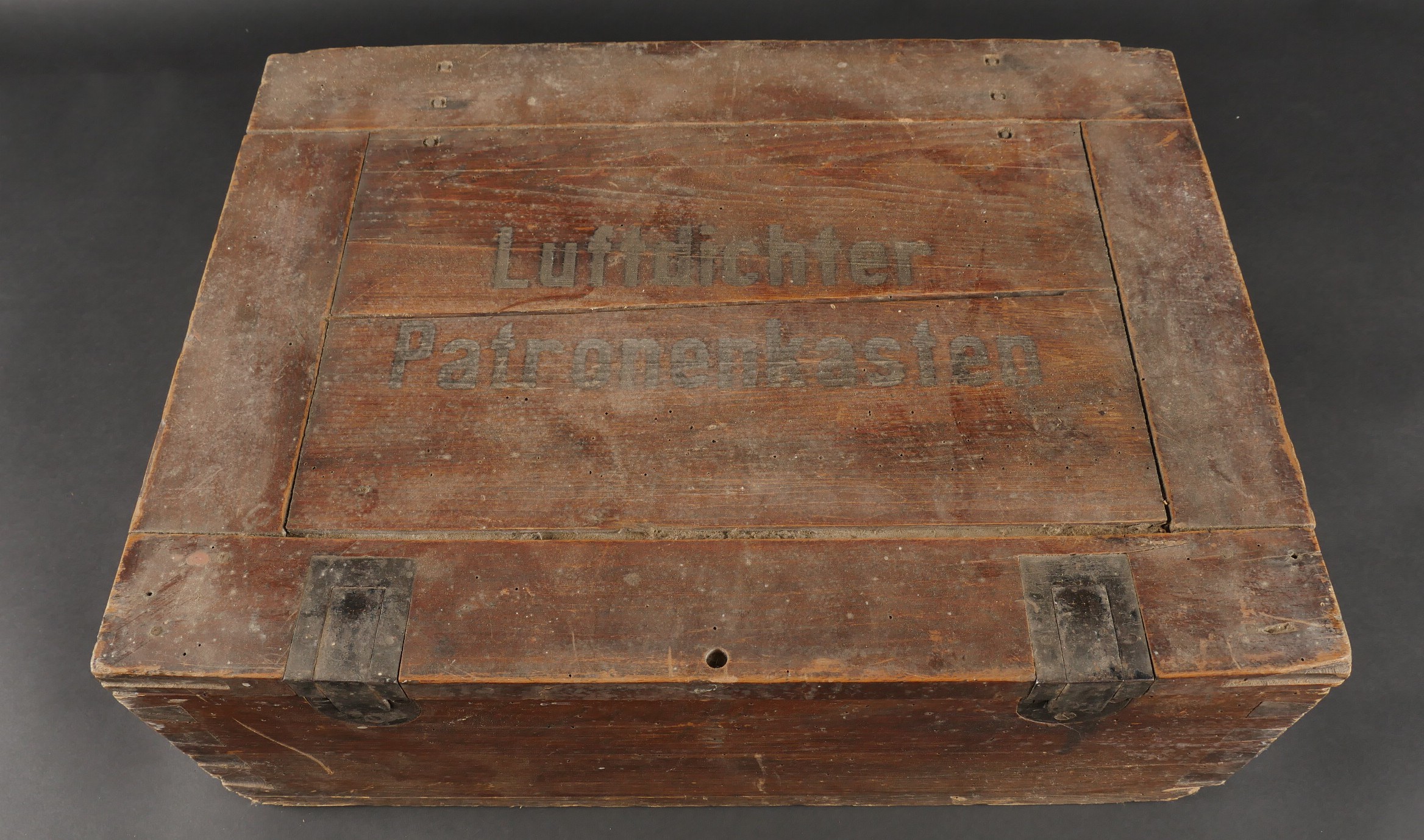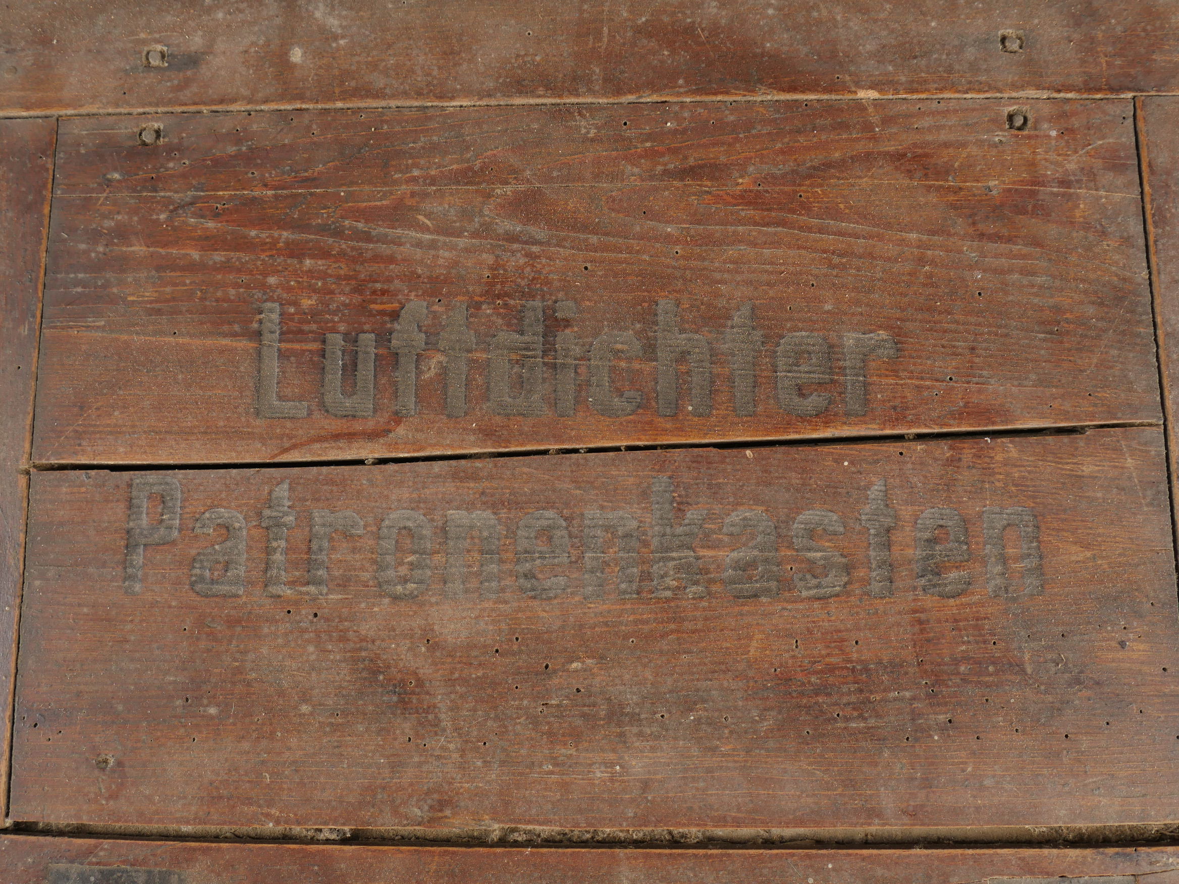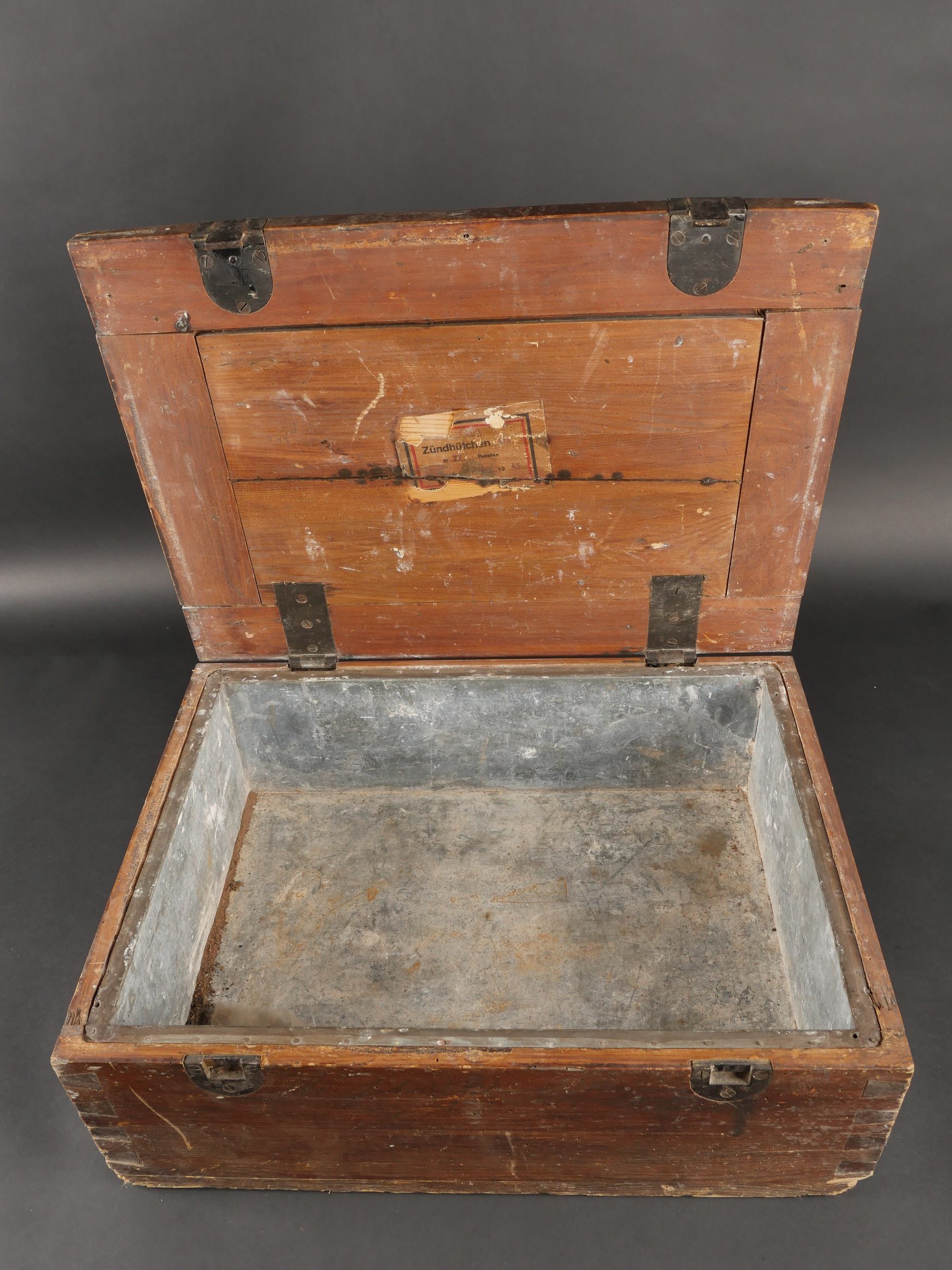 Détails de la vente >Caisse allemande. Belle caisse en bois, pour Luftdichter patronen, avec son intérieur en zinc et étiquette datée 45.