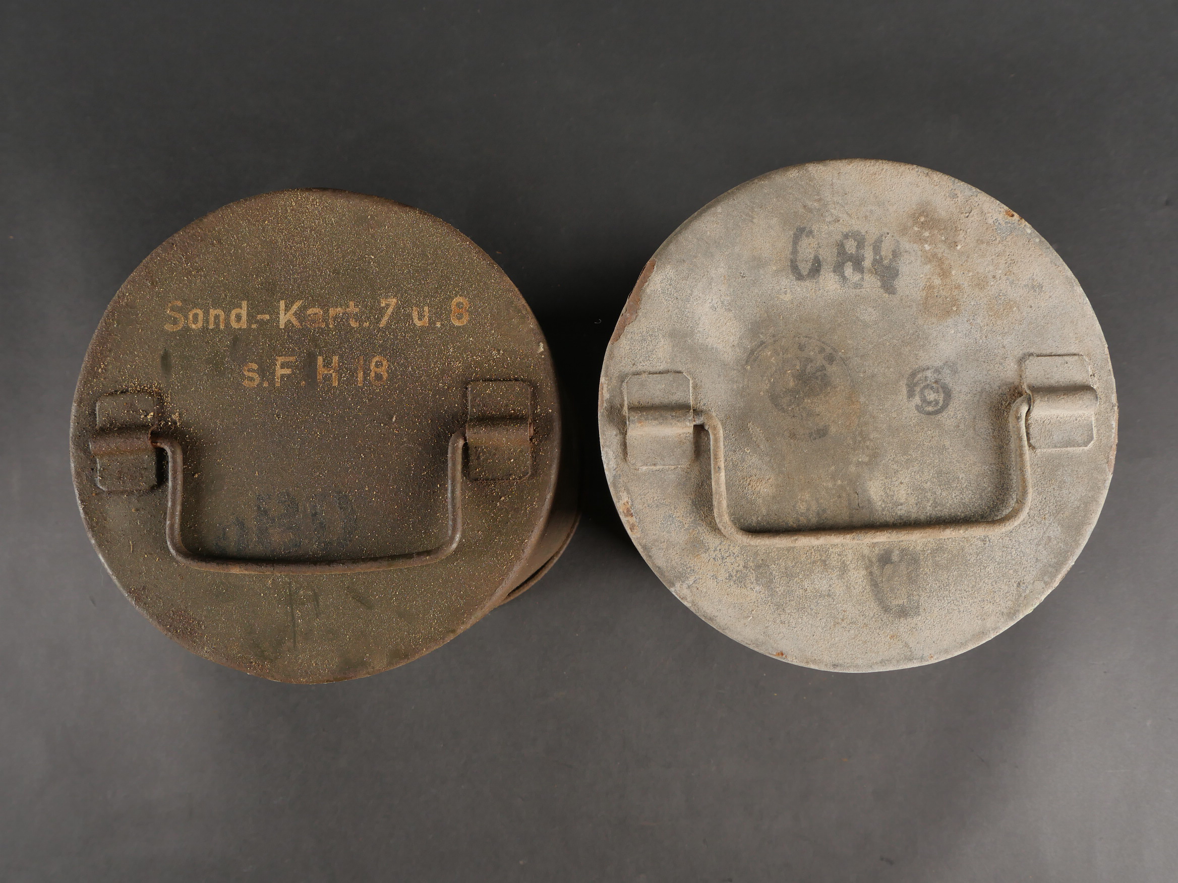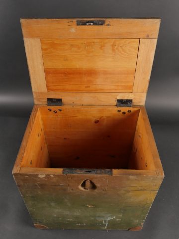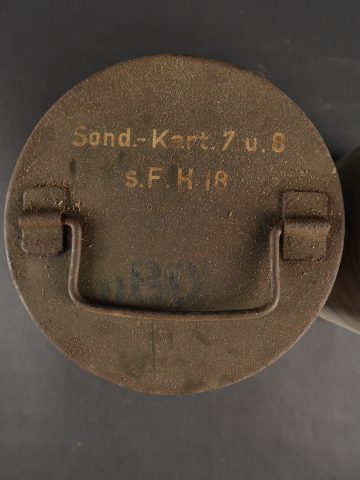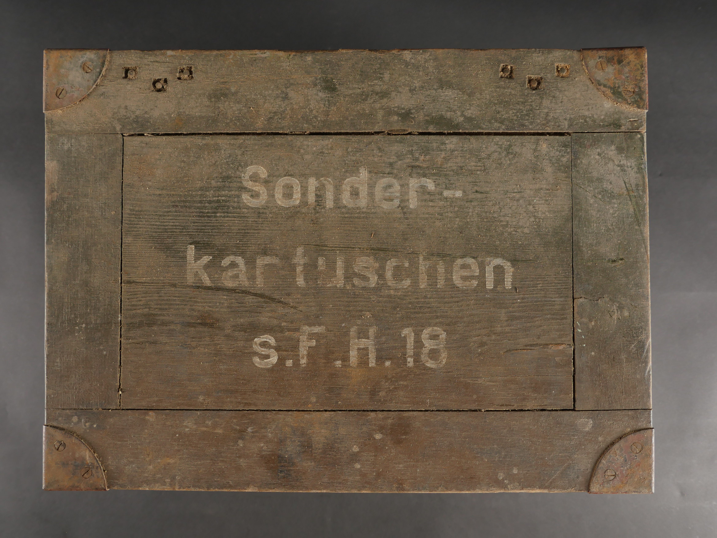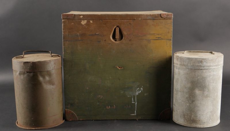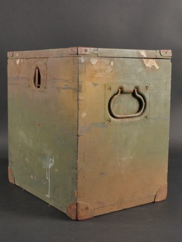 Détails de la vente >Caisse camouflée allemande. Très belle caisse en bois pour le transport des gargousses du canon s.F.H.18, camouflée trois tons type Reichswehr, avec ses deux container en métal. Bel ensemble... en savoir plus