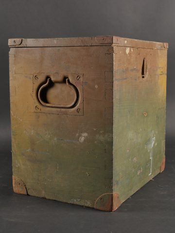 Caisse camouflée allemande. Très belle caisse en bois pour le transport des gargousses du canon s.F.H.18, camouflée trois tons type Reichswehr, avec ses deux container en métal. Bel ensemble... en savoir plus