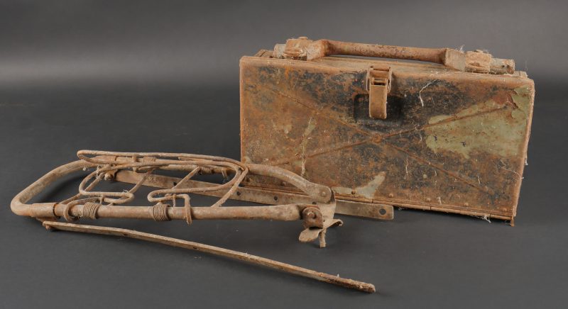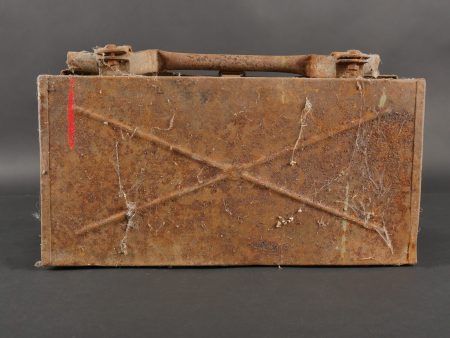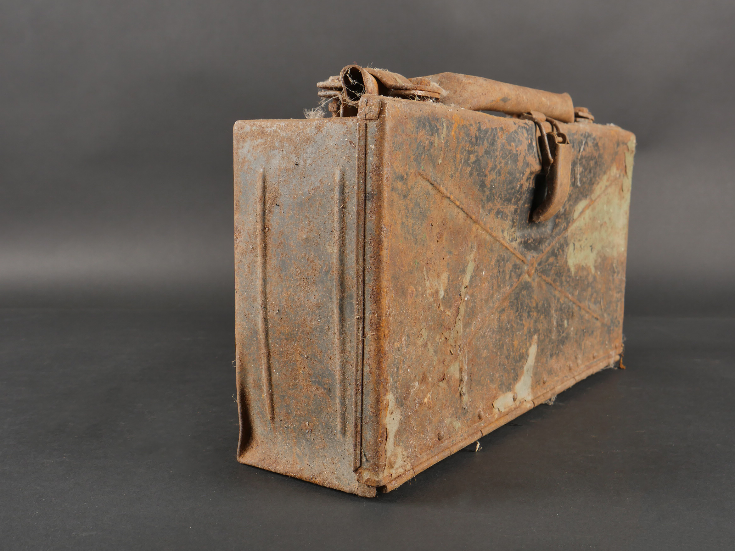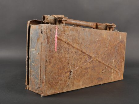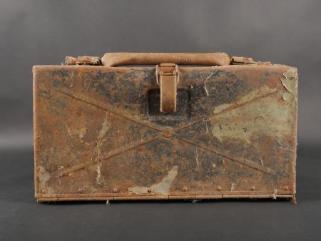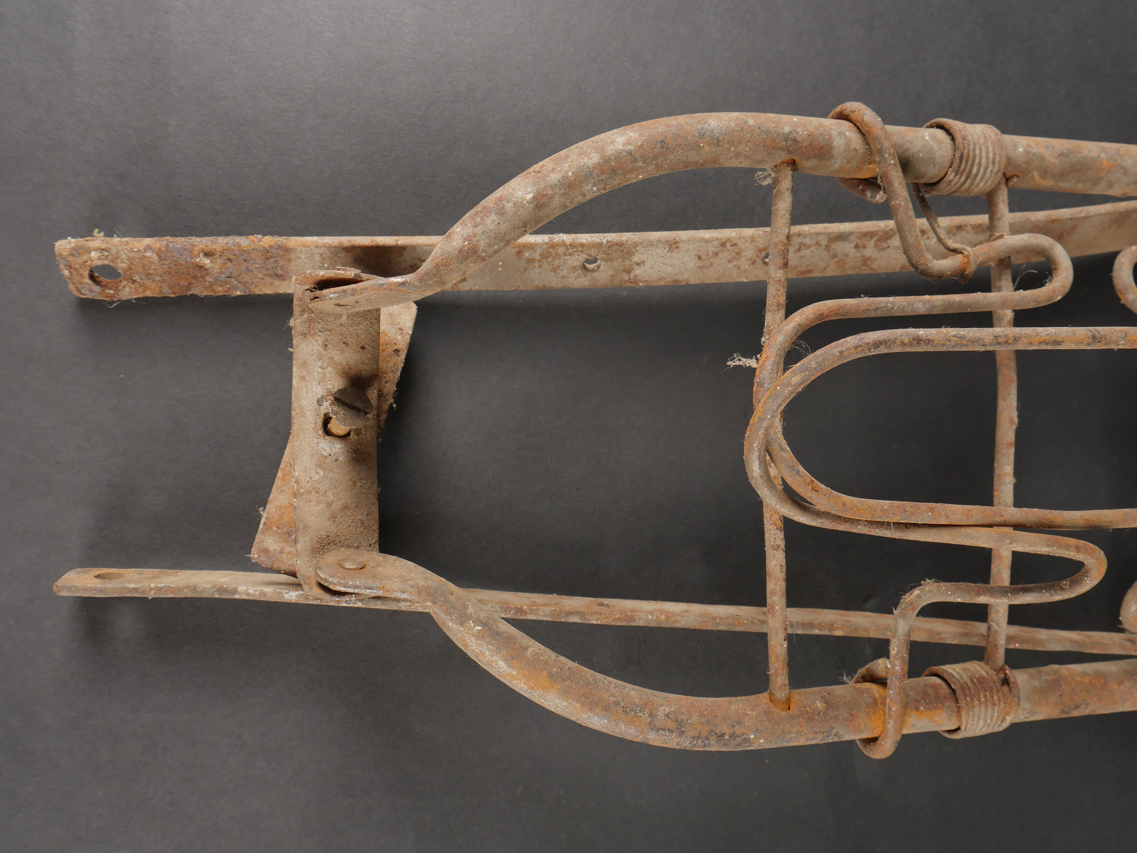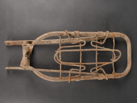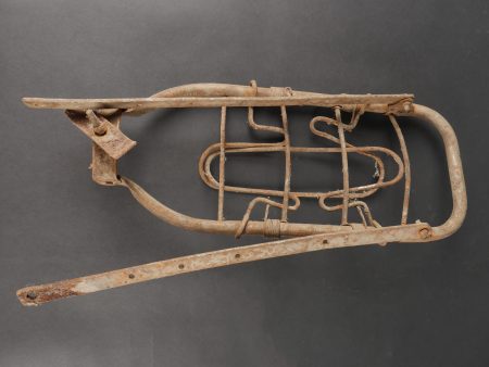 Détails de la vente >Caisse et porte bagage de bicyclette allemande. Caisse en fer avec restes de peinture laquée noire et peinture verte, poignée remplacée et artisanale. Avec un porte bagage