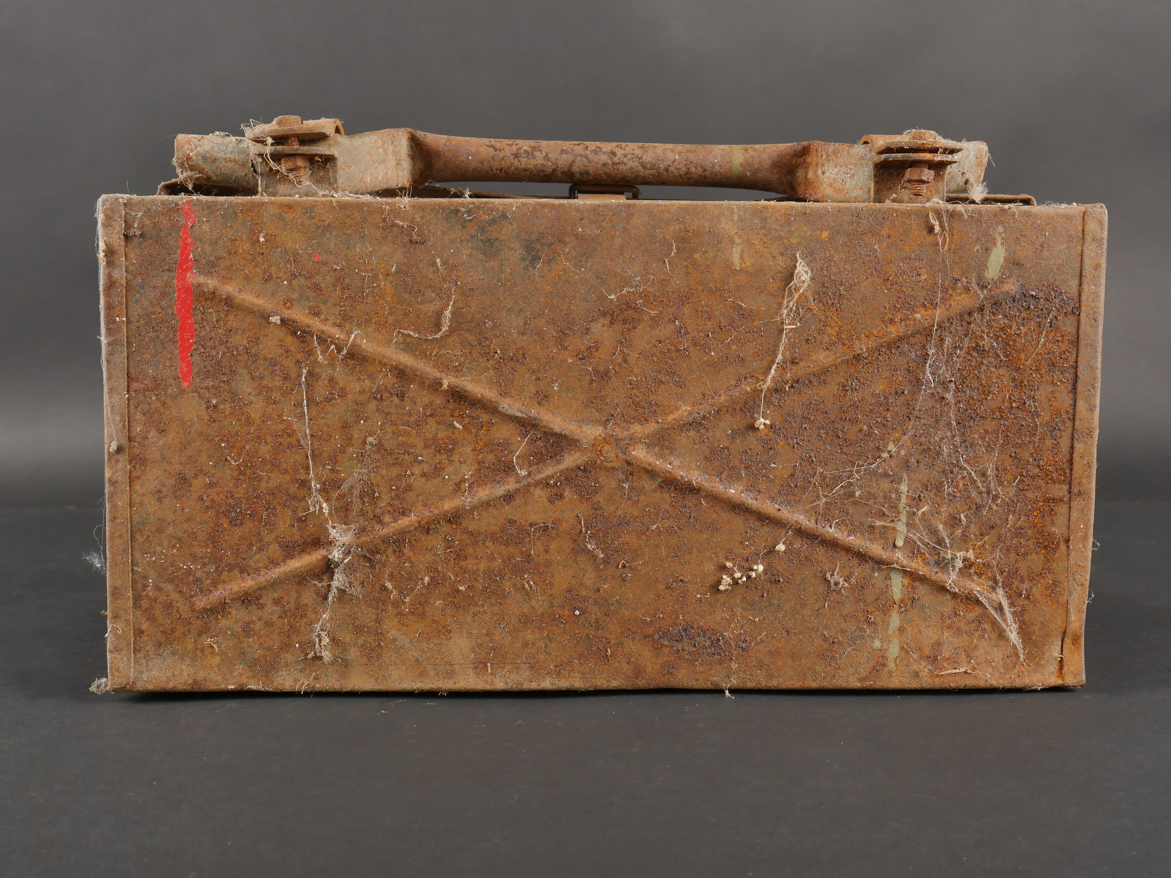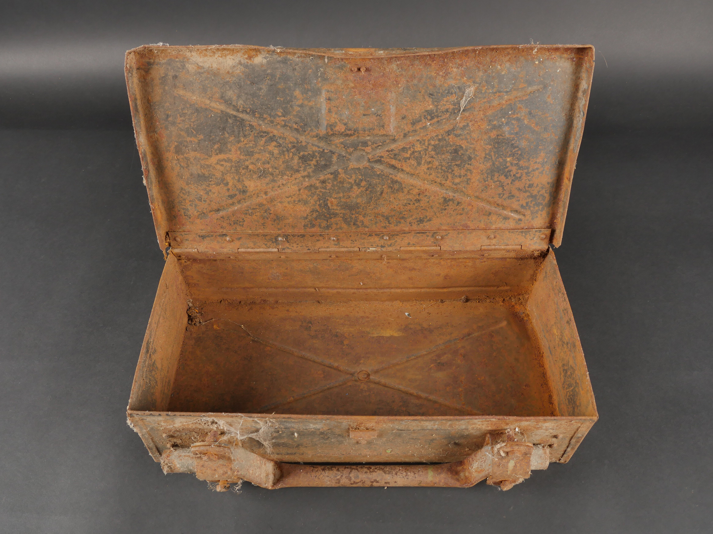 Caisse et porte bagage de bicyclette allemande. Caisse en fer avec restes de peinture laquée noire et peinture verte, poignée remplacée et artisanale. Avec un porte bagage