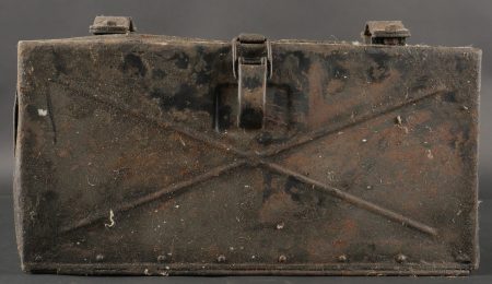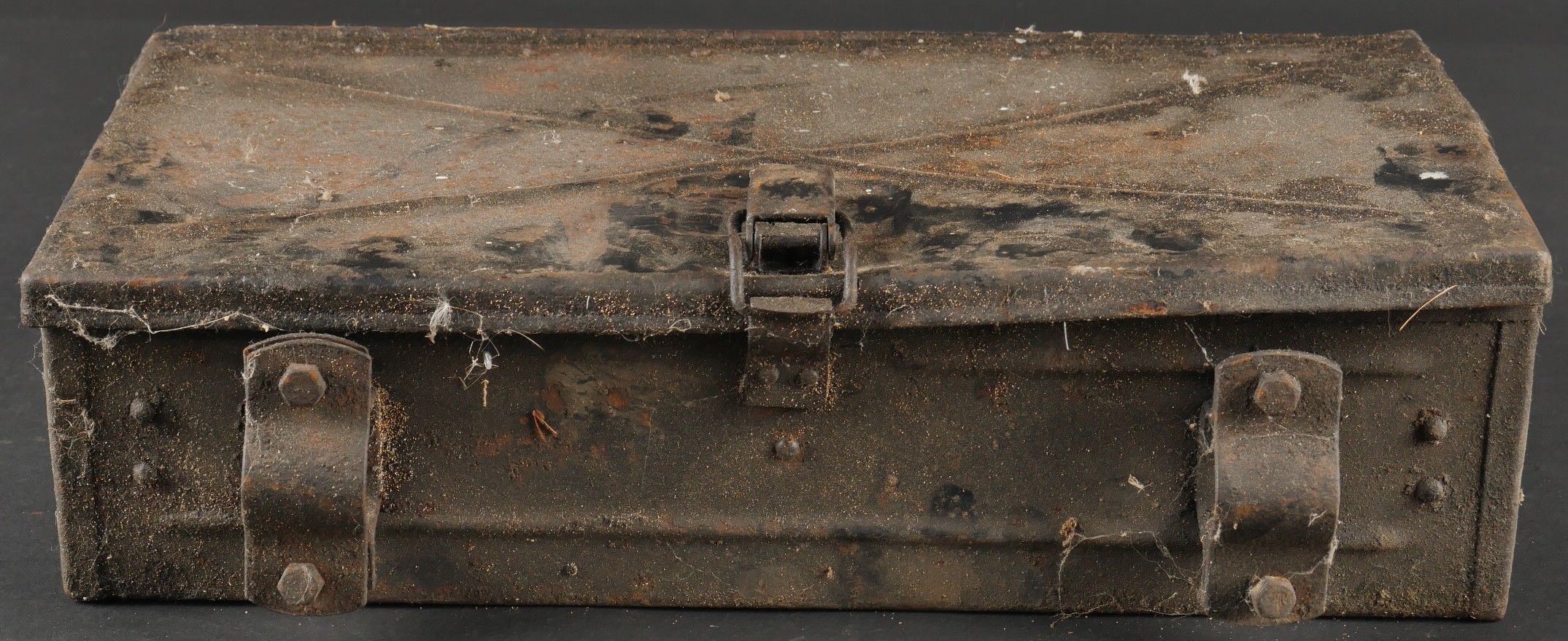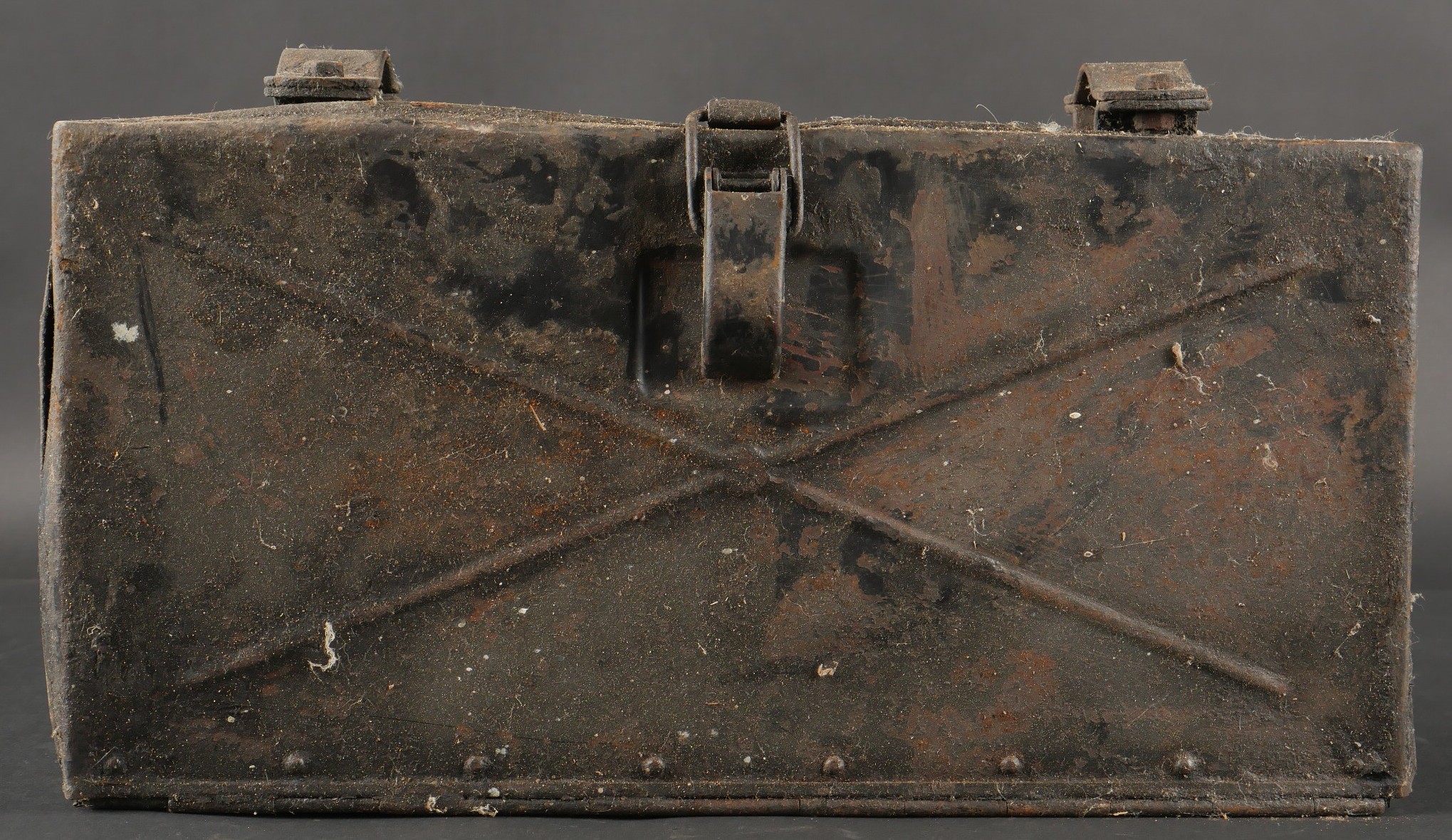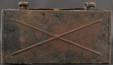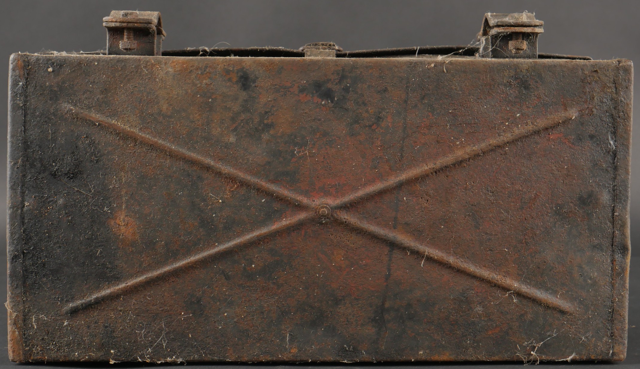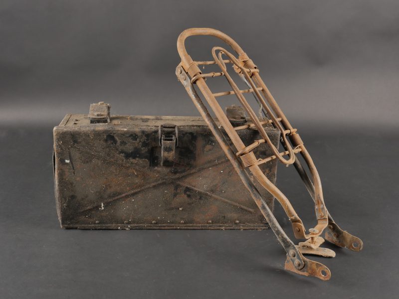 Caisse et porte bagage de Truppenfahrrad. Caisse en métal, peinte en noir avec colliers et sa sangle intérieure. Un porte bagage