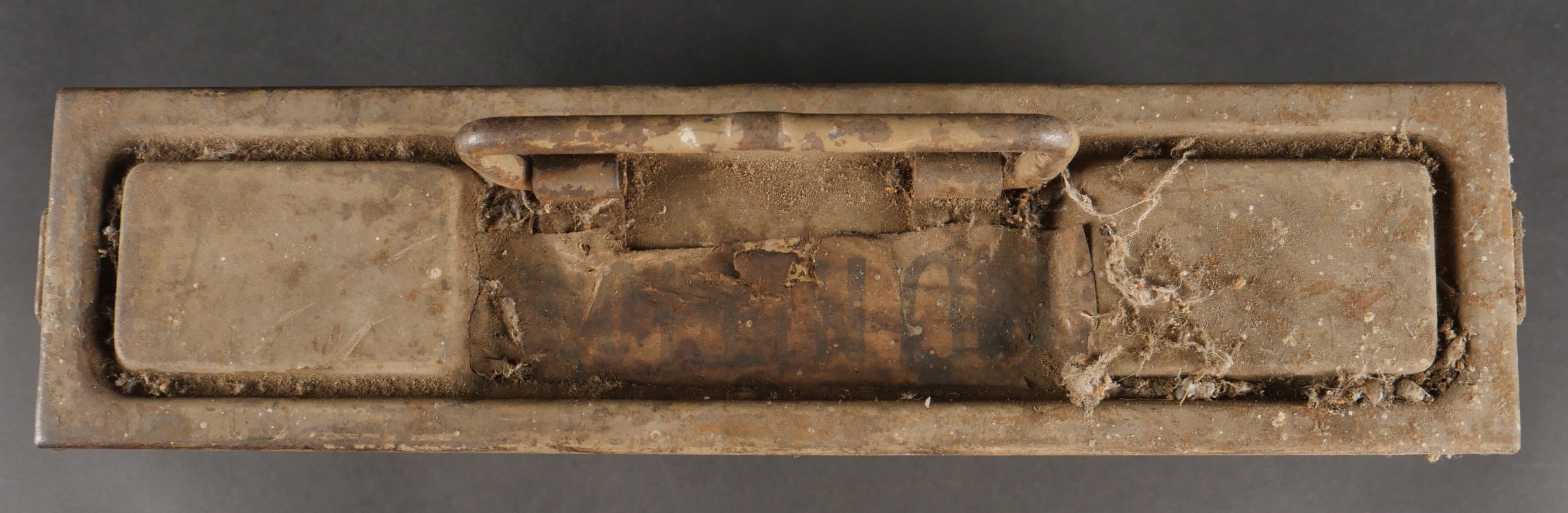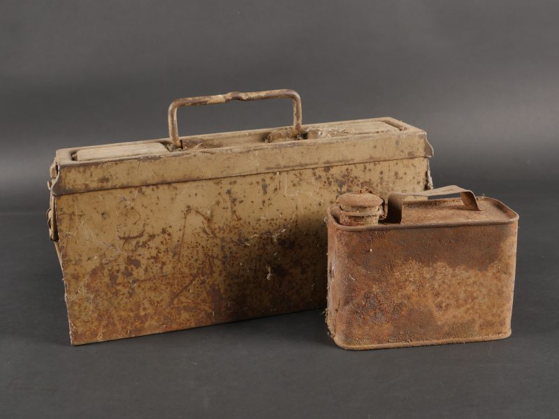 Caisse MG sable et bidon Petroleum. Belle caisse MG en fer en peinture sable d’origine avec un bidon petroleum fortement oxydé.
