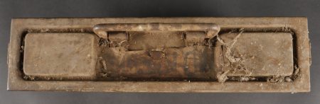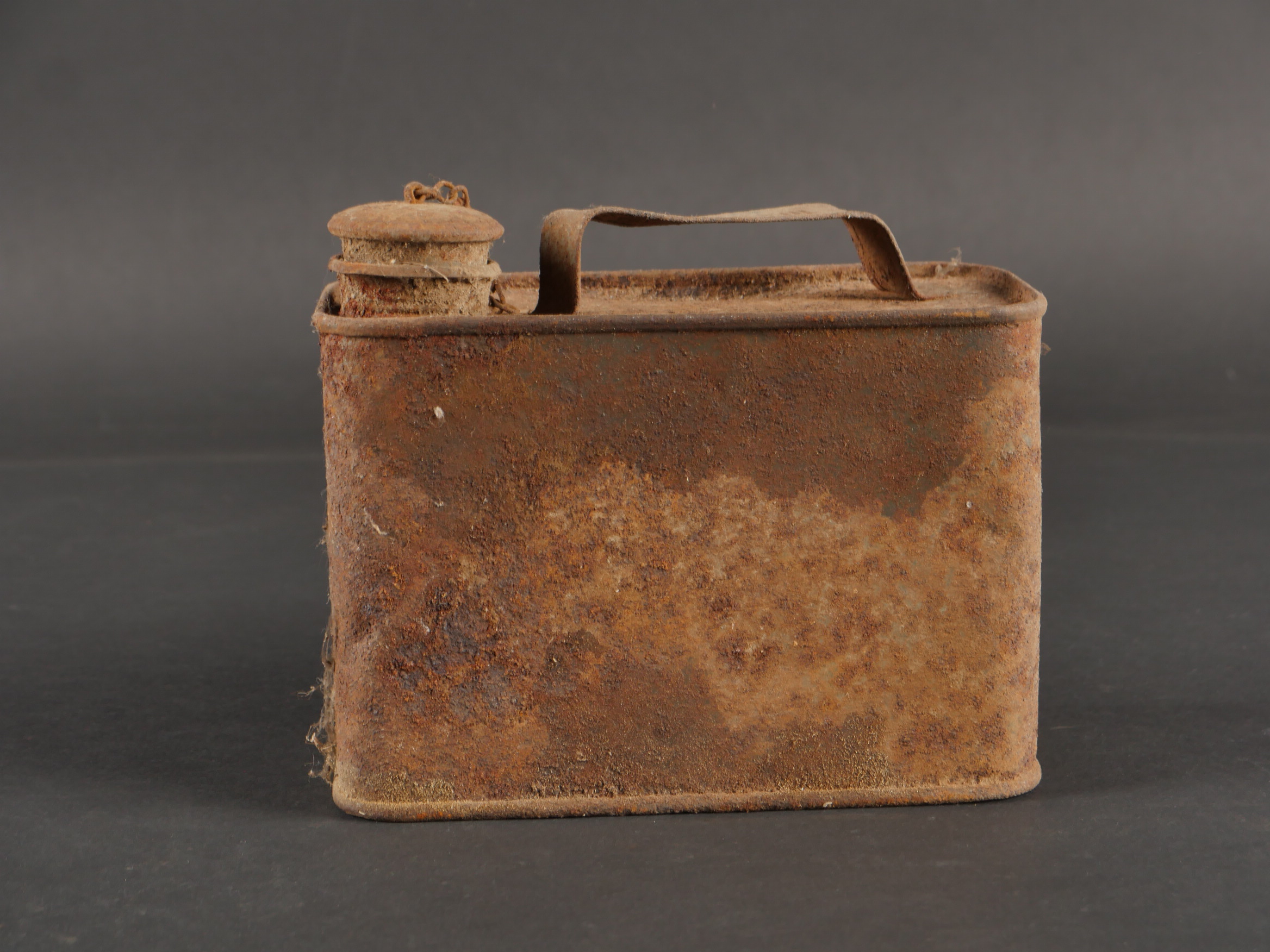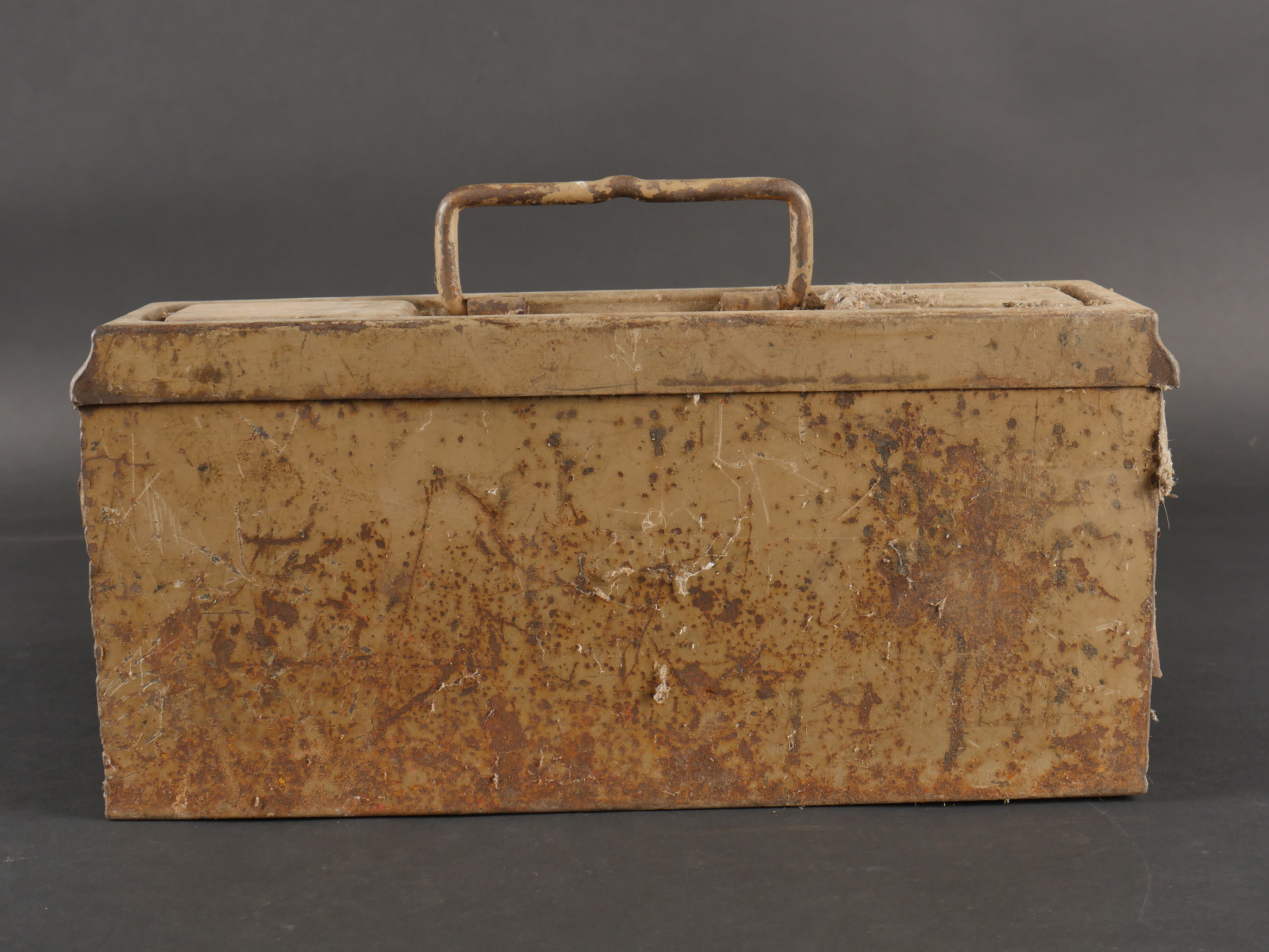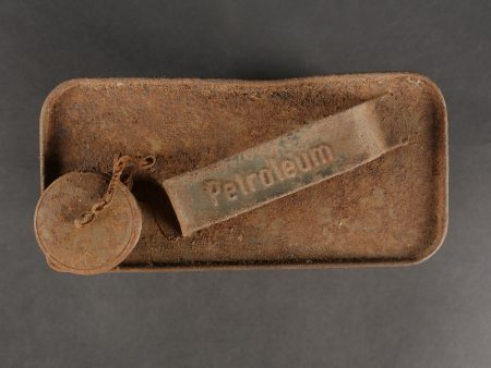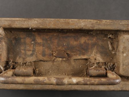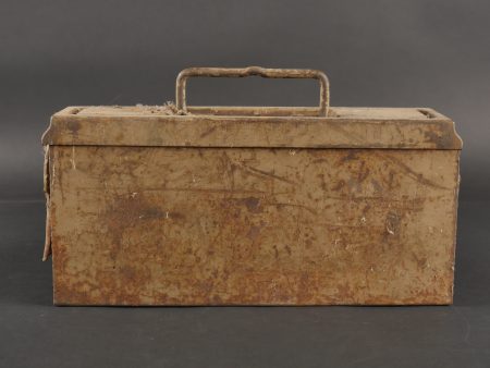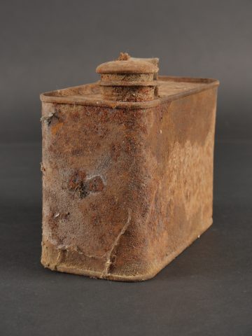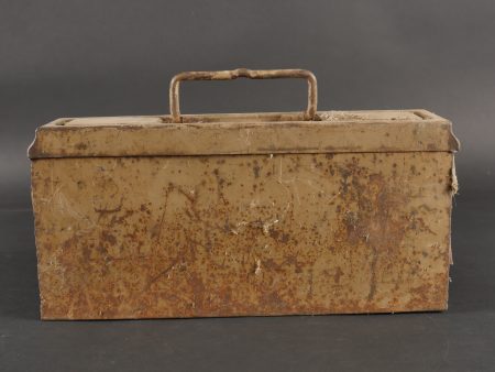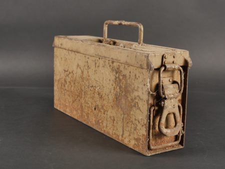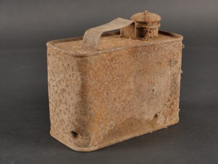 Détails de la vente >Caisse MG sable et bidon Petroleum. Belle caisse MG en fer en peinture sable d’origine avec un bidon petroleum fortement oxydé.