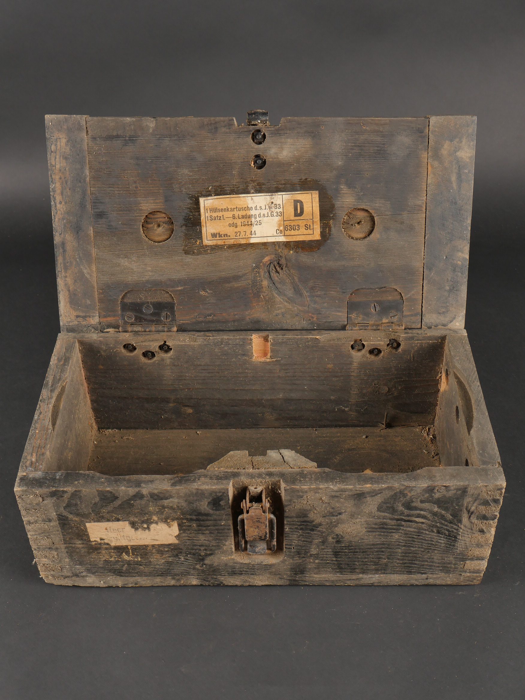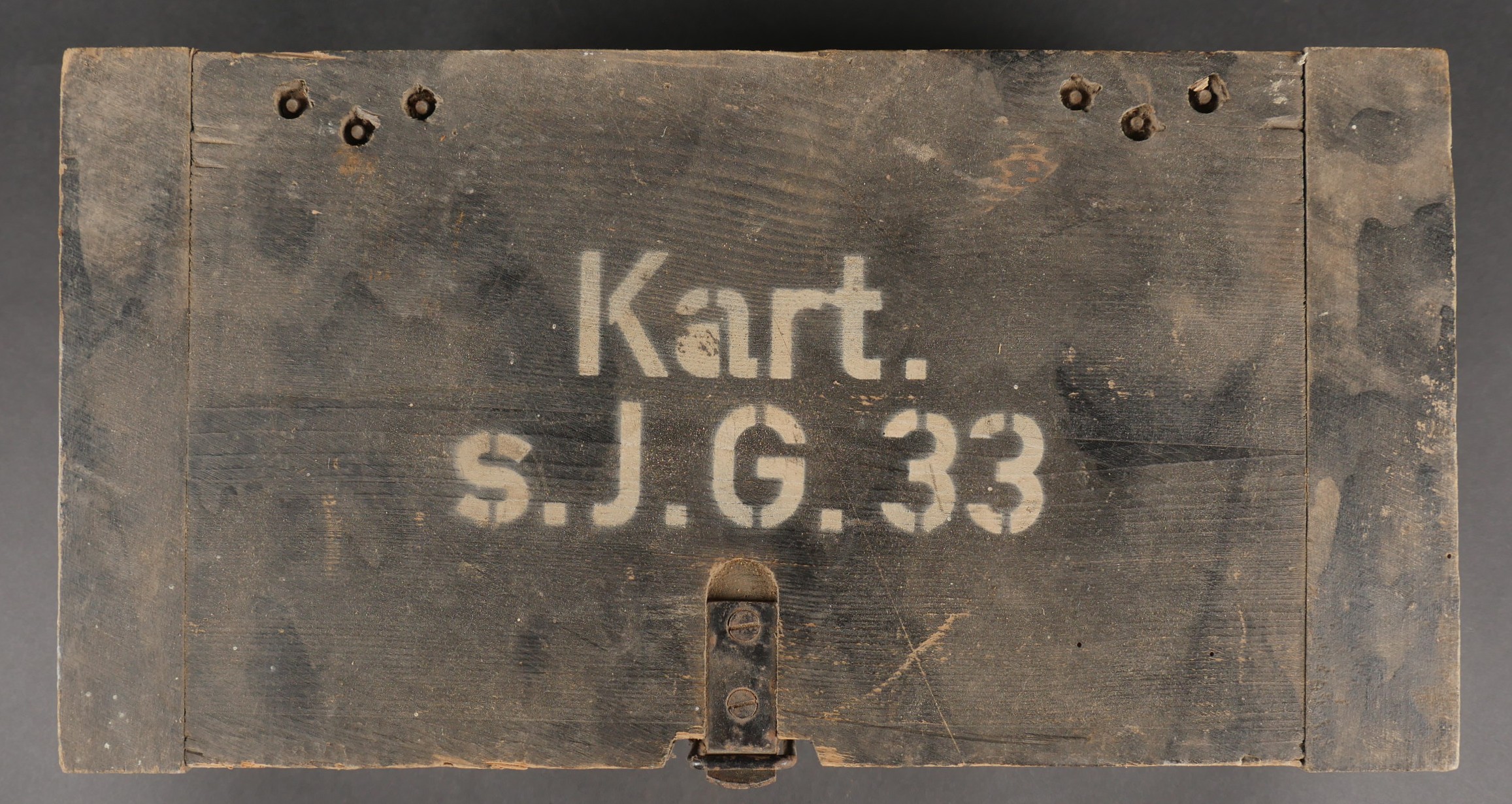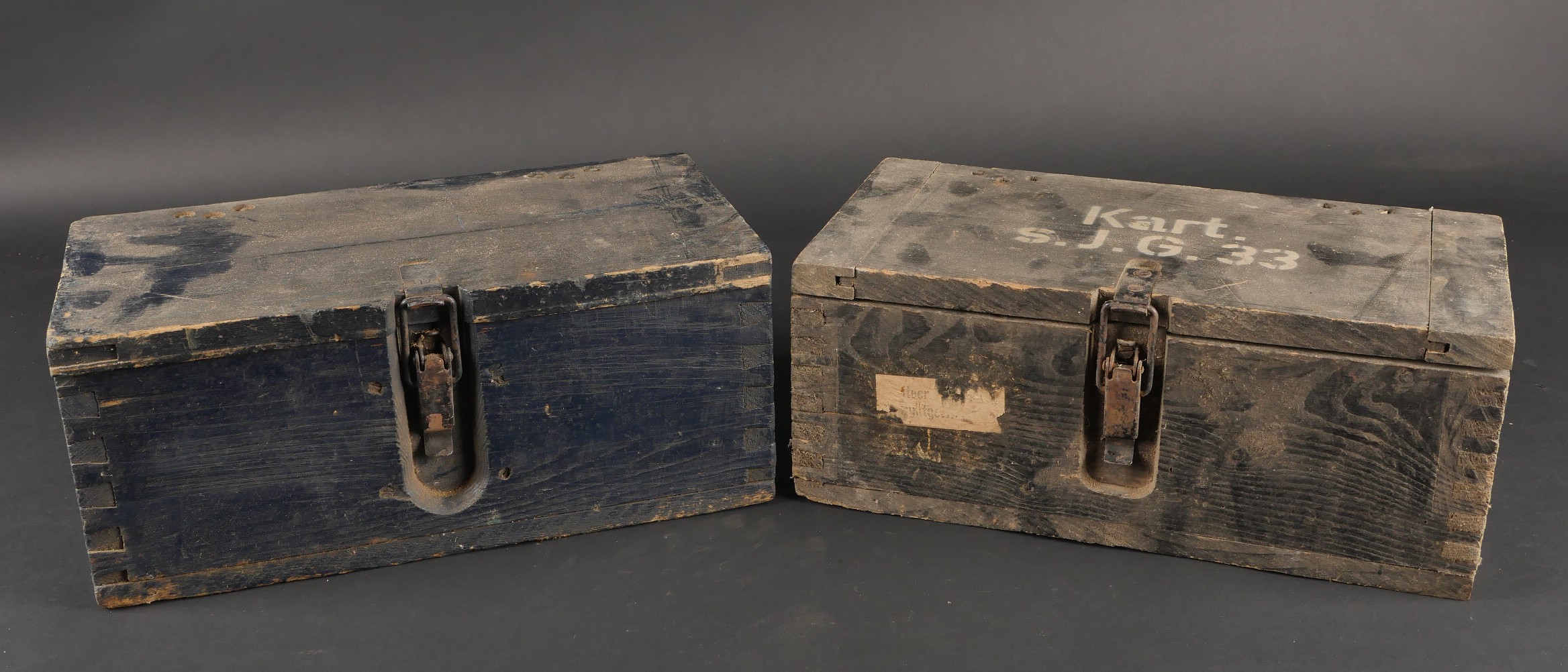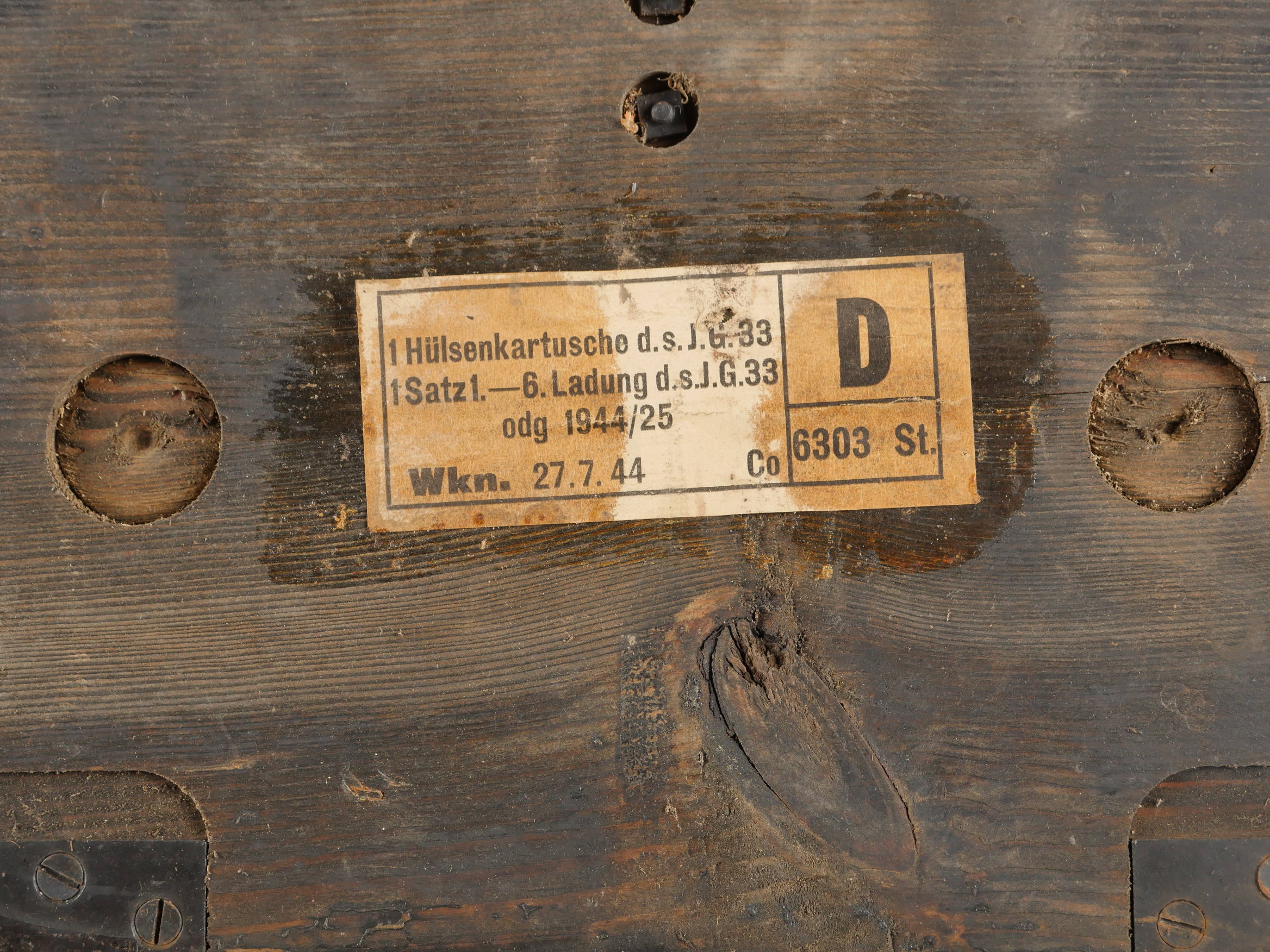 Caisses s.J.G33. Deux caisses en bois pour deux douilles de 15cm s.J.G.33.Une repeinte, l’autre avec ses marquages et étiquette d’origine datée 1944. Divers états de conservation.
