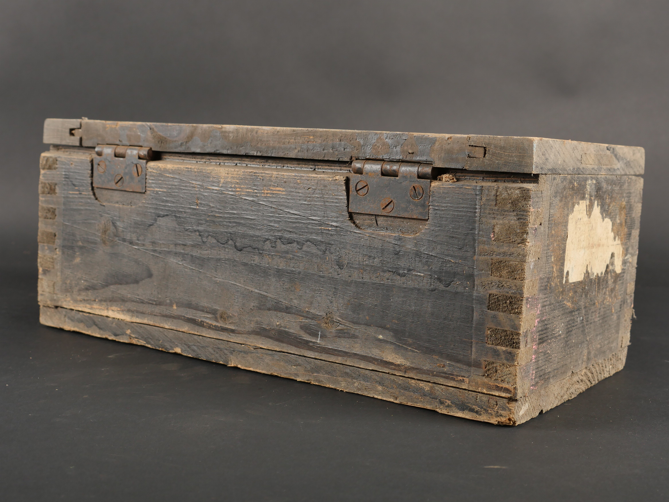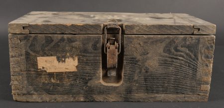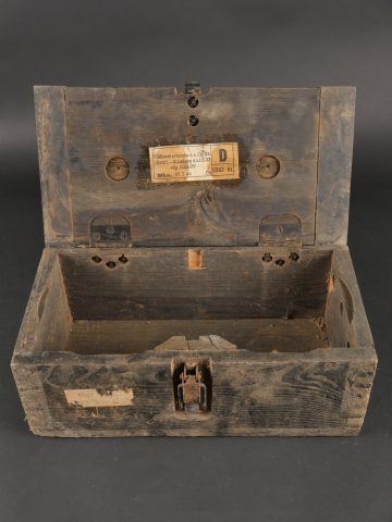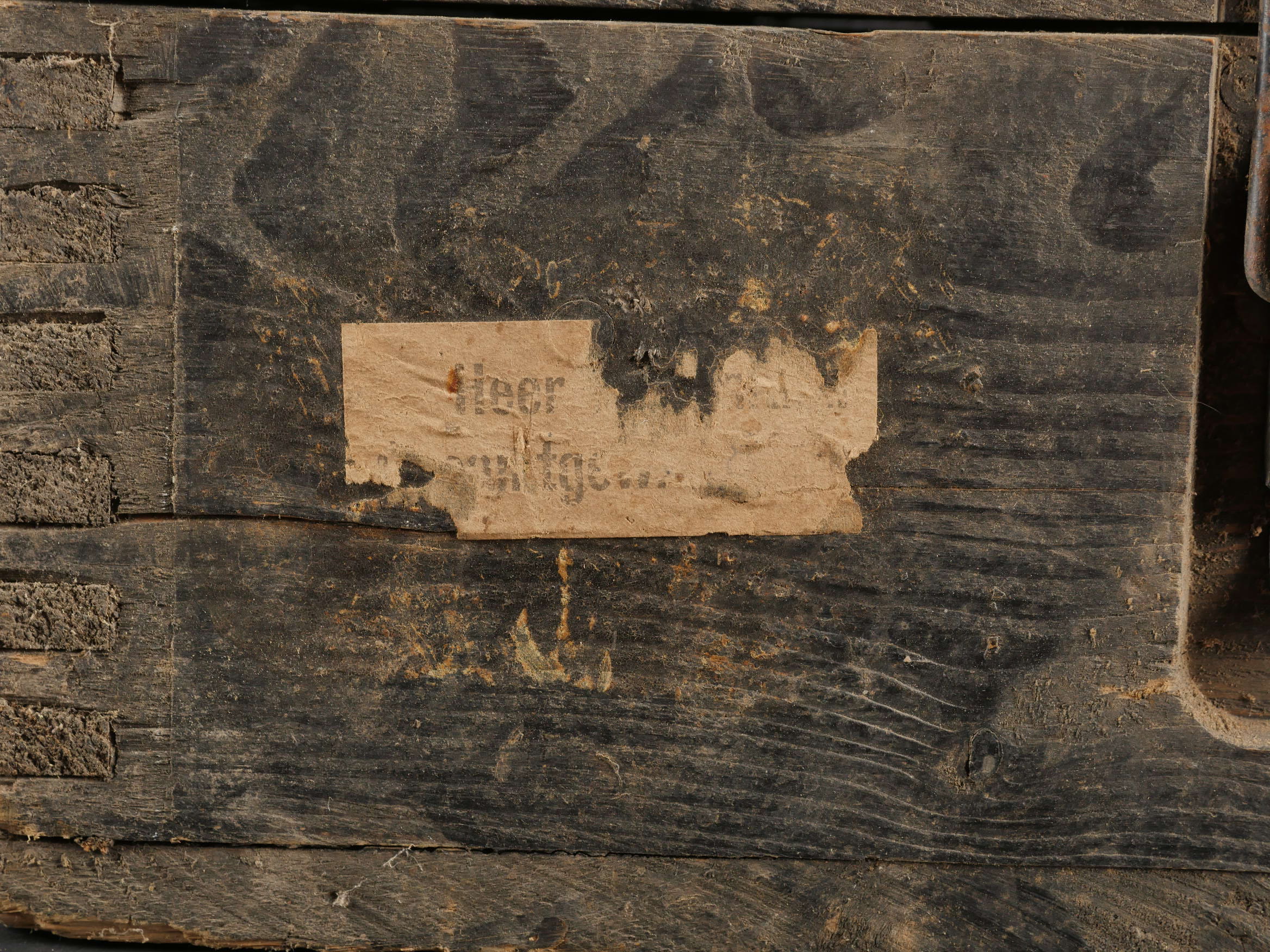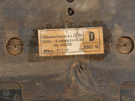 Détails de la vente >Caisses s.J.G33. Deux caisses en bois pour deux douilles de 15cm s.J.G.33.Une repeinte, l’autre avec ses marquages et étiquette d’origine datée 1944. Divers états de... en savoir plus