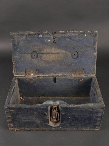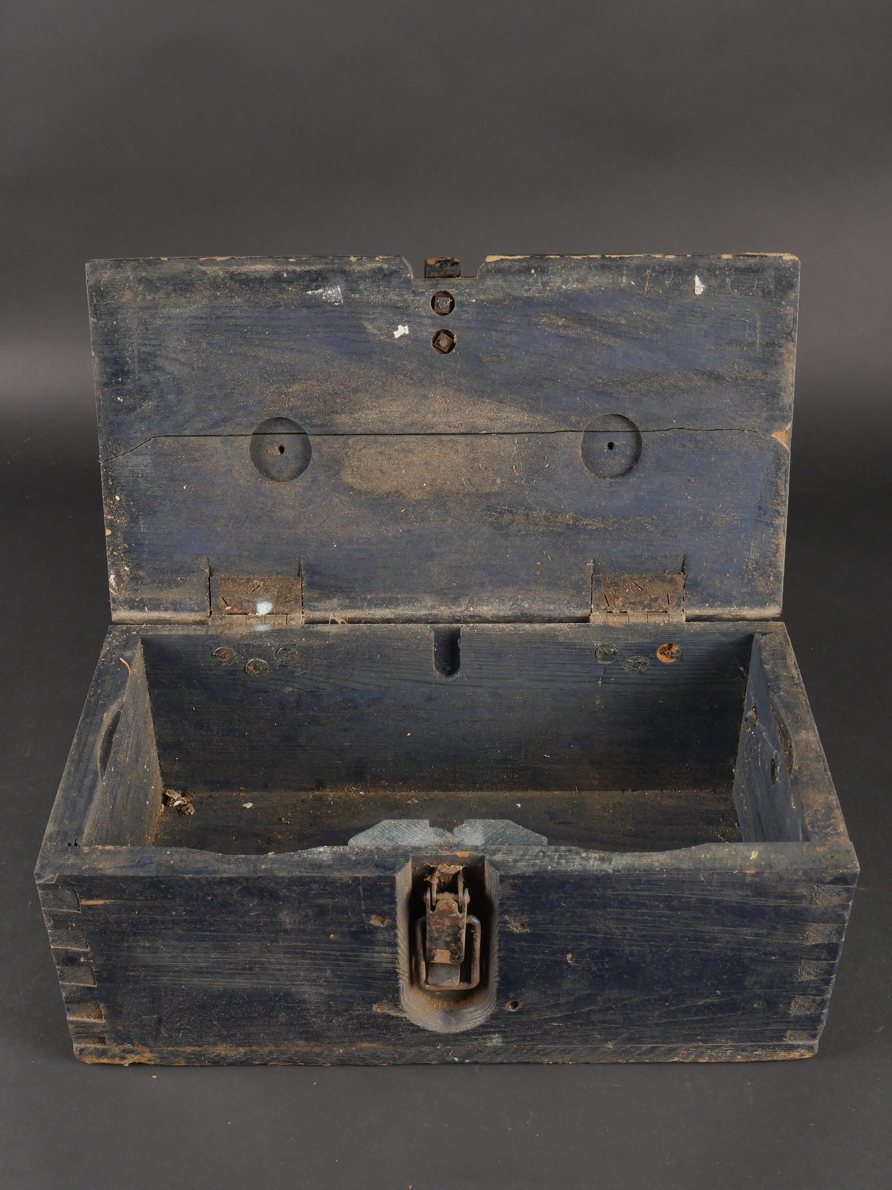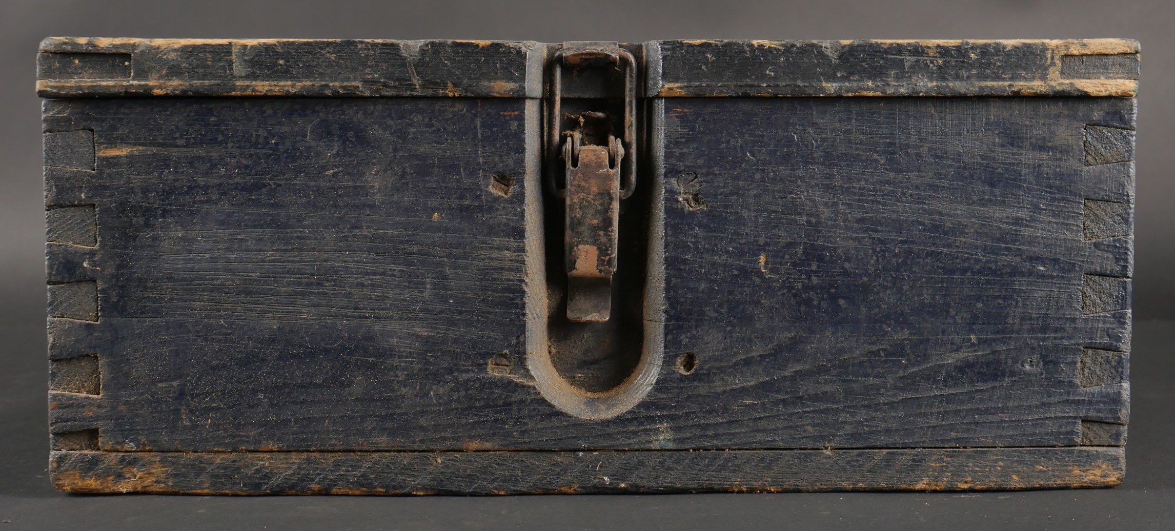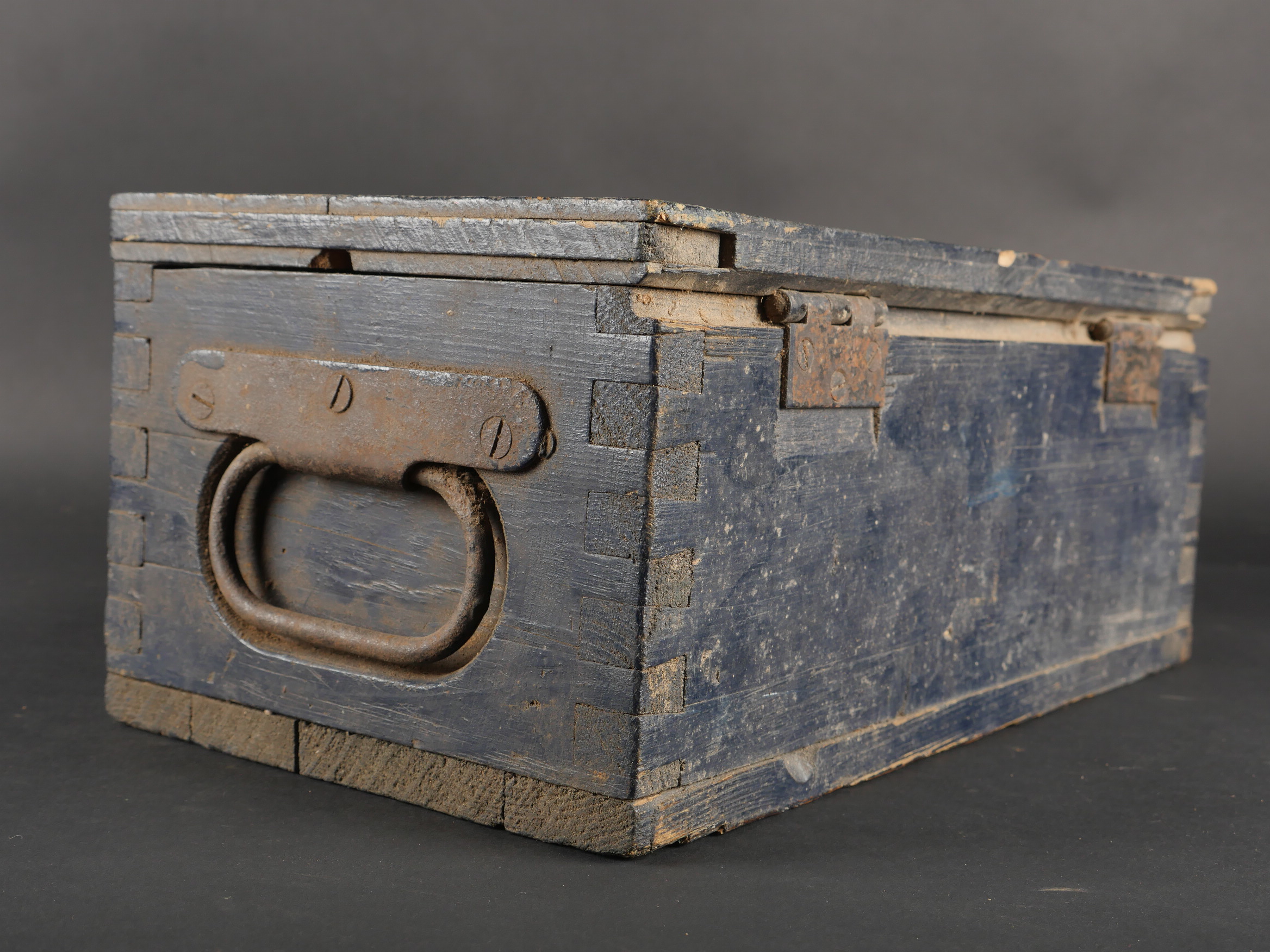 Détails de la vente >Caisses s.J.G33. Deux caisses en bois pour deux douilles de 15cm s.J.G.33.Une repeinte, l’autre avec ses marquages et étiquette d’origine datée 1944. Divers états de... en savoir plus