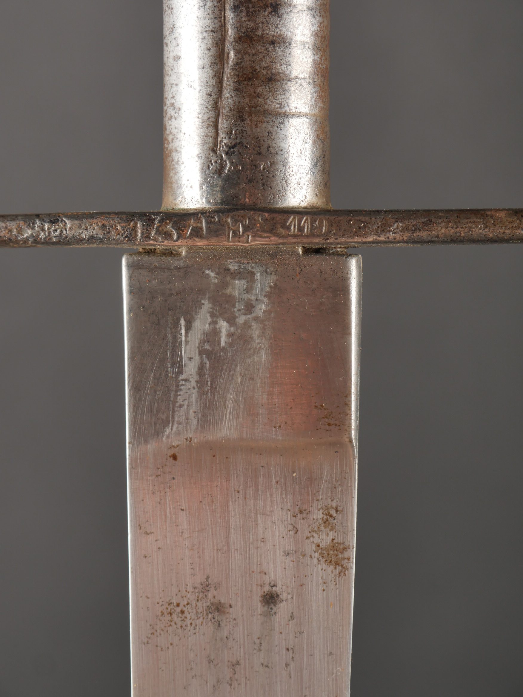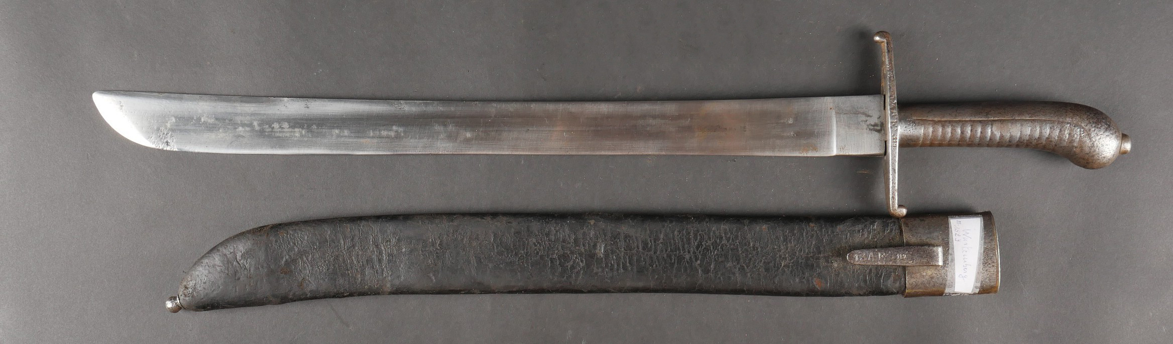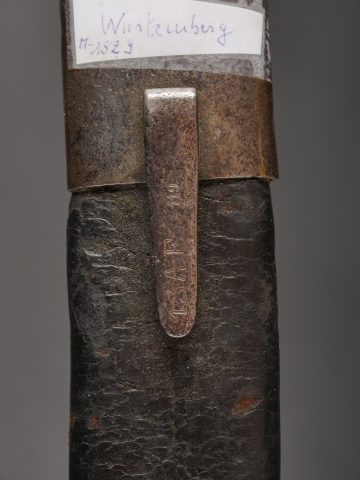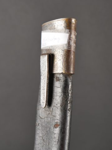 Glaive du Württemberg M1827. Poignée moulée, garde et fourreau marqués du 13e régiment d’artillerie. Lame fortement polie, le seul marquage encore visible est une lettre G. Usure et patine