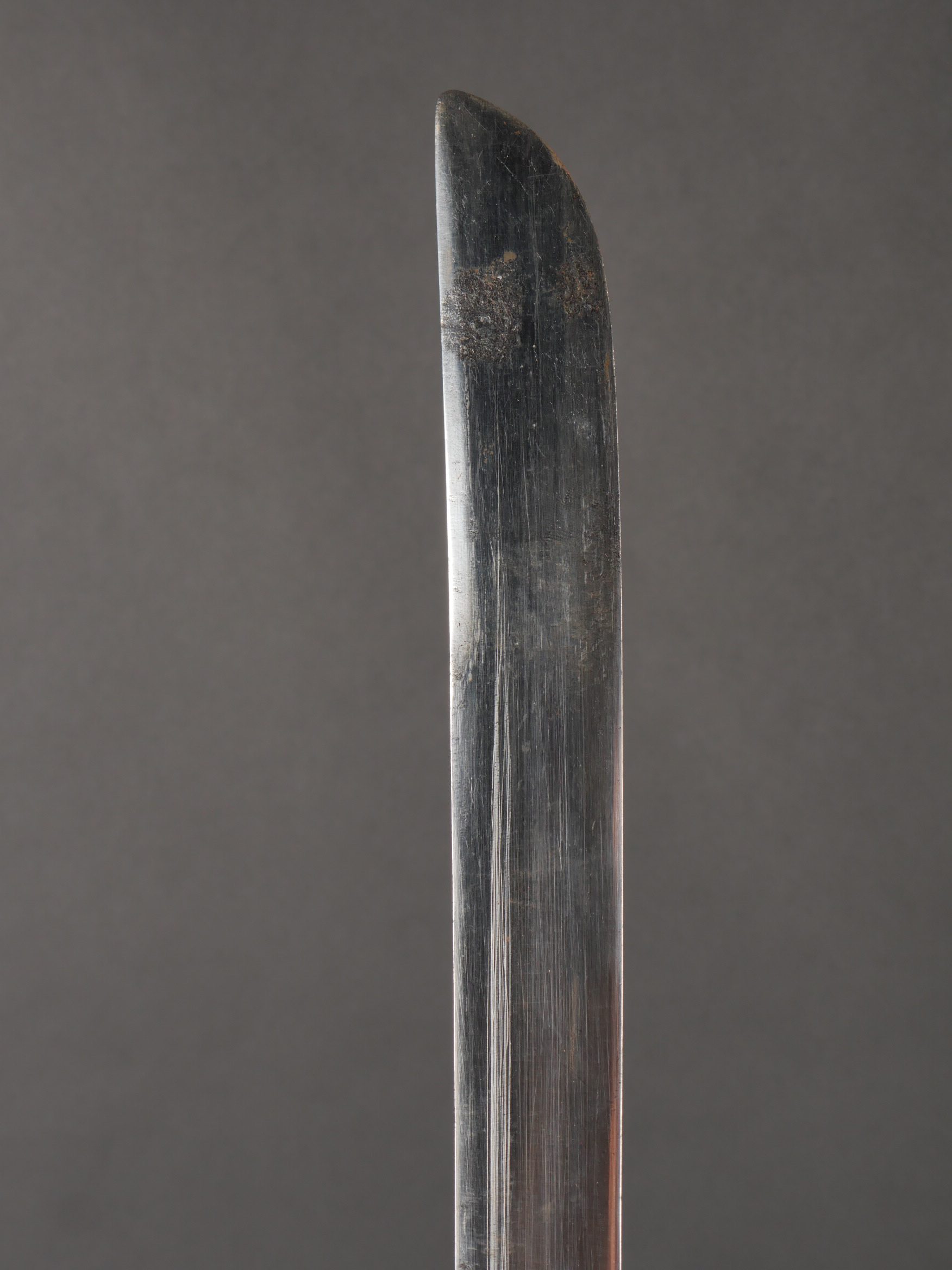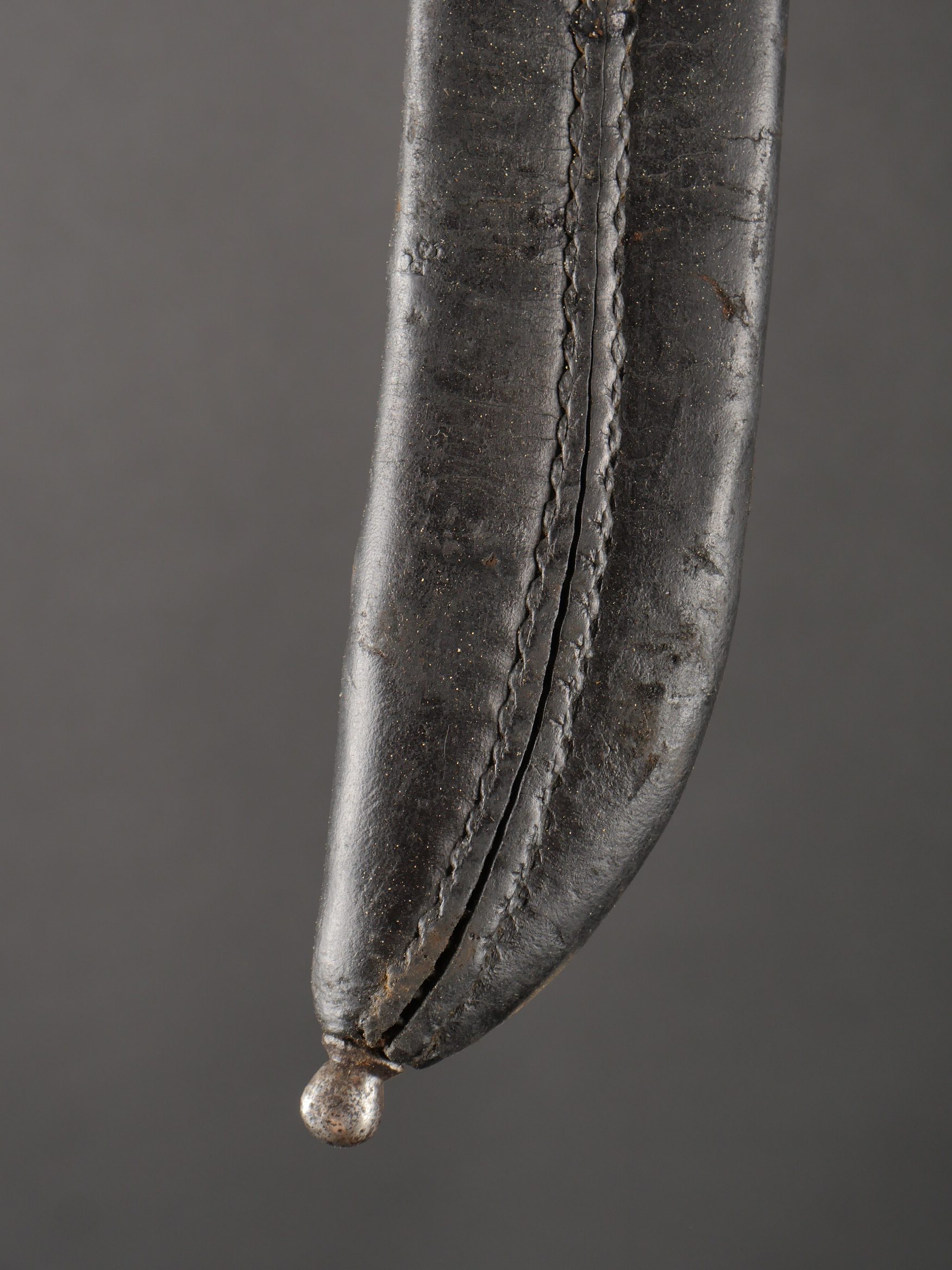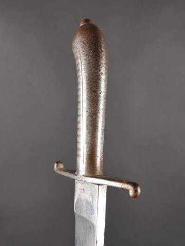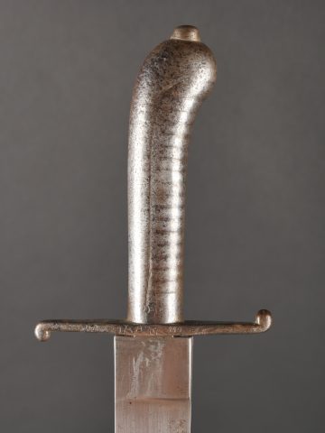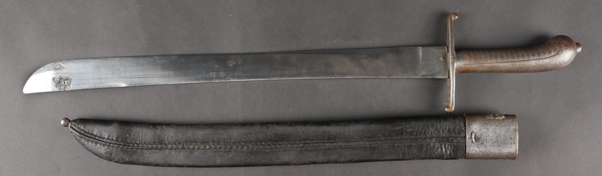 Glaive du Württemberg M1827. Poignée moulée, garde et fourreau marqués du 13e régiment d’artillerie. Lame fortement polie, le seul marquage encore visible est une lettre G. Usure et patine