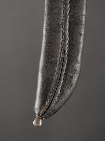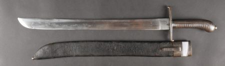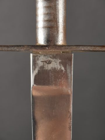 Détails de la vente >Glaive du Württemberg M1827. Poignée moulée, garde et fourreau marqués du 13e régiment d’artillerie. Lame fortement polie, le seul marquage encore visible est une lettre G. Usure et... en savoir plus