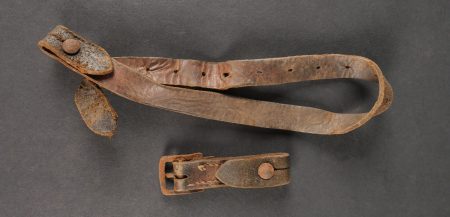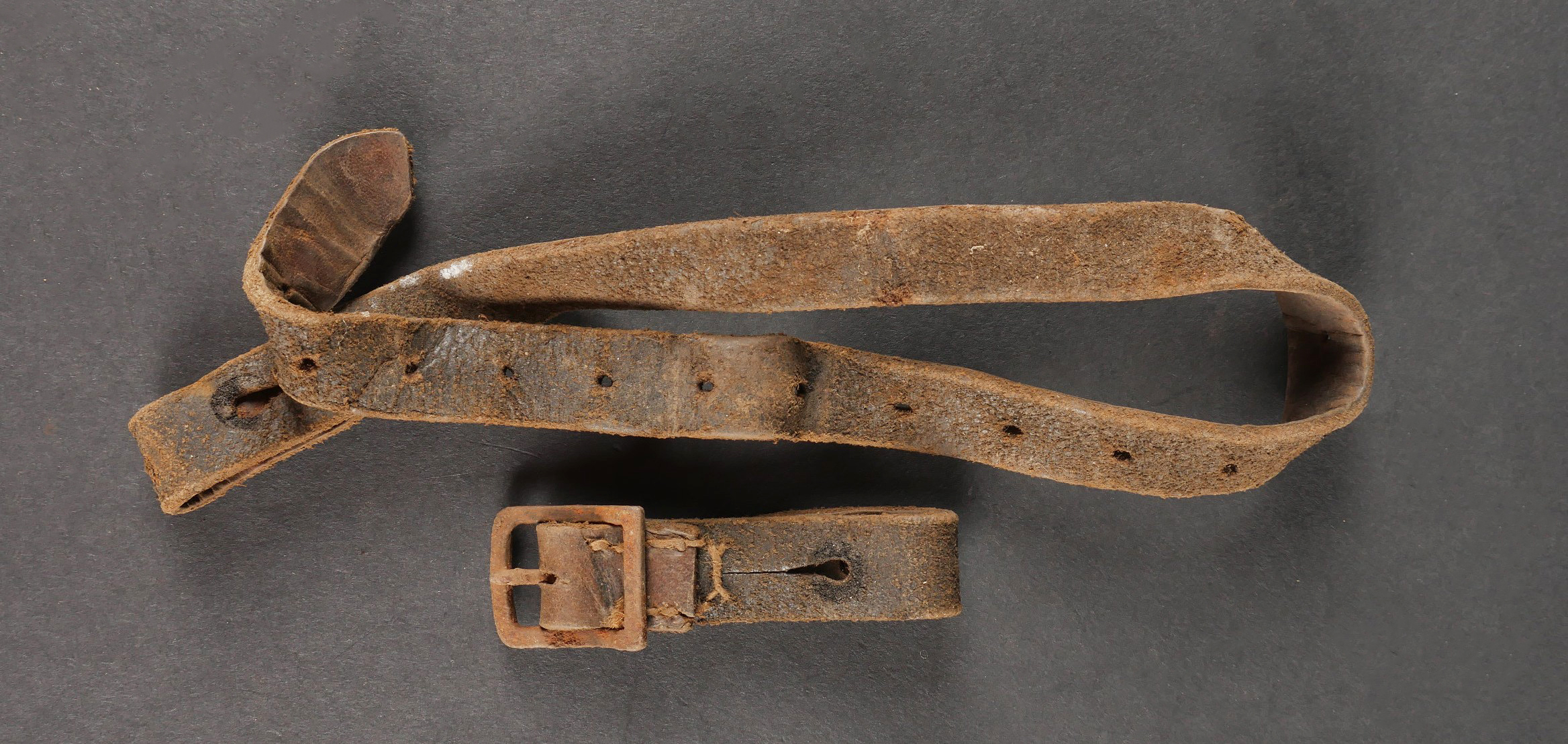 Jugulaire de casque allemand. Boucle en fer, complète dans sa longueur, pas de marquage visible.