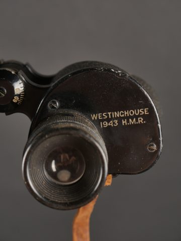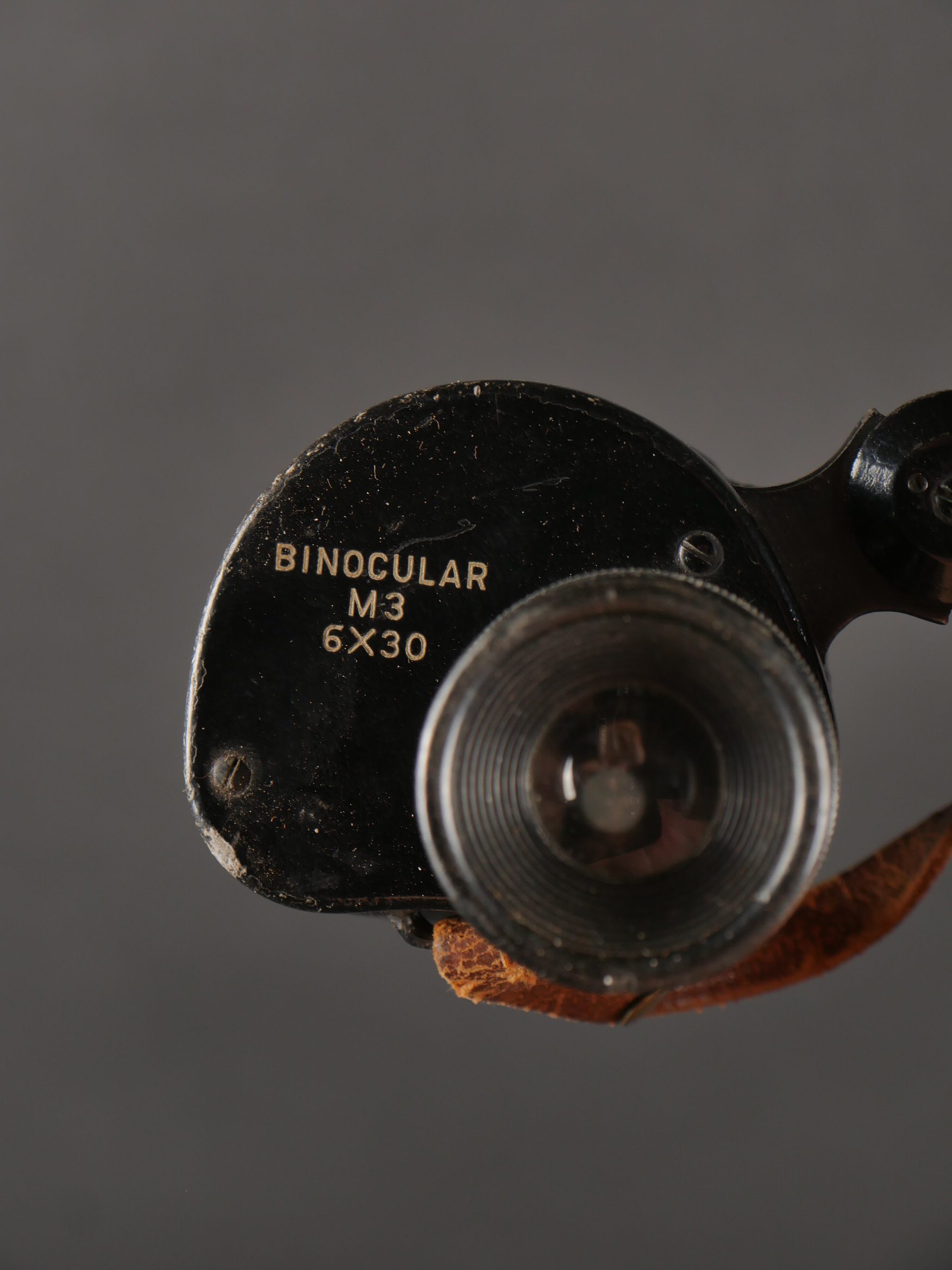 Jumelles US. Jumelles M3 datées 1943 de fabrication Westinghouse, sangle en cuir présente. Dans leur étui en cuir brun, couvercle désolidarisé.