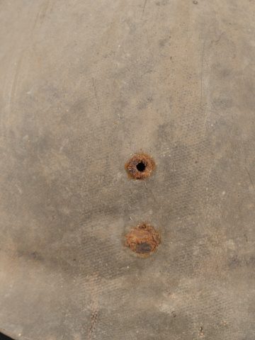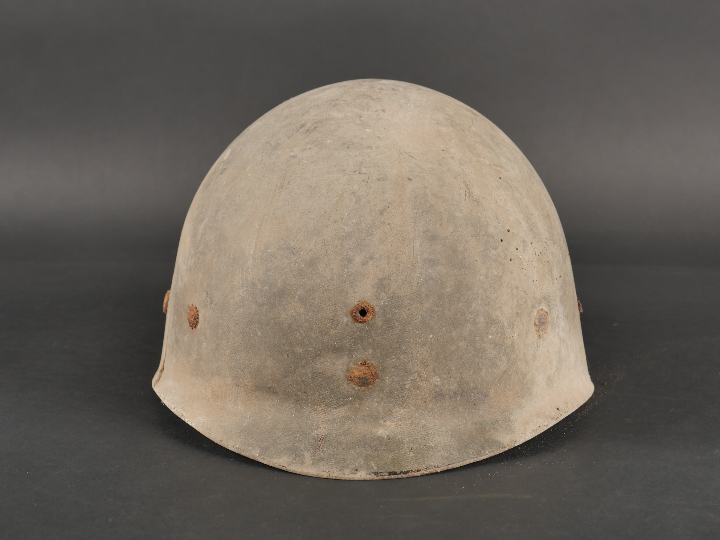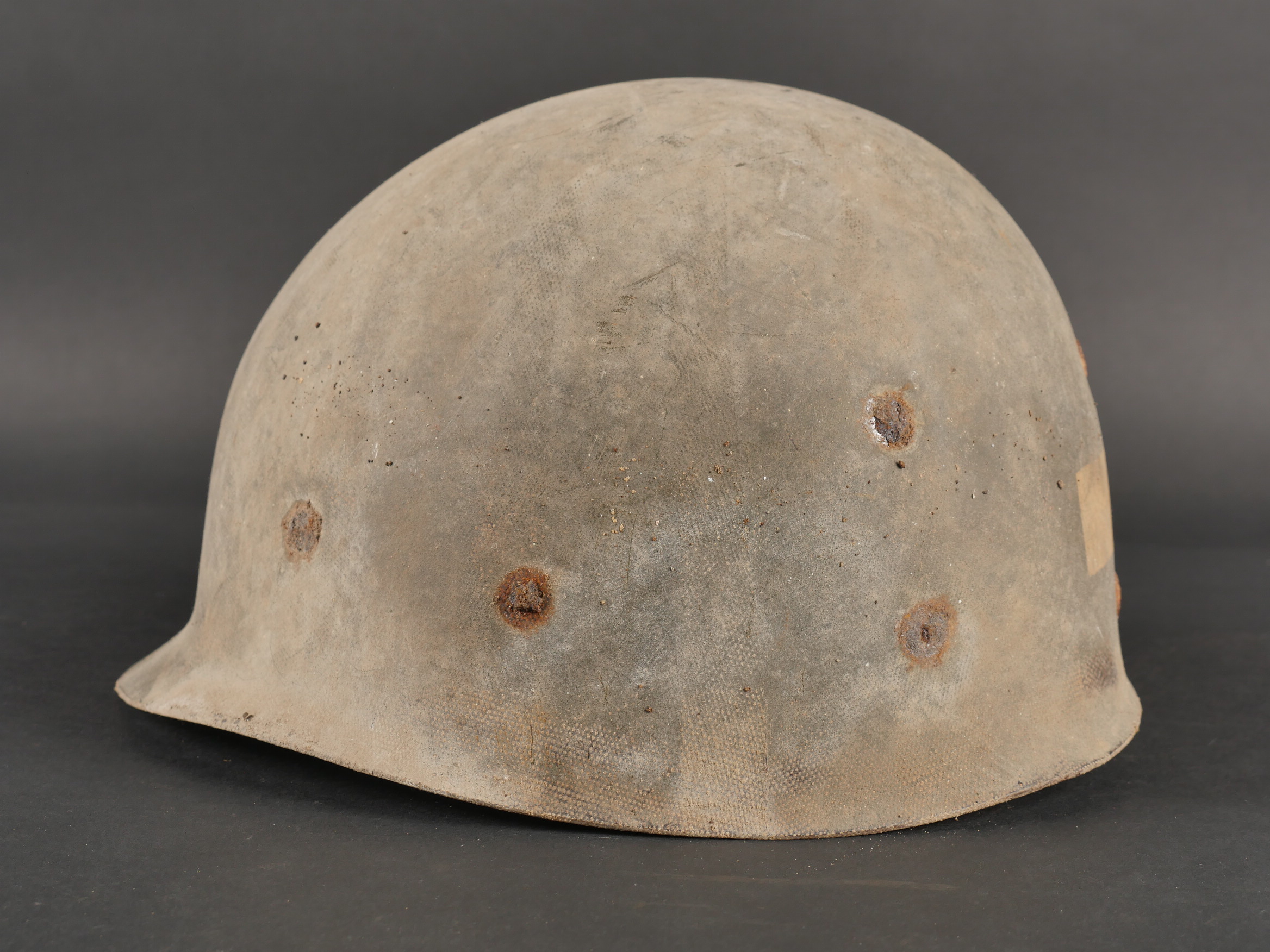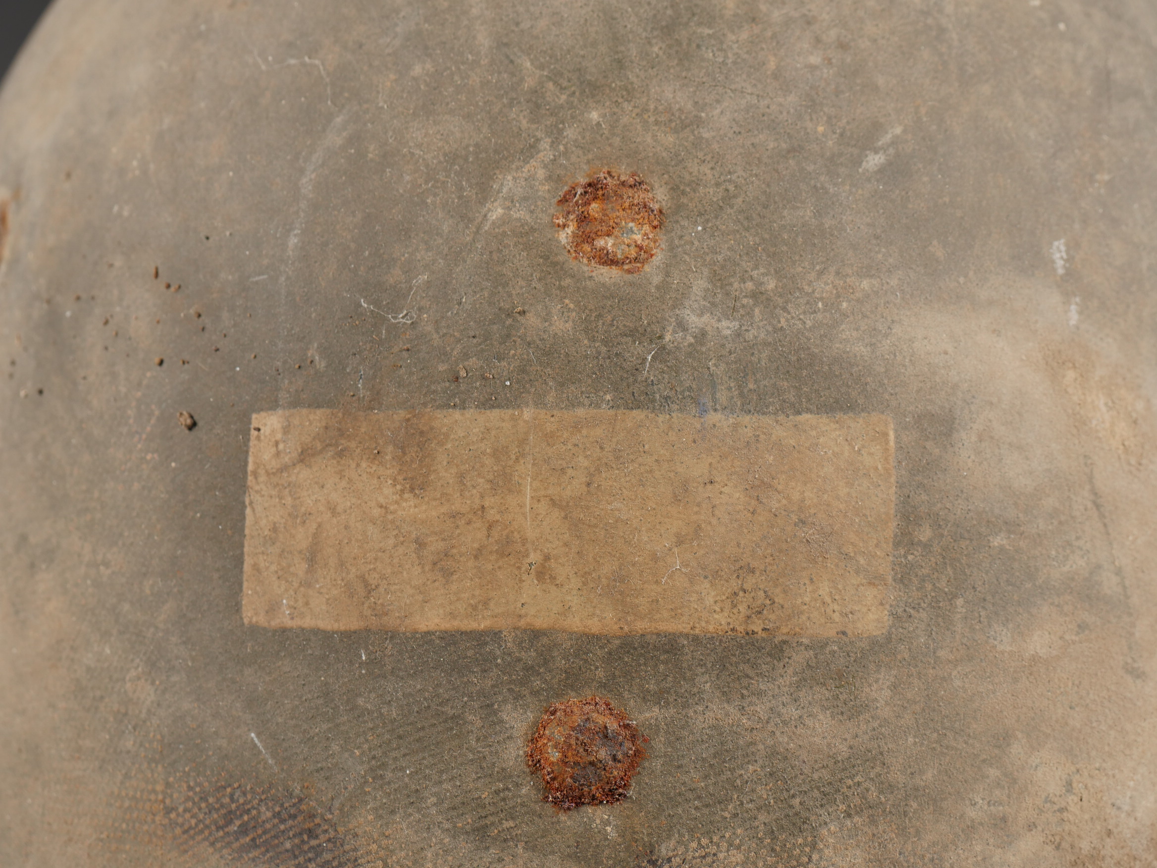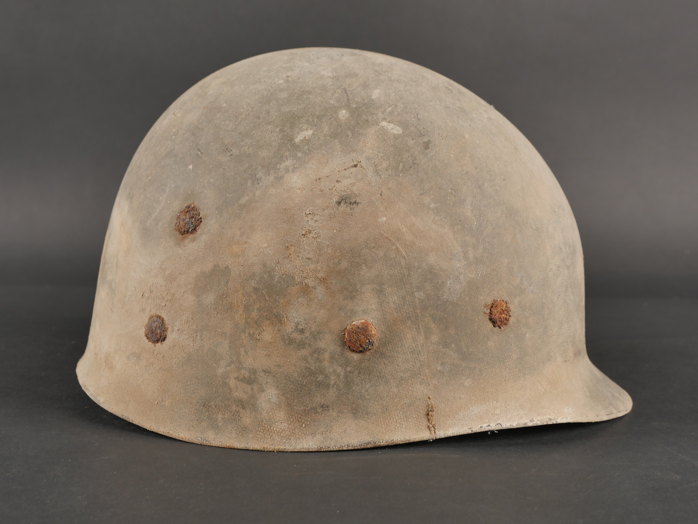 Liner de casque M1 sous officier. Beau sous casque pour coque M1 conservant une bonne partie de sa suspension toile d’origine, washers en acier peints en vert. Belle barre de sous officier peinte à l’arrière.