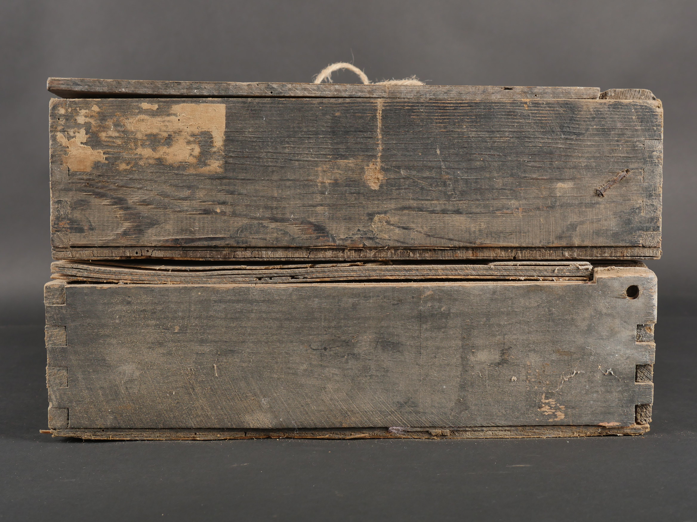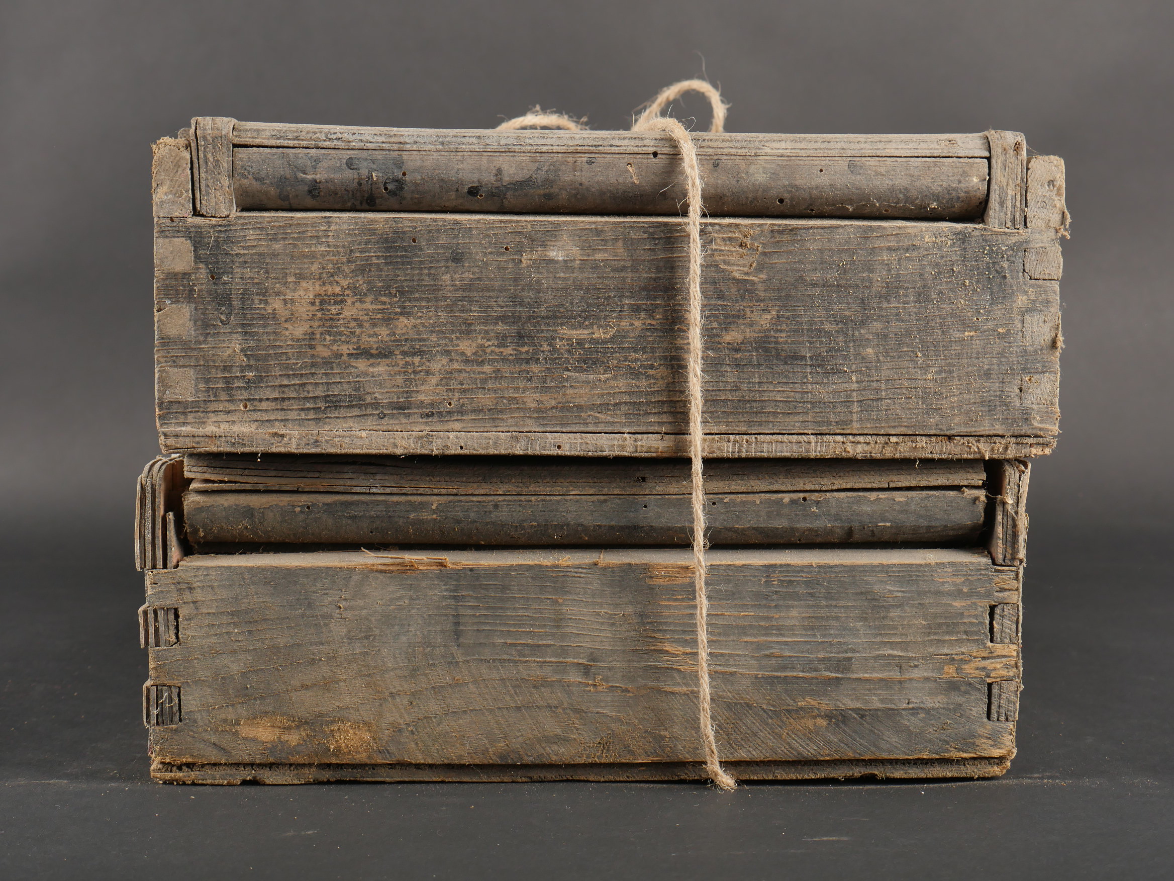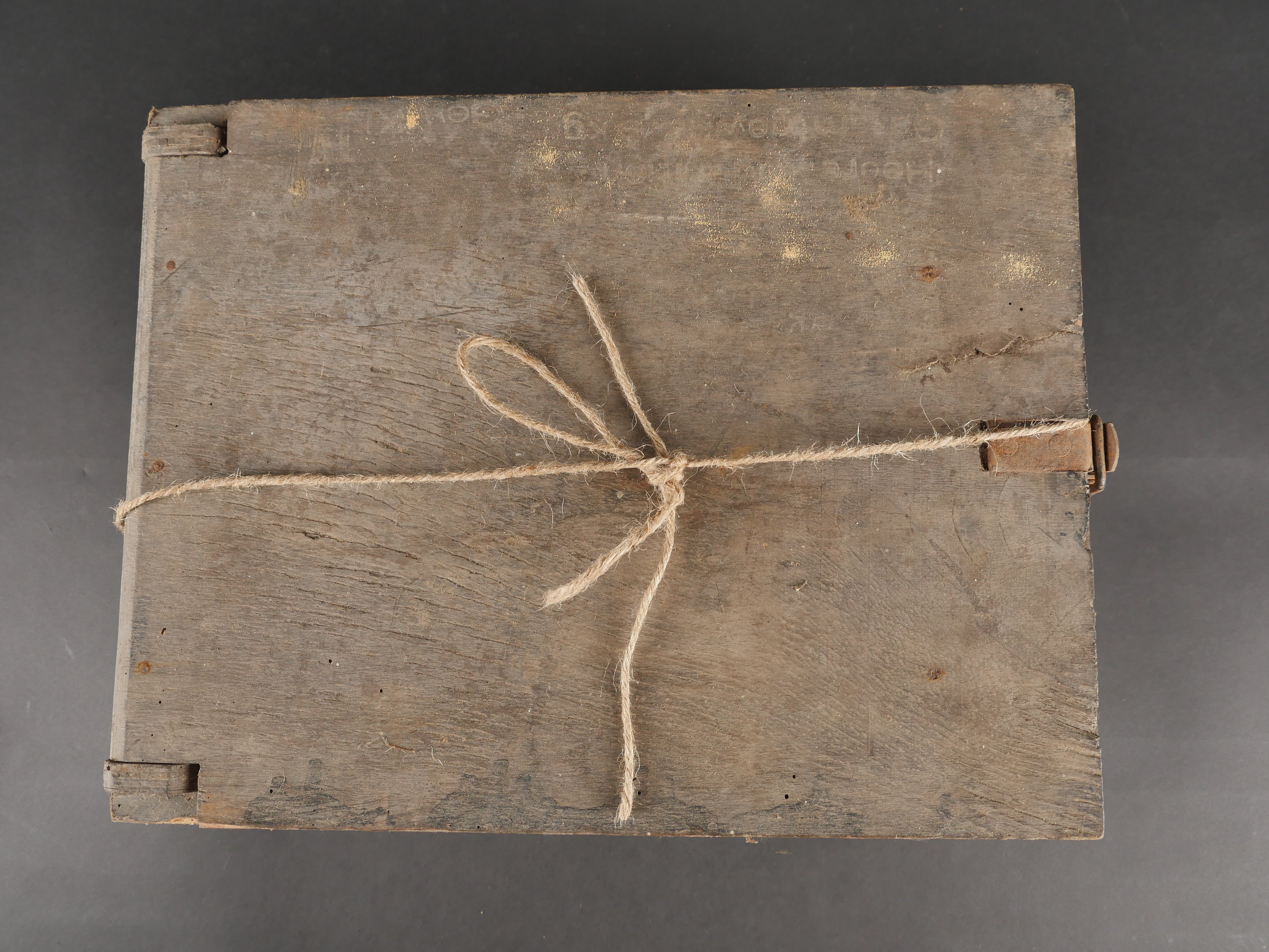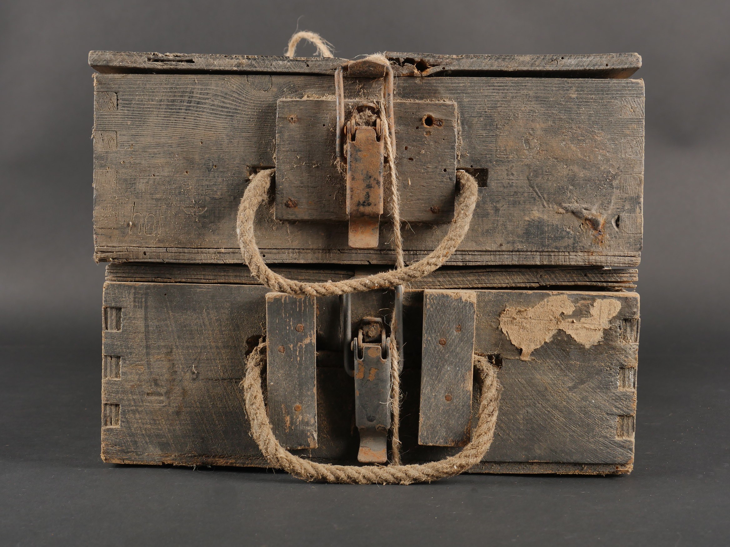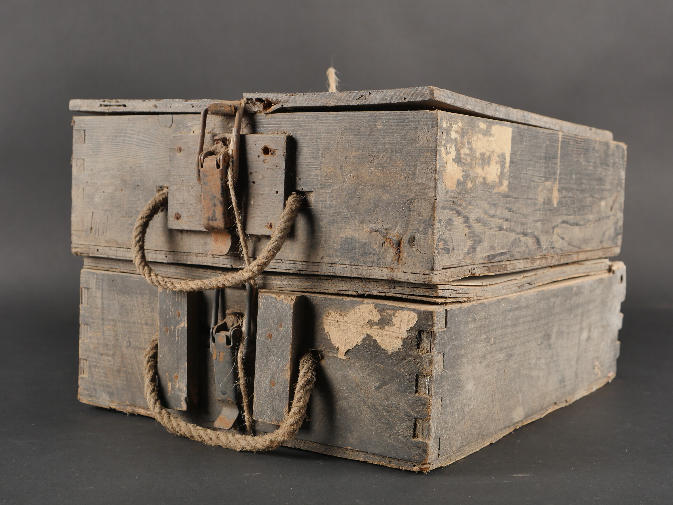 Détails de la vente >Lot de 2 caisses allemandes 8cm Wurfgranaten 39. Caisse bois peinte en vert, une avec cales et restes d’étiquette, l’autre sans cale avec 2 belles étiquettes