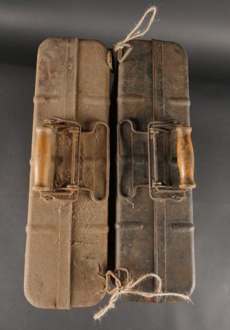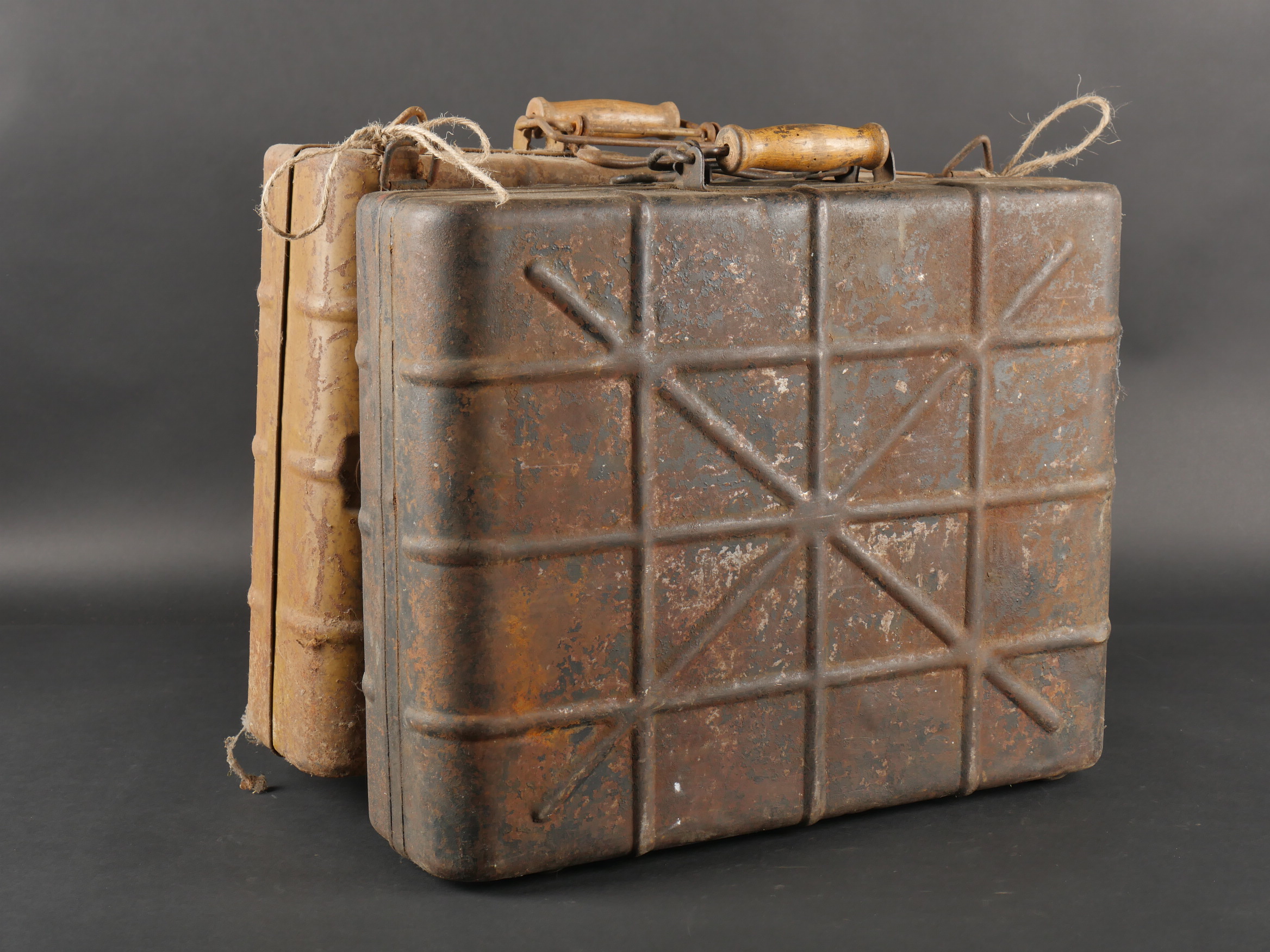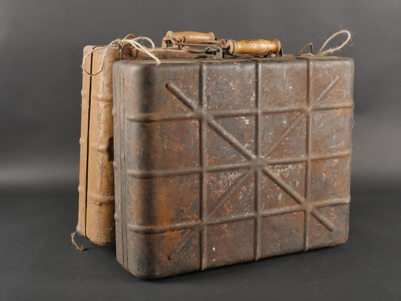 Lot de 2 valises pour grenades à manche. Une peinte couleur sable, à nettoyer, bel intérieur avec marquage für Tropen et étiquette. L’autre vert foncé, intérieur bleu. Les deux sans leurs racks. Usure, patine